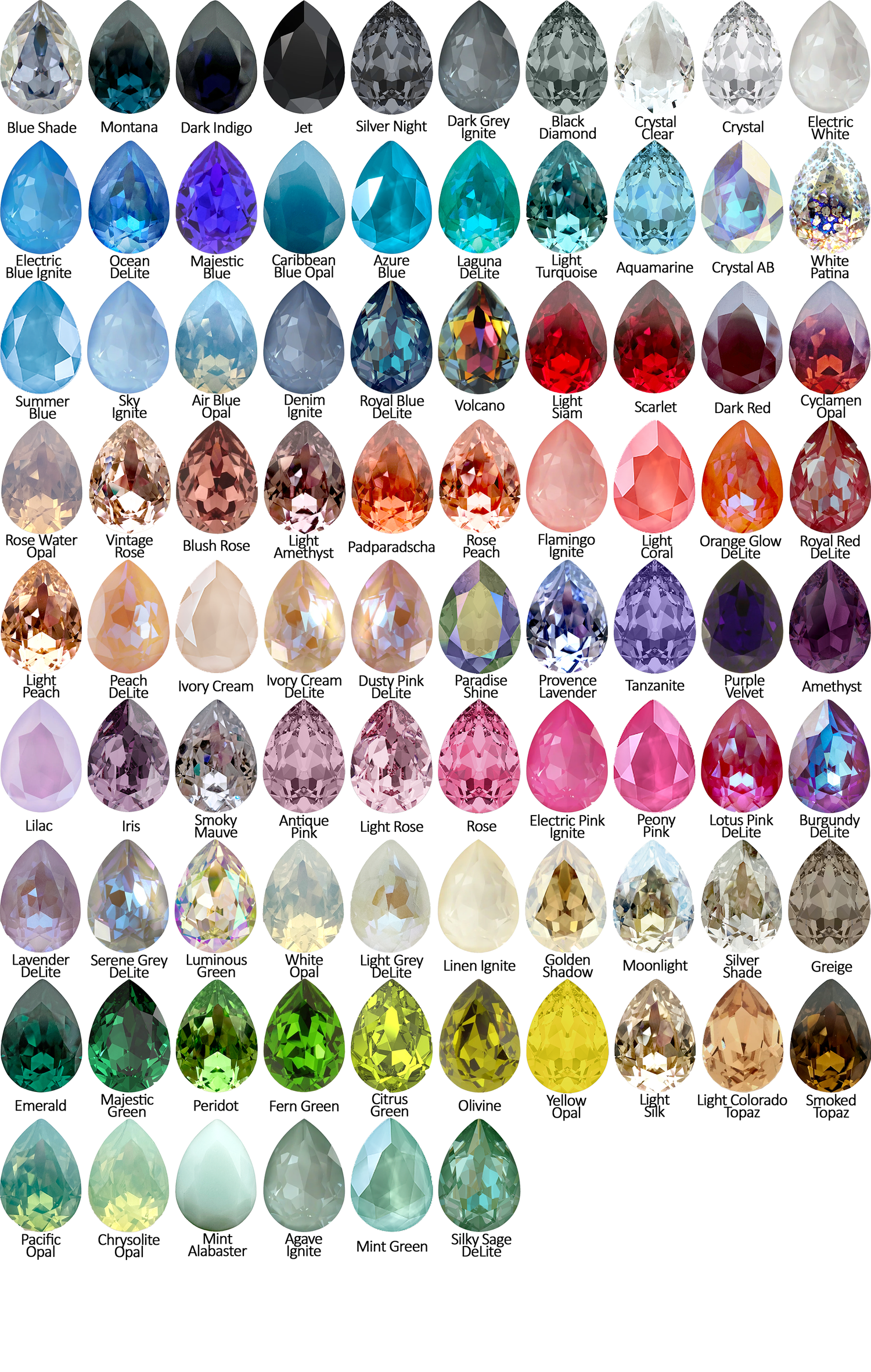 Heatherly Jewelry is handmade to order. Below is a list of crystal colors offered in various shapes and sizes. Not all colors are available in all shapes.