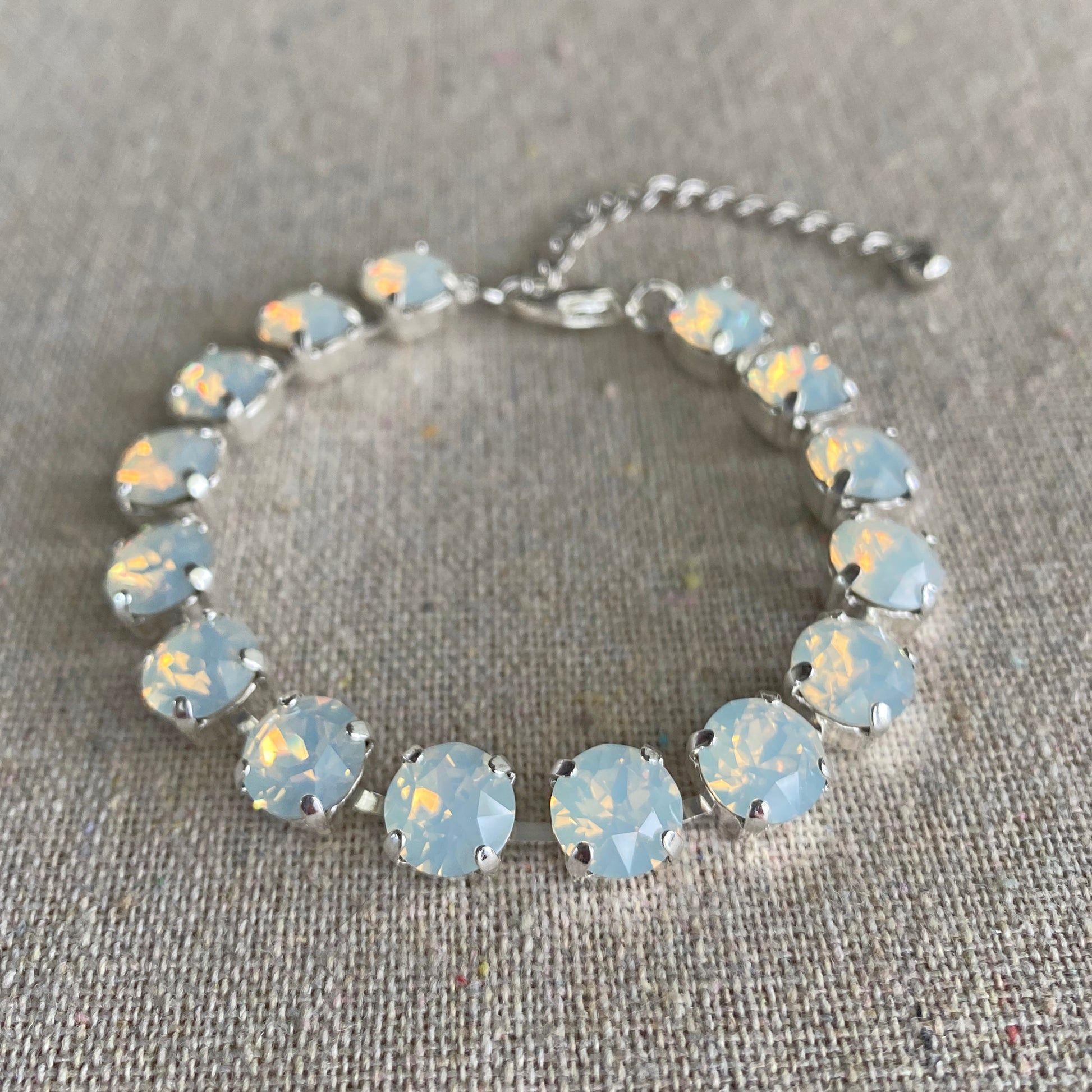Your ideal bracelet for customizing your color and finish for your big day or if you're someone who loves lots of sparkle. Xirius 8mm chaton Swarovski® crystals set in a tennis style bracelet complete with a chain extender for the perfect custom fit.