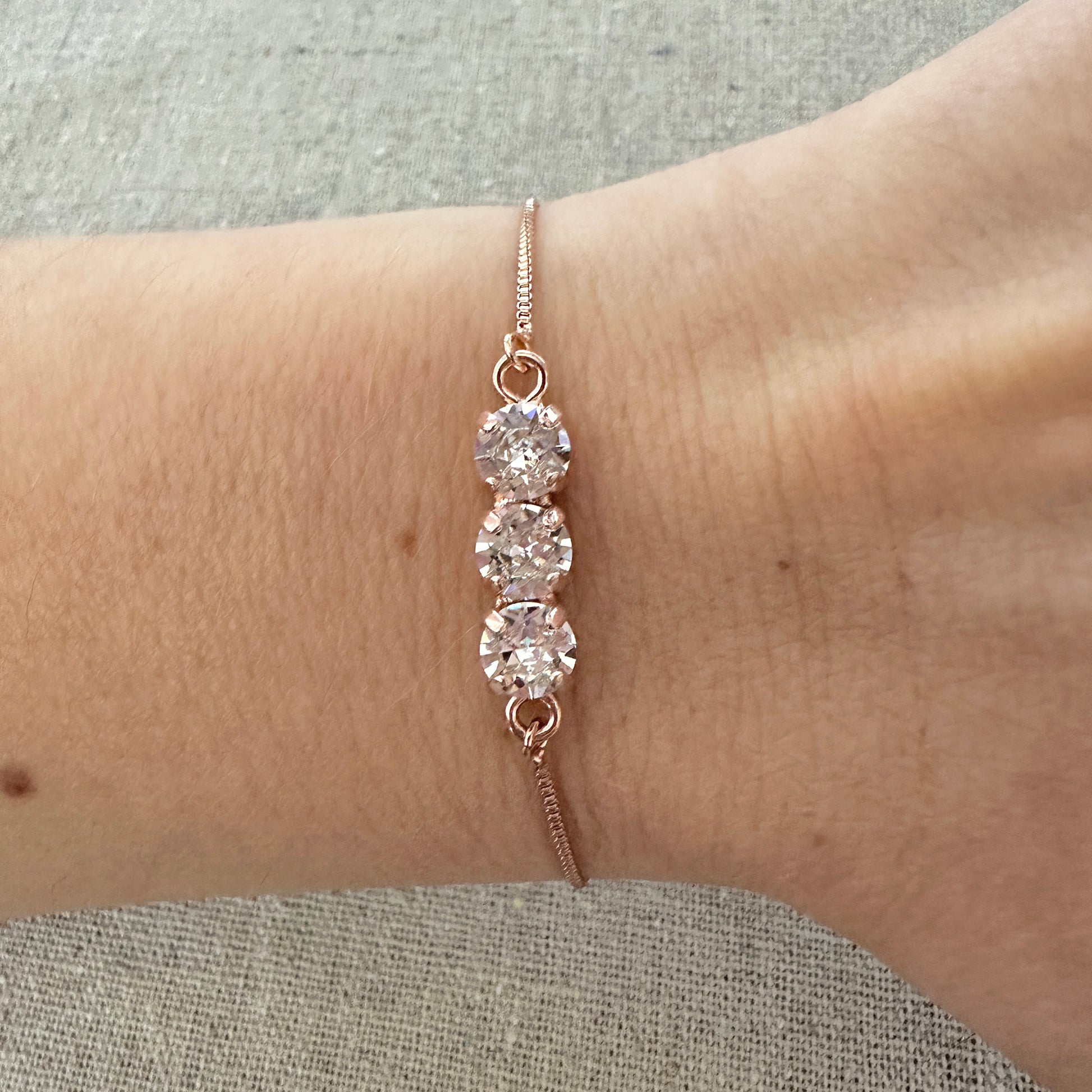 The best easy-on, easy-off bracelet because of the sliding bolo. A chic bar charm made with Swarovski® crystal Xirius chatons connected to box chain with 2 small clear crystals at the tail.