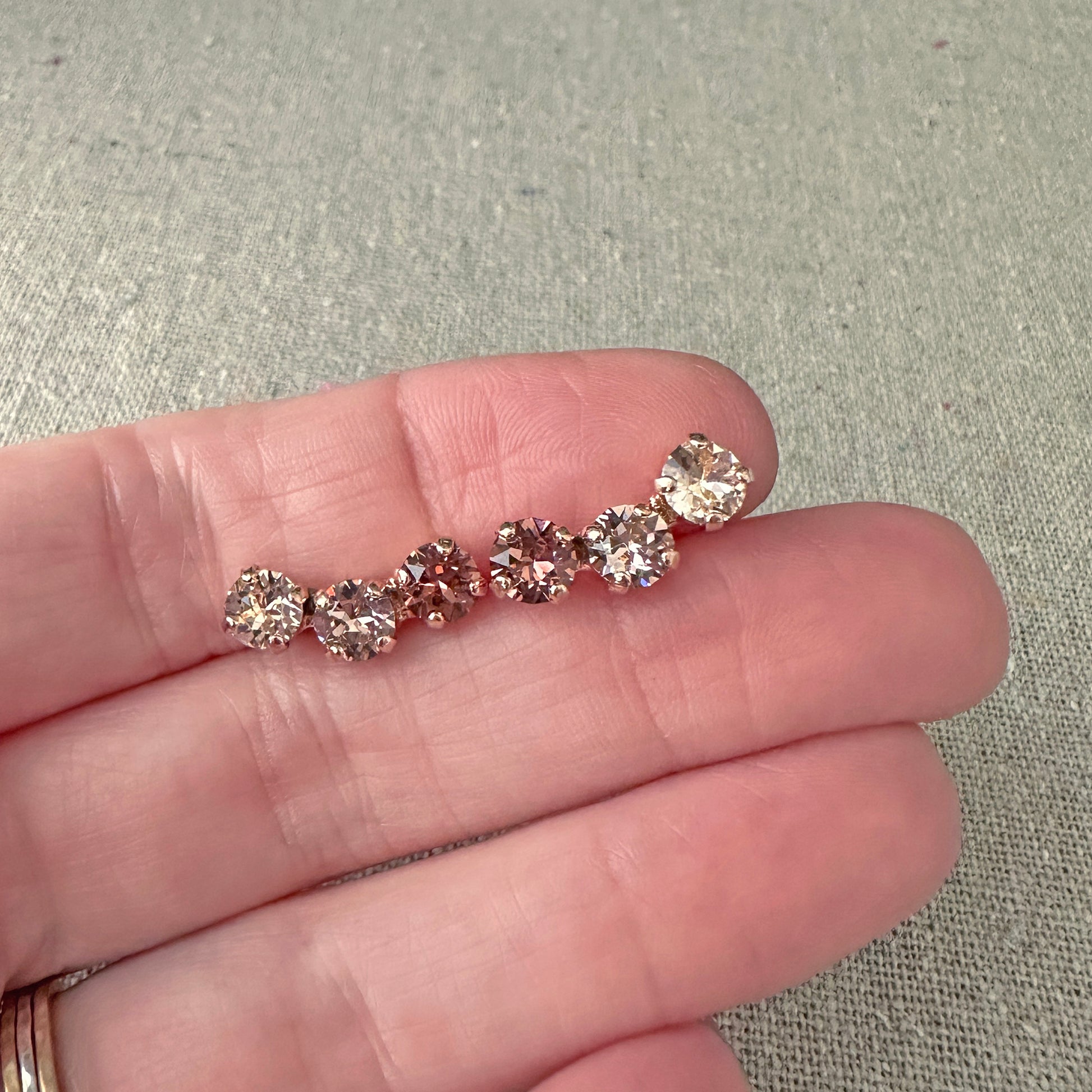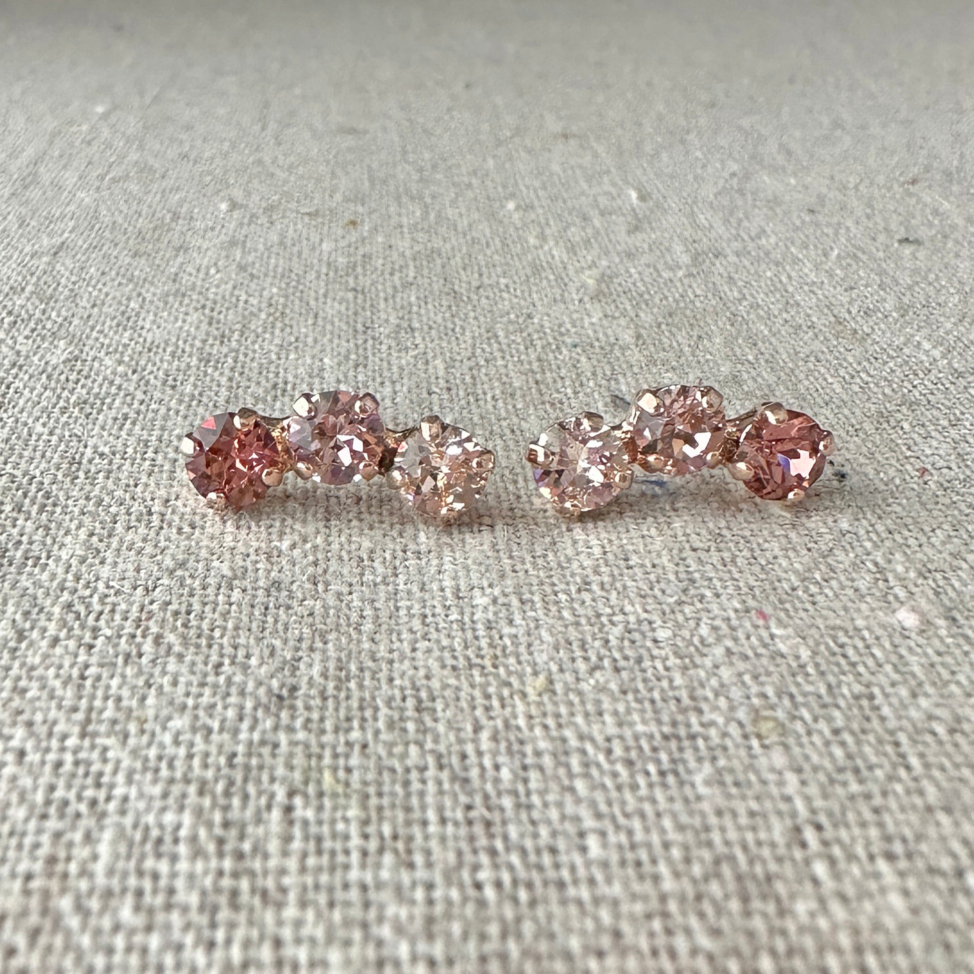 It really doesn't get cuter than these ear climbers in the ease of a post. A trifecta of sparkling Xirius cut Swarovski® crystals are set in brass earrings that are plated with a surgical steel post. Shown in blush ombré and rose gold finish.