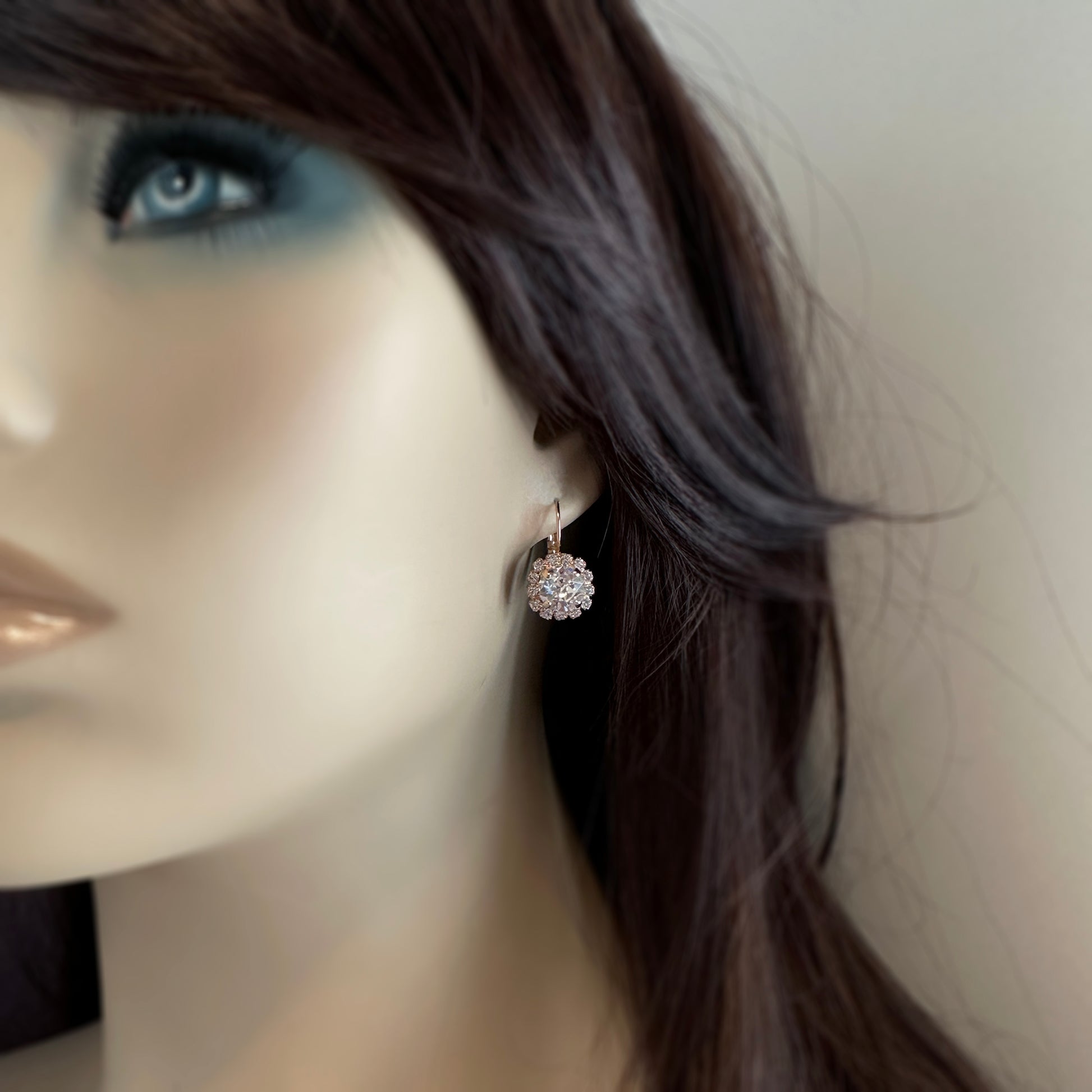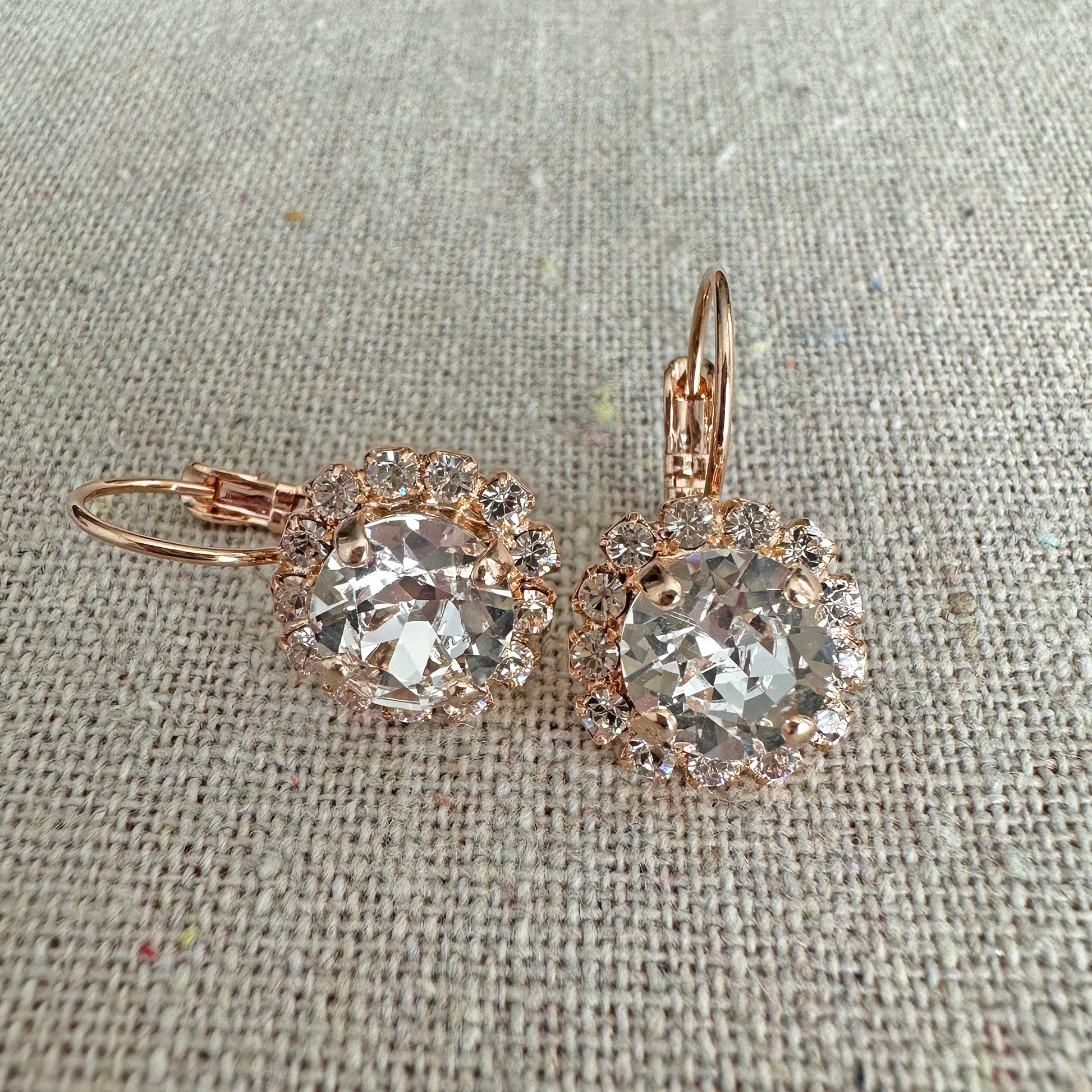 An elegant touch to any dress these earrings are perfect for brides looking for a minimalist look with a modest length of dangle. This design is also ideal for bridesmaid gifts as the center Swarovski® crystal color is chosen by you and can be customized to match nearly any wedding party colors. The surrounding halo of smaller crystals will remain plain crystals. Shown in crystal in the rose gold finish.