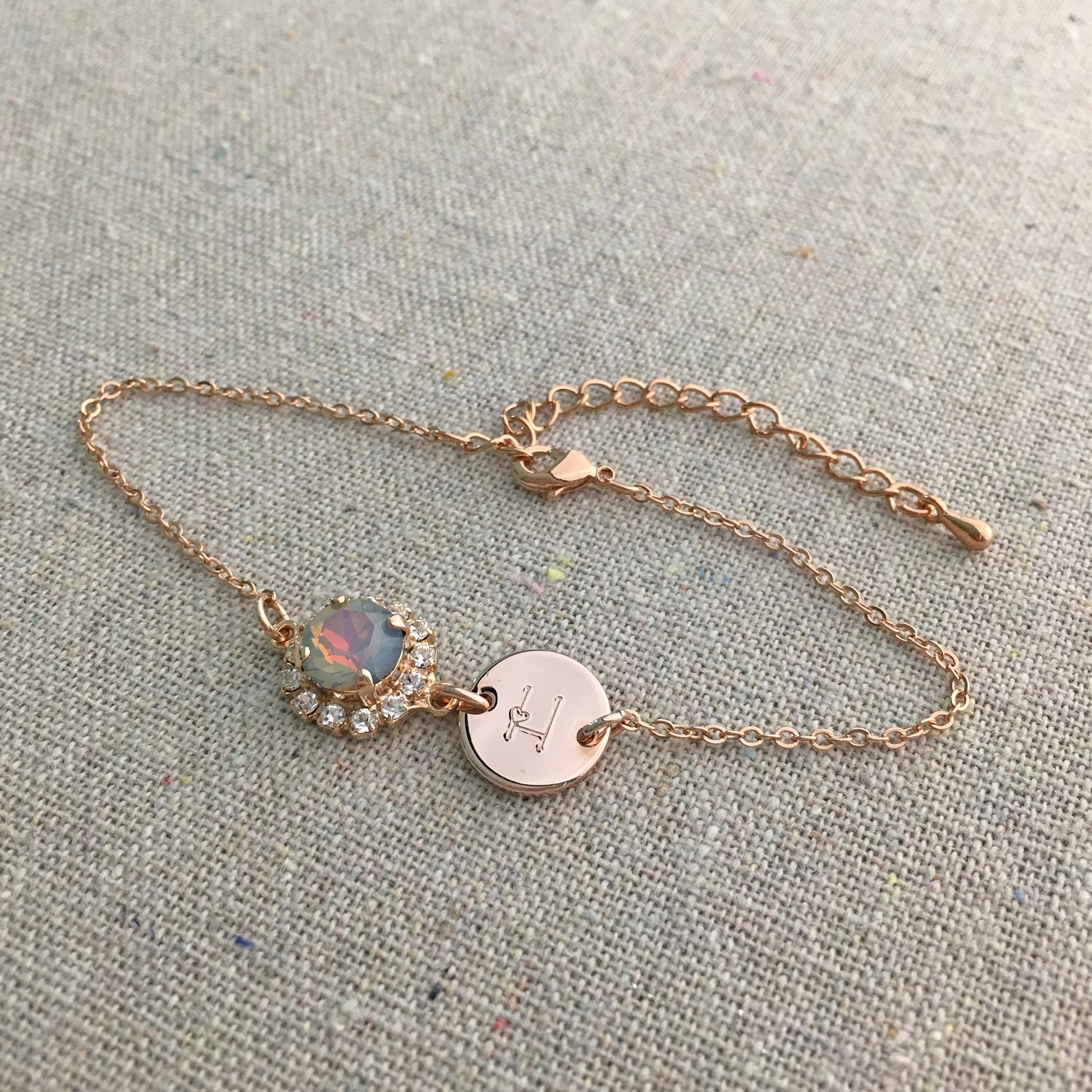 A Swarovski® crystal in your color choice, surrounded by a halo of small clear crystals connects to a monogram charm and is finished off by a shiny and sparkly cable chain. The bracelet is adjustable. Shown in white opal volcano and rose gold.