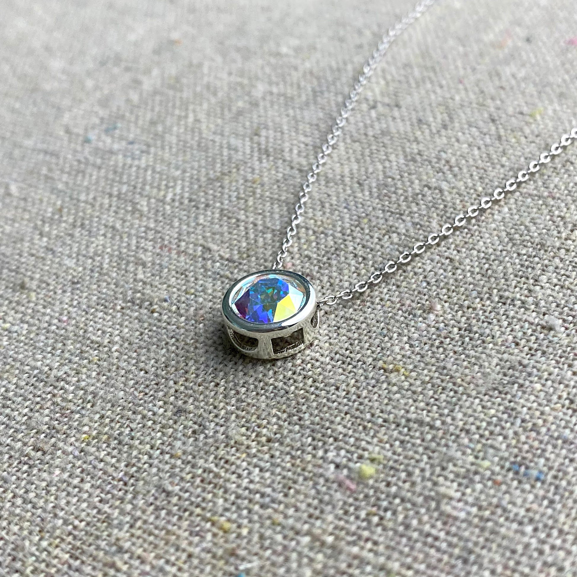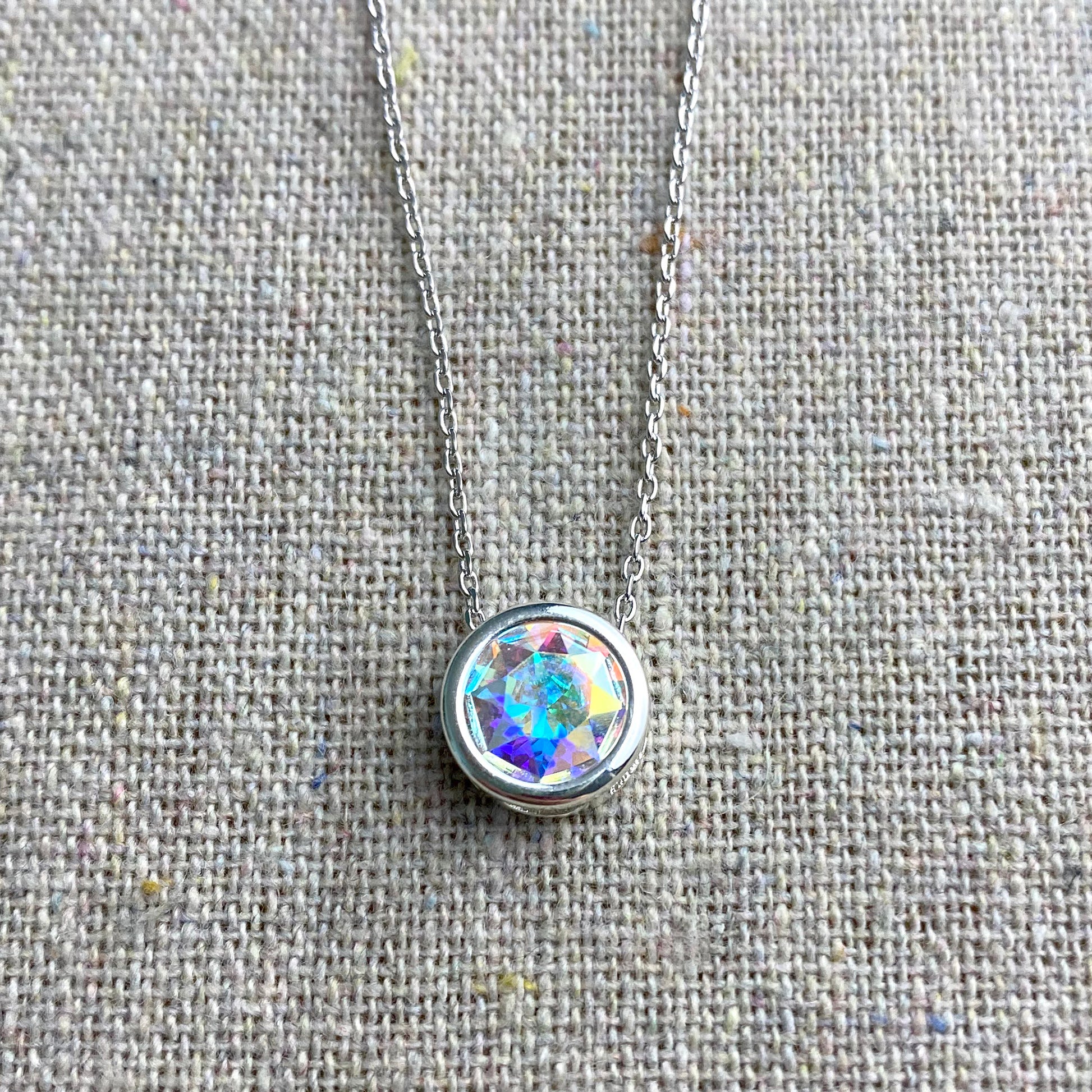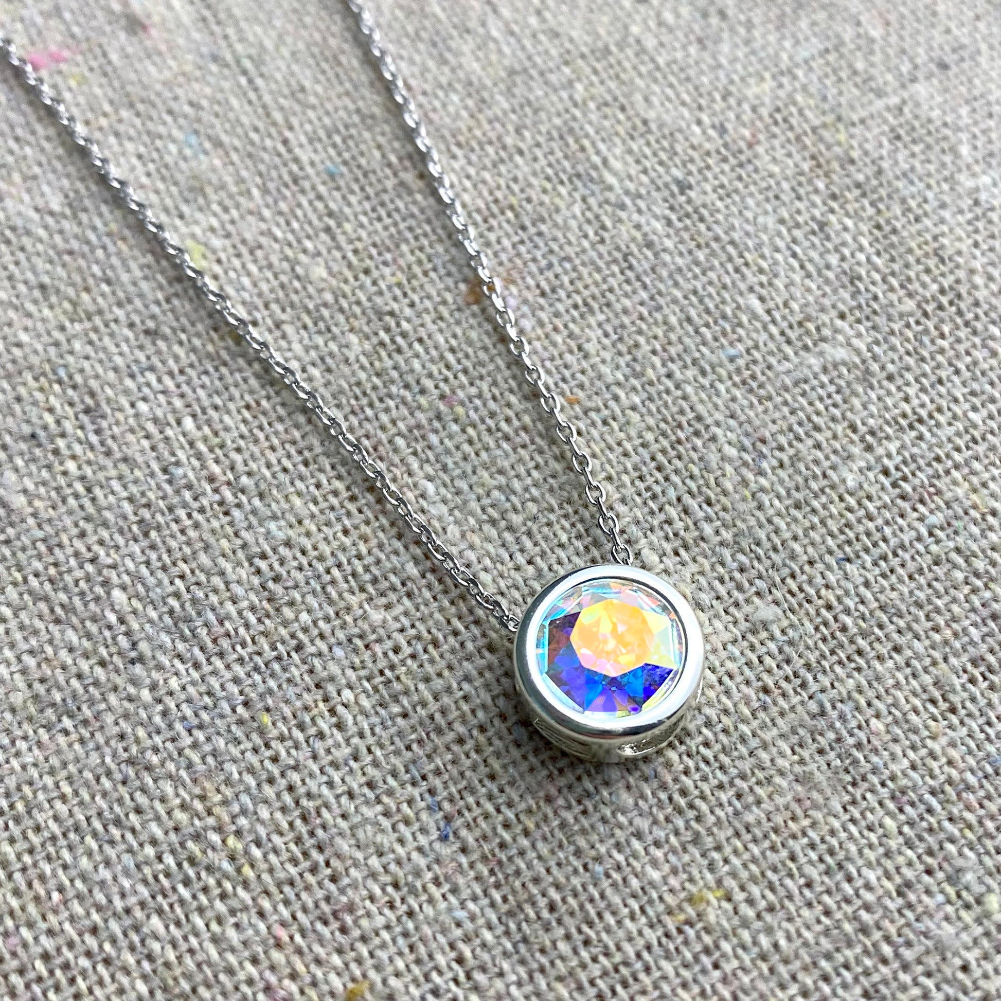 A layering favorite, this delicate necklace pendant made from a 8mm Xirius Swarovski® crystal, slides along the chain for an effortless look. Wear it alone or pair it with another necklace or 2 for the perfect custom layered look.