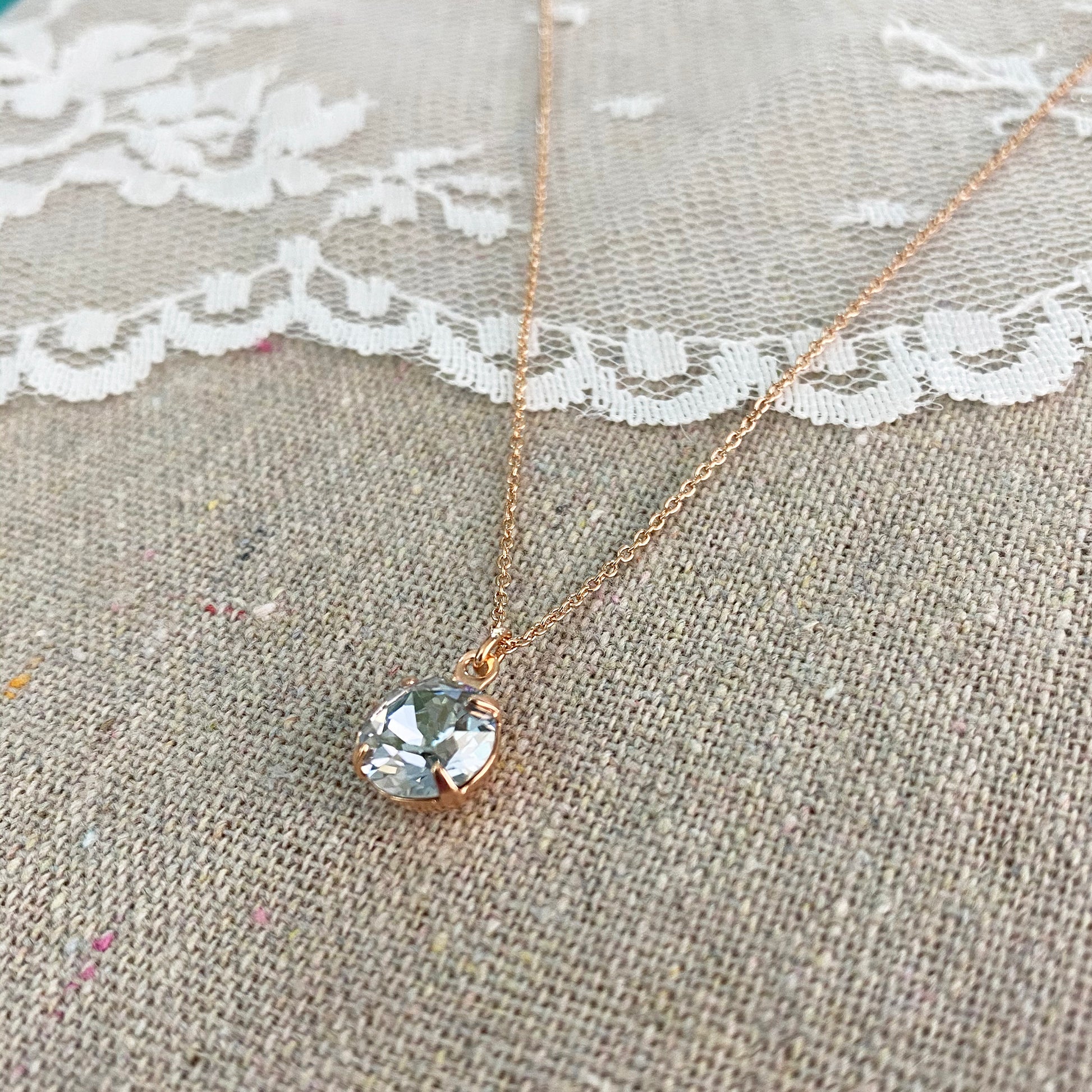 So delicate and sparkly, the Diamante necklace is made from a small pendant of an 8mm Xirius cut Swarovski® crystal. The pendant hangs from a fine cable chain which is adjustable. These necklaces are popular with minimalists and as gifts for flower girls or bridesmaids. Examples shown in rose gold are 'Blush Pink', 'Moonlight' and 'French Blue'.