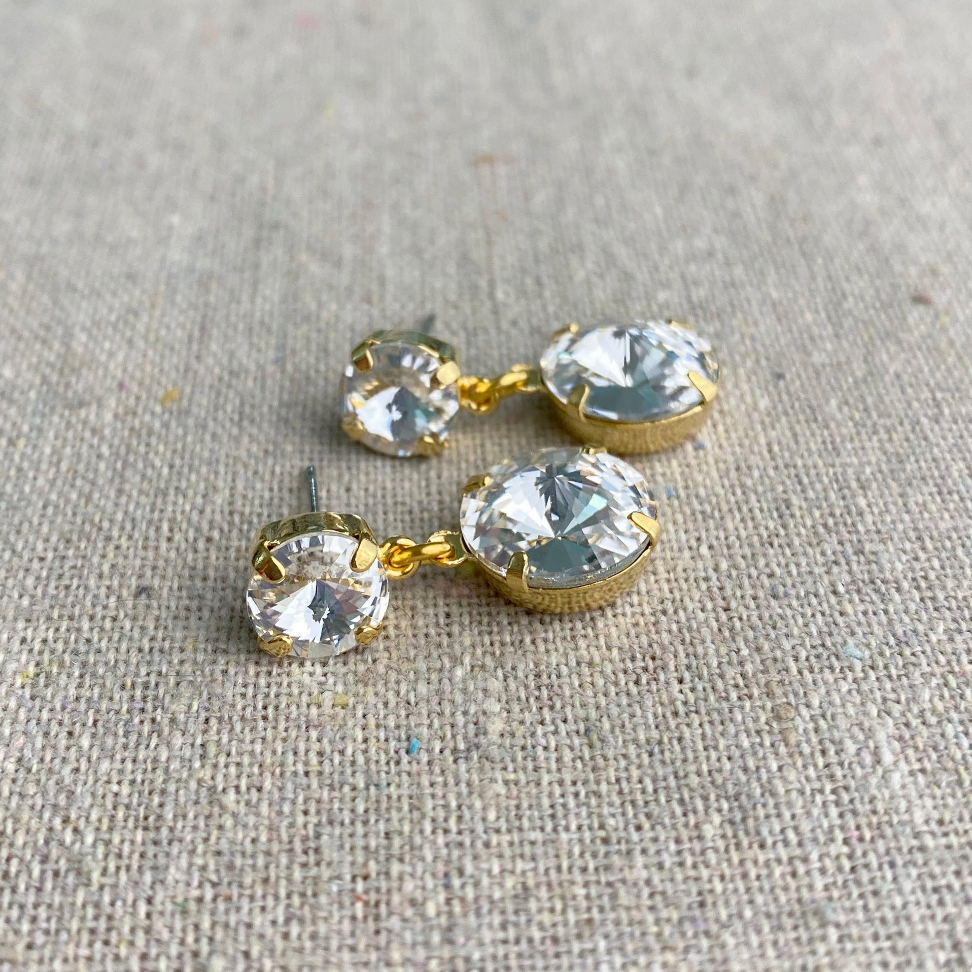 Fun statement earrings made with rivoli Swarovski® crystals set in plated brass with surgical steel posts. Shown in crystal and 14k gold plating.