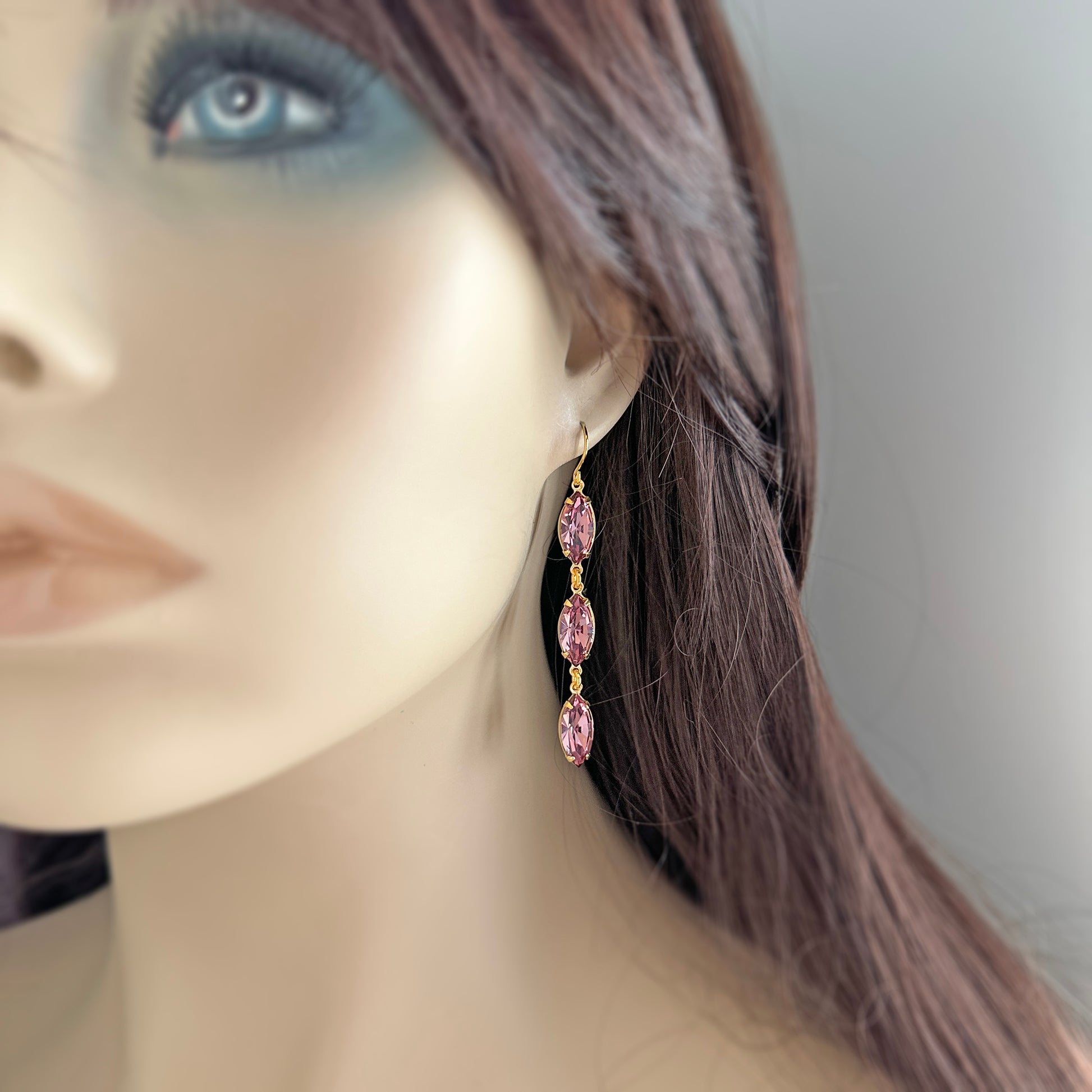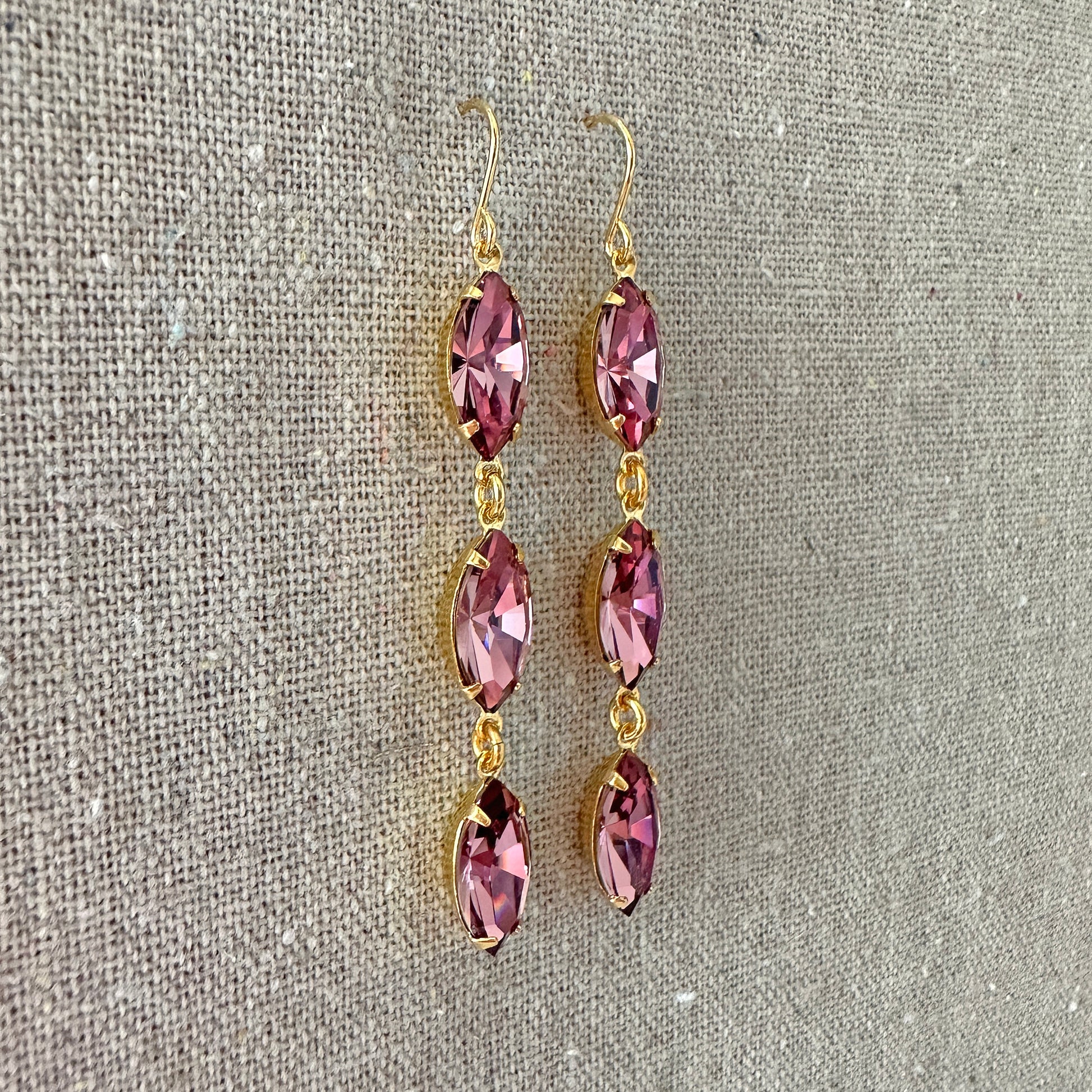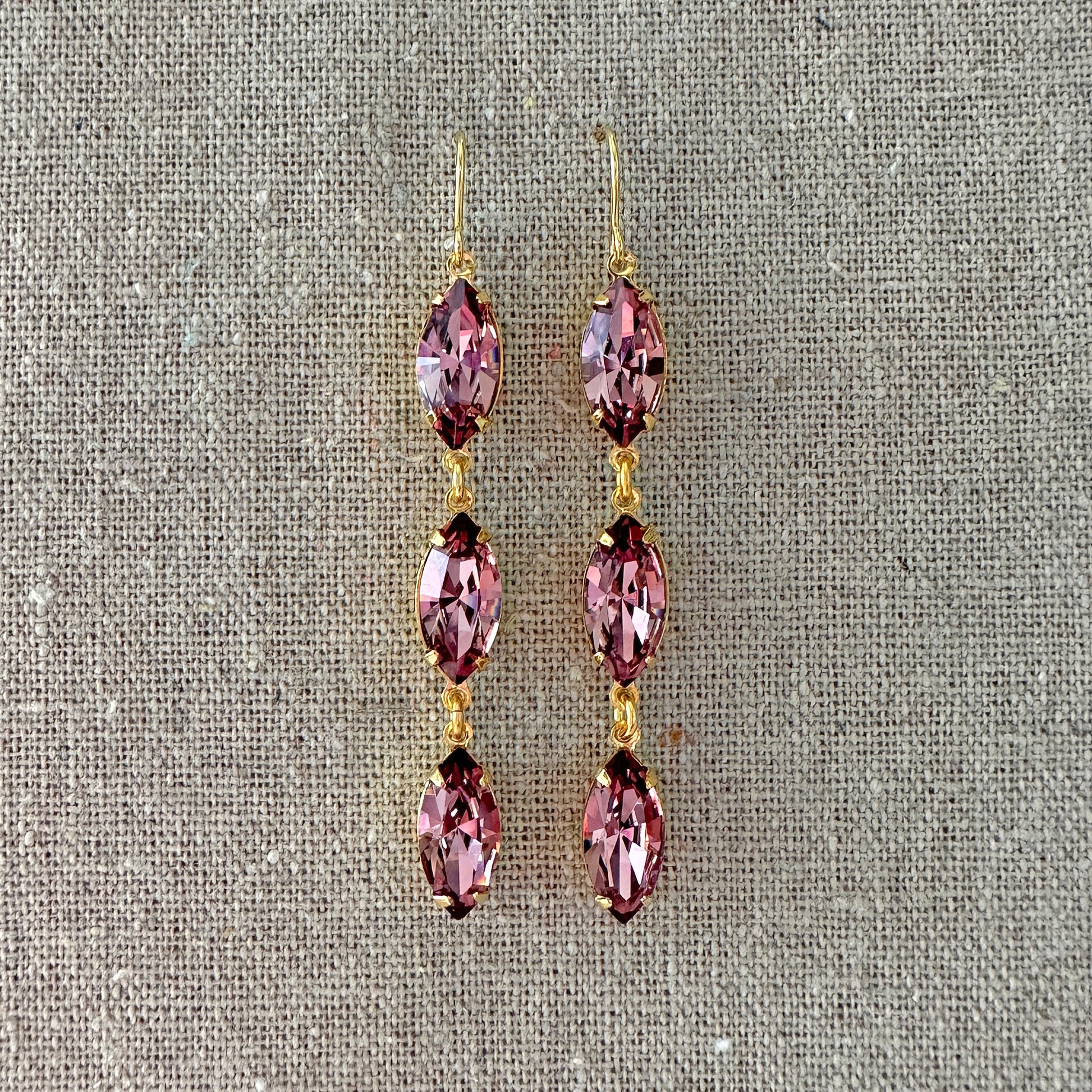 Extra long dramatic earrings with a slim silhouette made with 3 stacked marquise Swarovski® crystals in your choice of color and finish. Shown in the antique pink and gold finish.