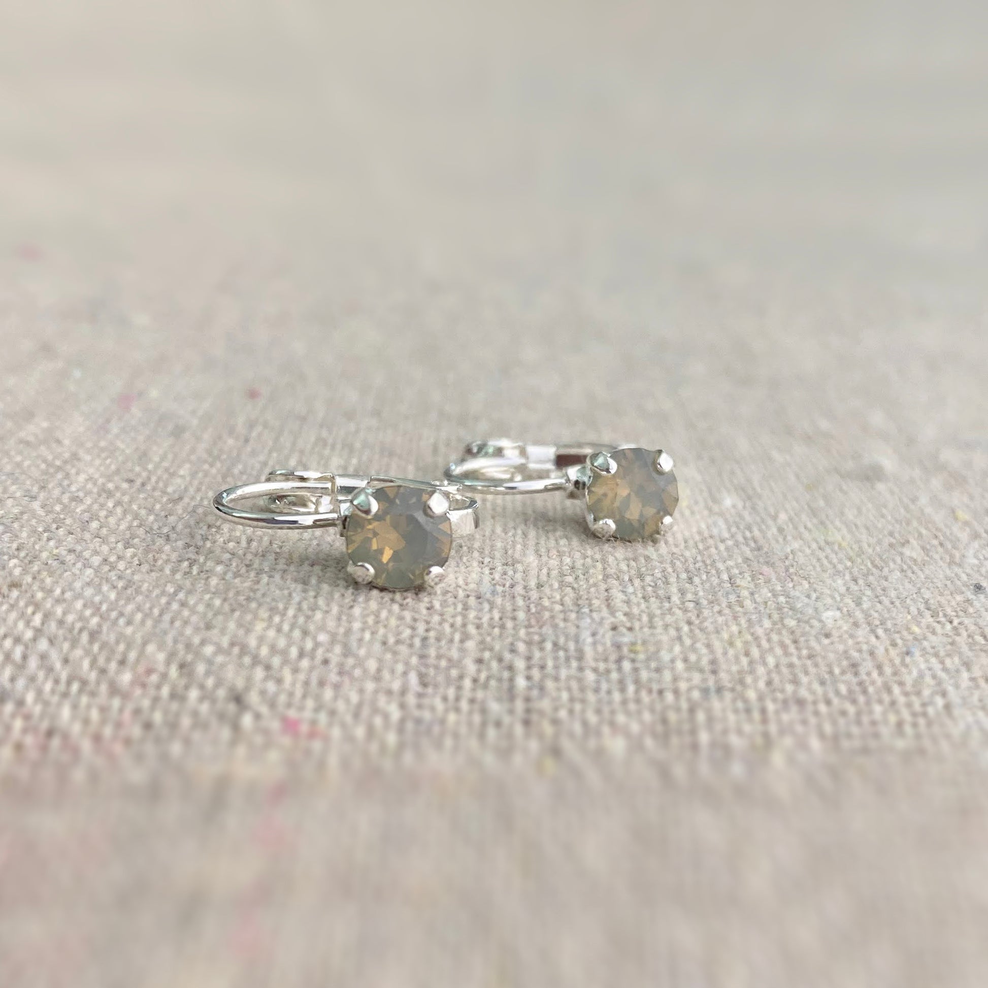 The perfect earring for the perpetual loser of all earrings. These earrings clip closed once on with a leverback. Sparkling 5mm Xirius cut Swarovski® crystals are set in these brass earrings that are plated in precious metal. Shown in light grey opal and silver plated.