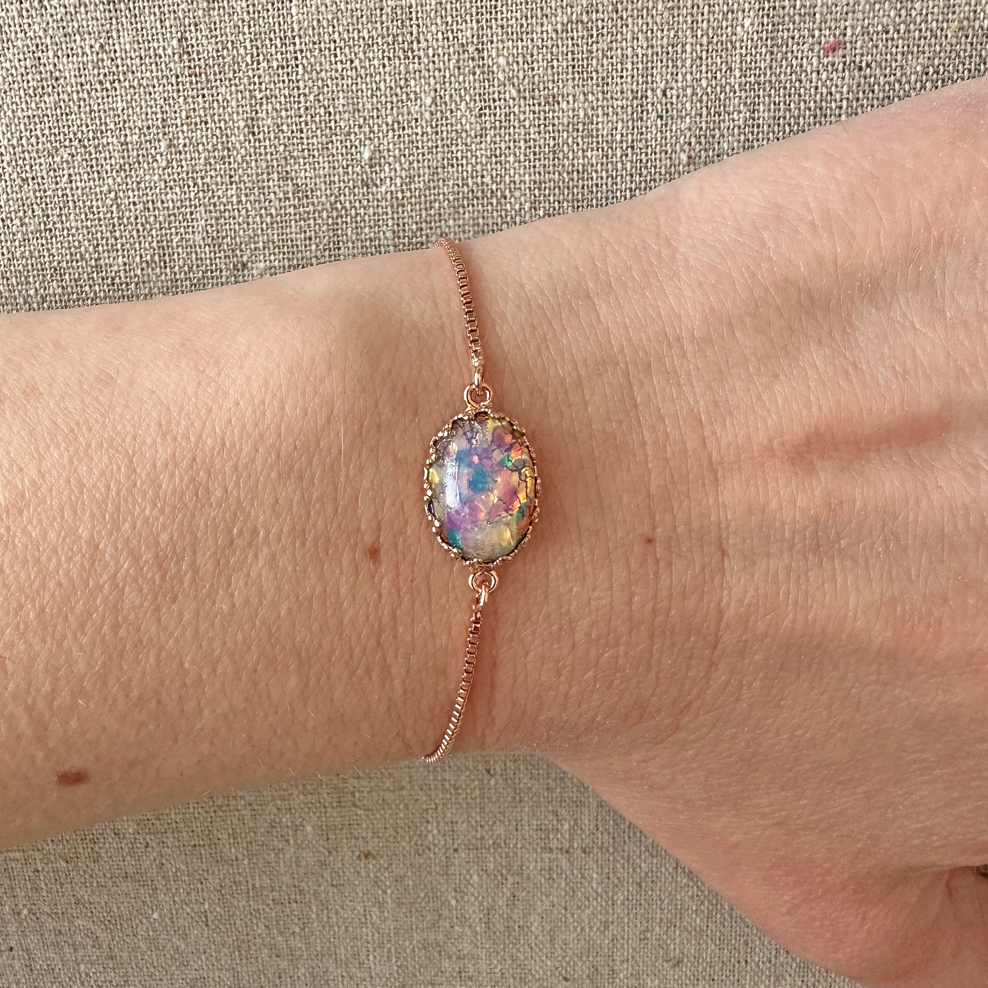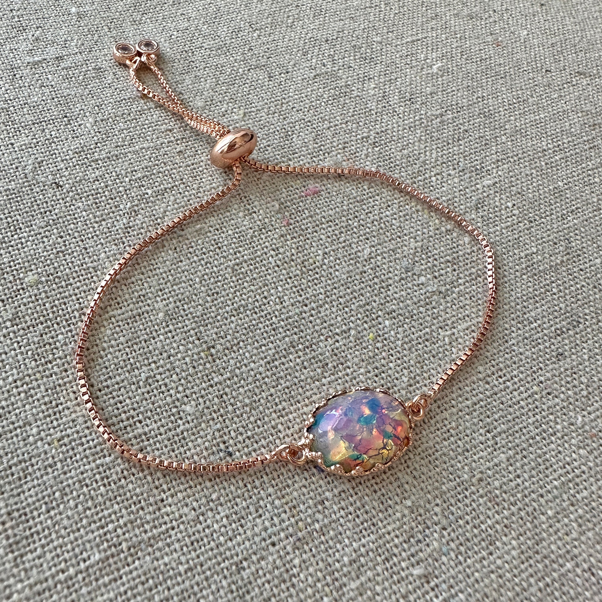 A simple yet stunning bracelet with a Preciosa® lampwork opal stone set in a crown edge settings connected to box chain that closes with a sliding clasp. Color stone is 'fire opal' with rose gold plating.
