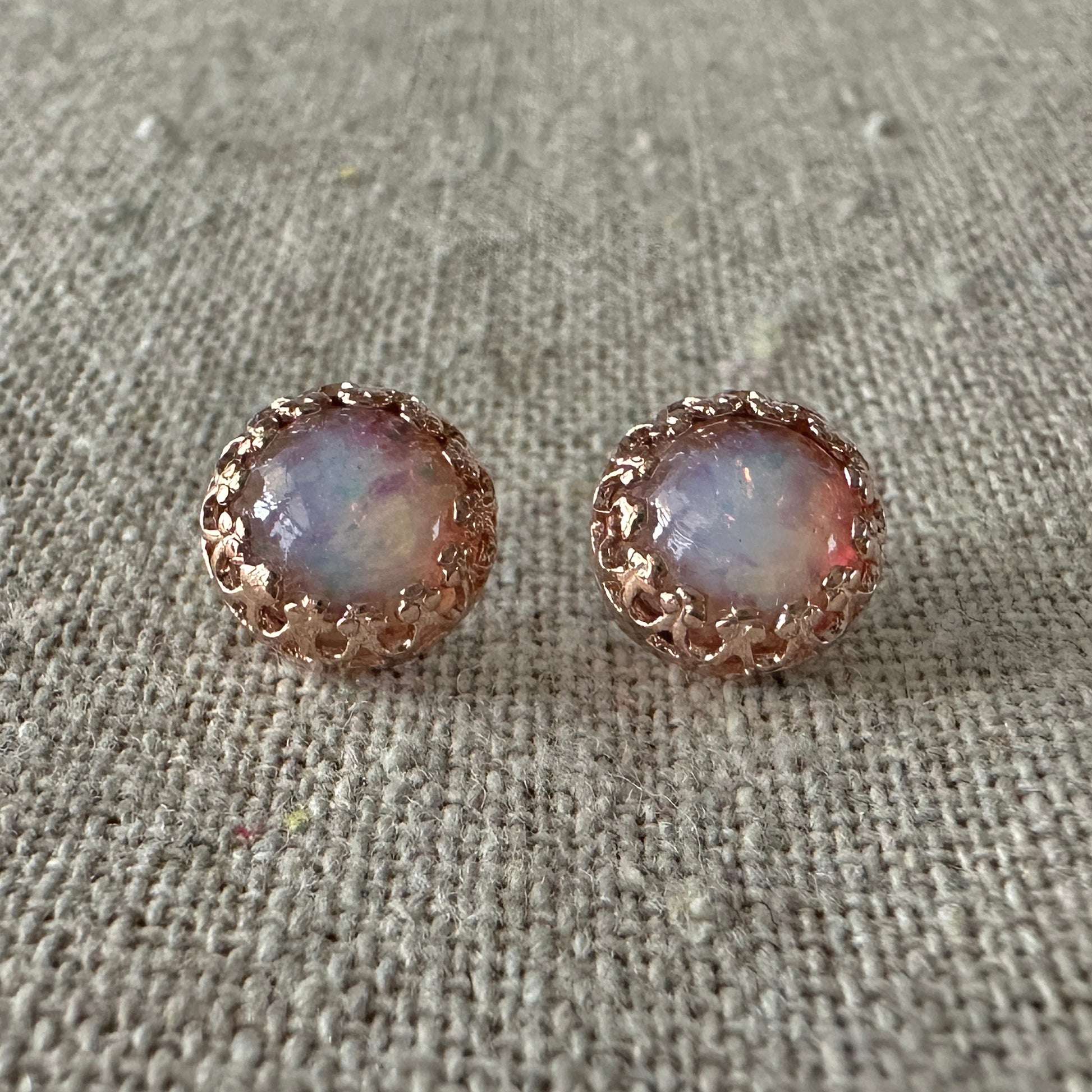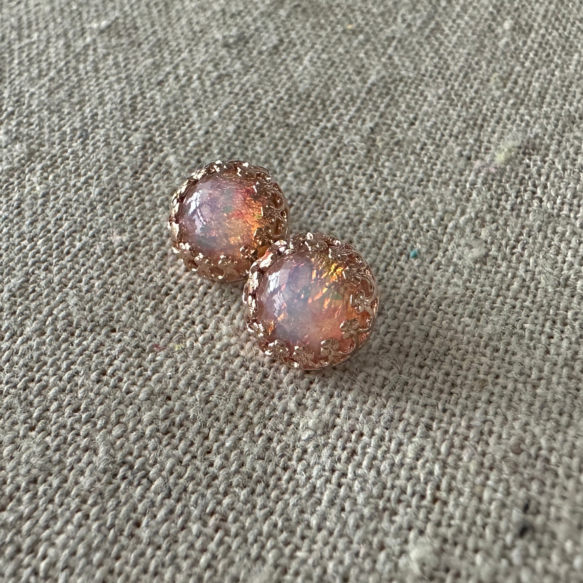Complete your look with these darling little studs. Made from handmade lampwork fire opal glass stones which are handmade in Europe, no 2 are exactly alike. Set in crown post settings made of plated brass.