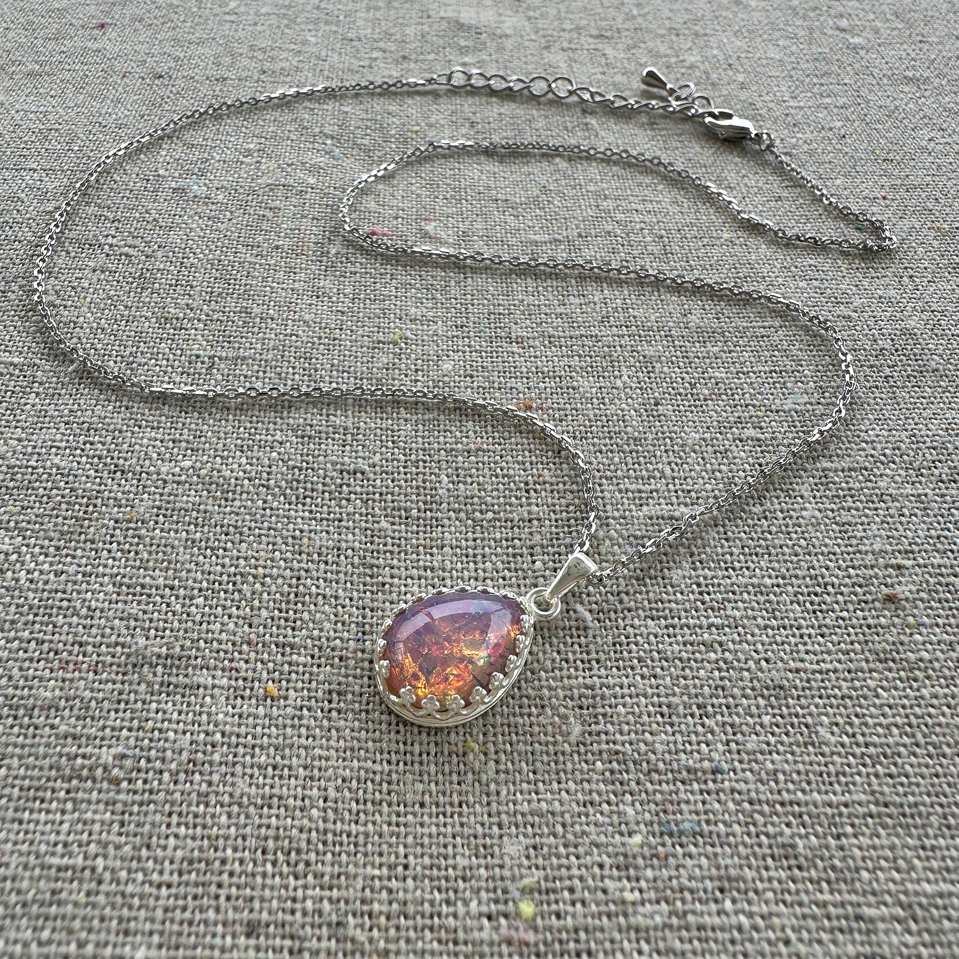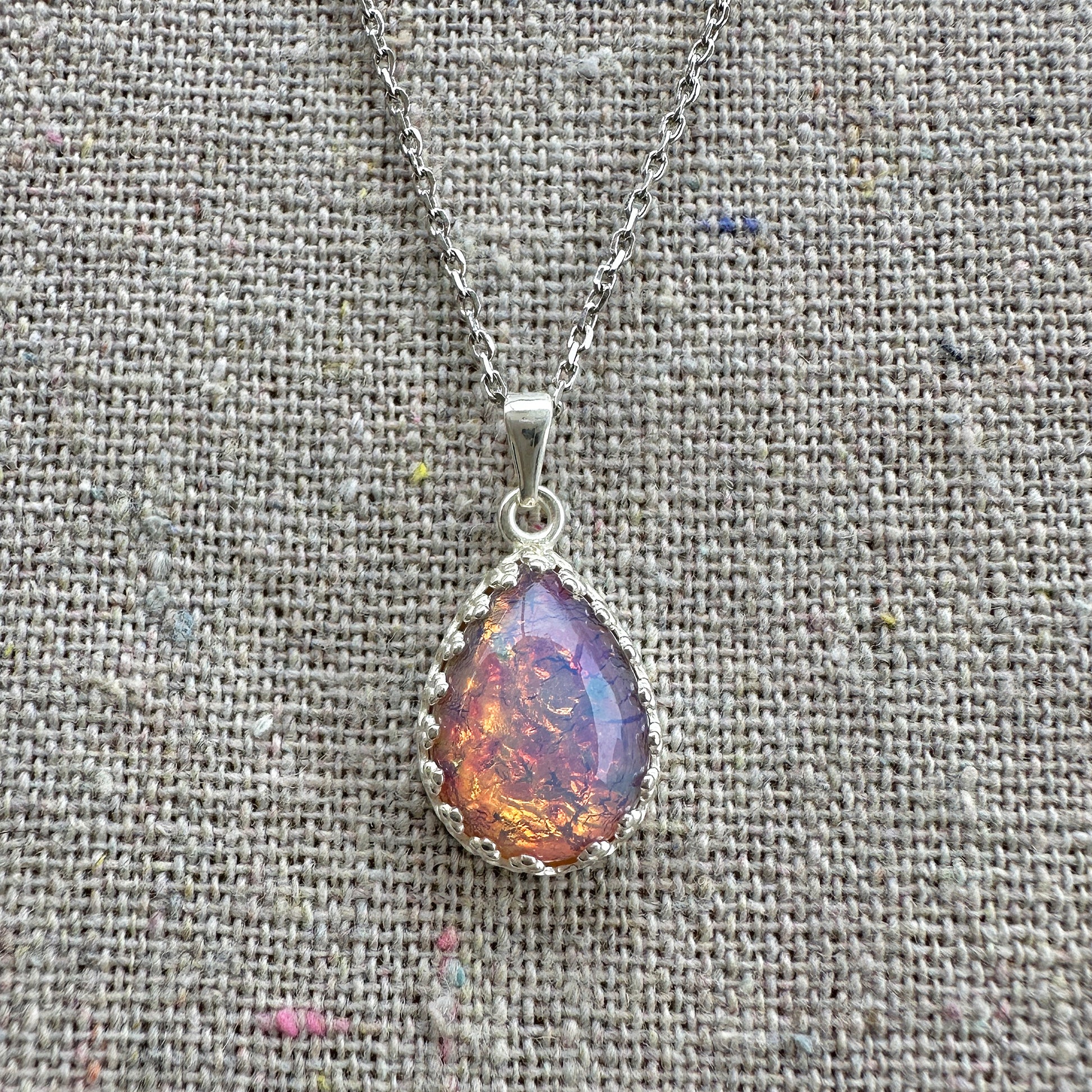 A simple necklace featuring a pear shape domed vintage handmade lampwork fire opal set in a delicate clover crown setting. The pendant hangs from an adjustable cable chain. These glass stones were made in the Czech Republic in approximately the 1950's and they're so beautiful, glowing different warm golden and pink hues with rippled foiling throughout. *Please note that due to the handmade nature of these stones no 2 are exactly alike.
