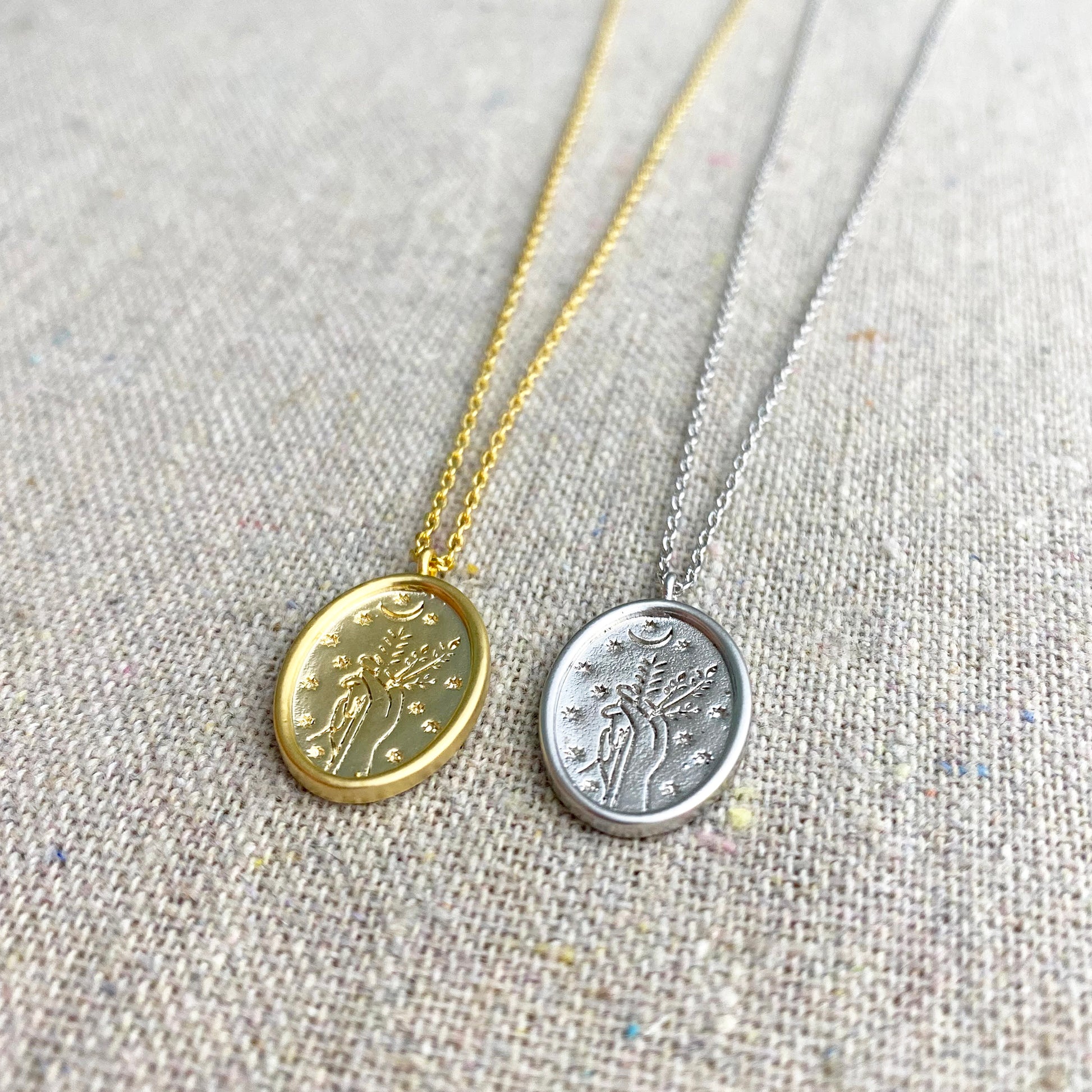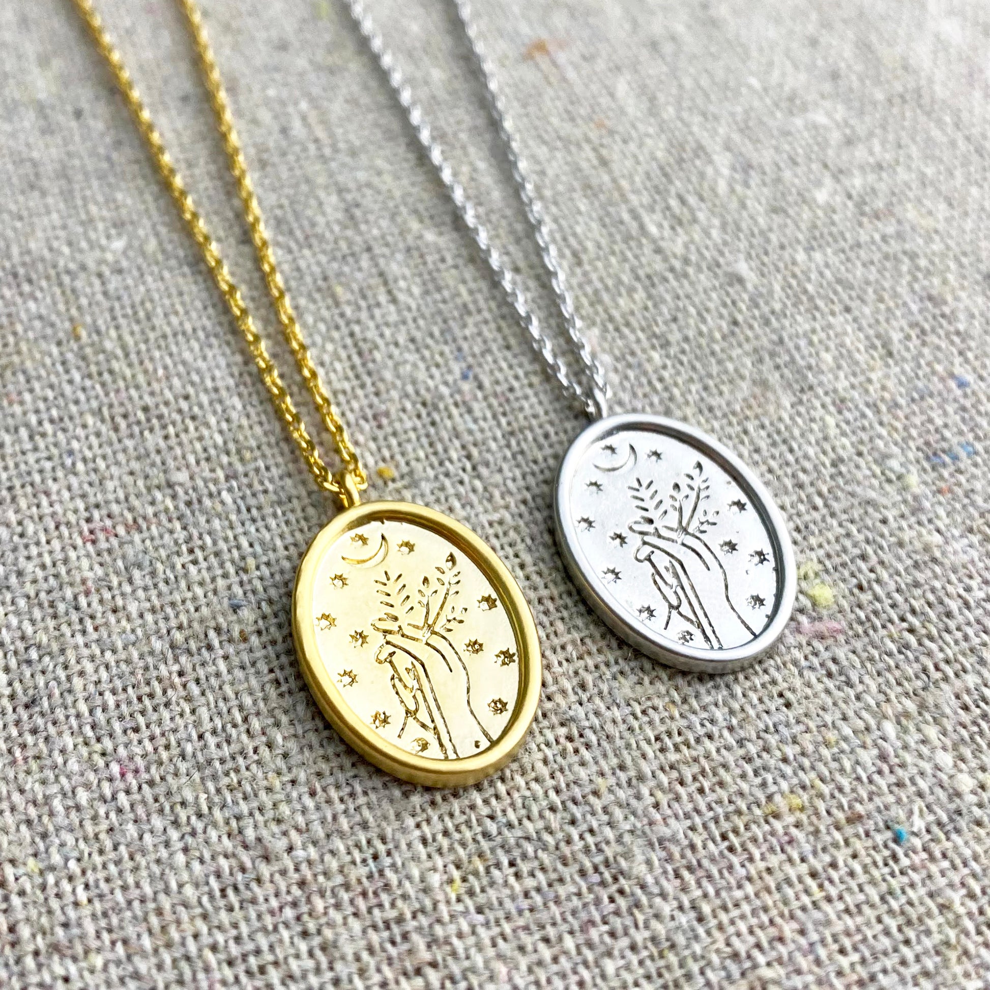 An oval coin pendant of a hand holding a bouquet beneath a crescent moon and starry night sky. The pendant hangs on a delicate cable chain made from jewelers brass plated in rhodium or 14k gold. The chains have a luster finish while the pendants stamped details pop against a matte finish.