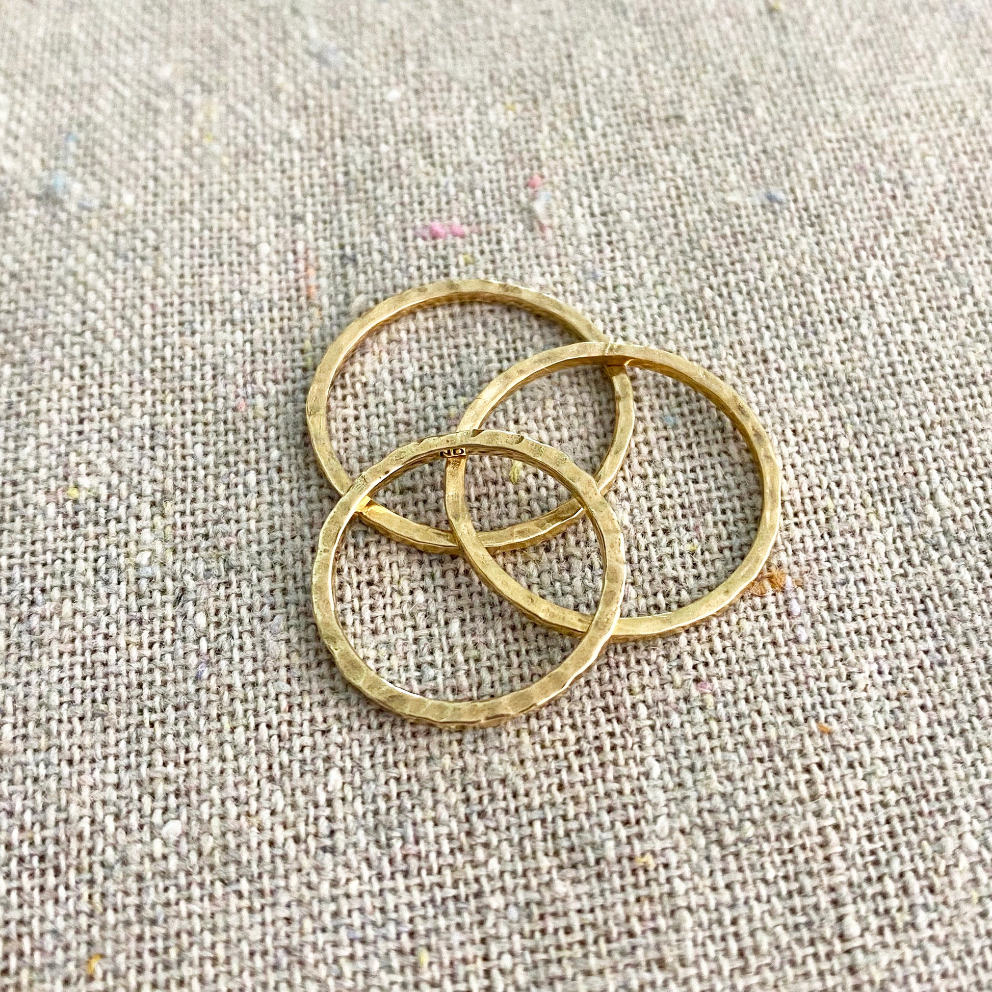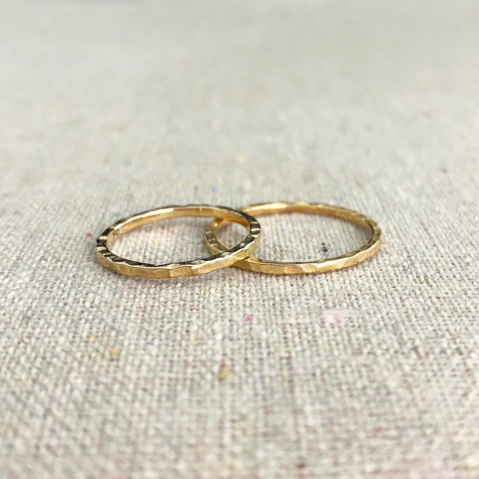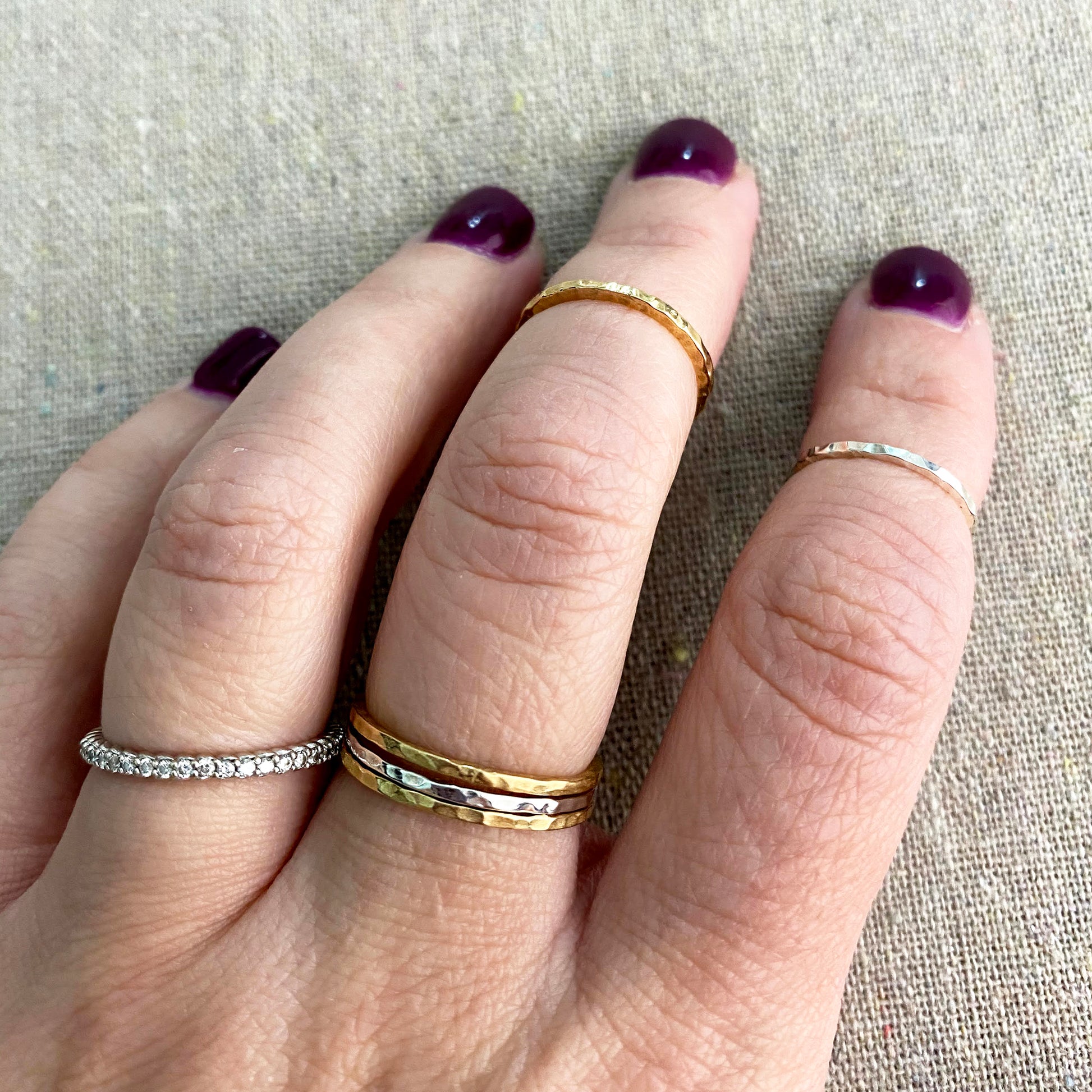 These rings are so good. They're thin and perfect for stacking. Wear them stacked with some of your other rings and give a new look and life to some staple pieces you already own. These rings are formed out of bronze wire, soldered closed, tumbled for hours to make them harder and more durable and then hammered with the rounded end of a jeweler's hammer to make them dimpled. Shop the sterling ones here.