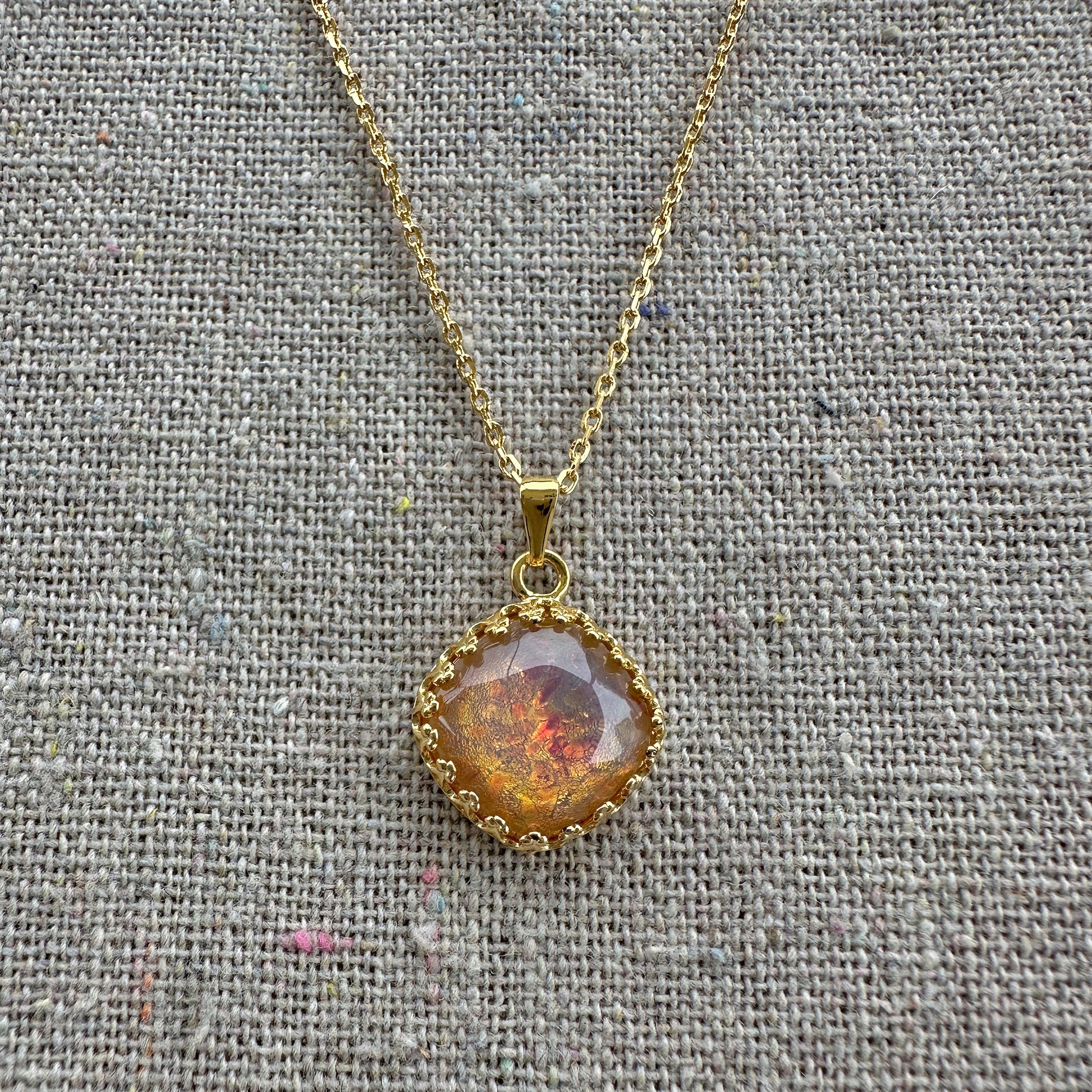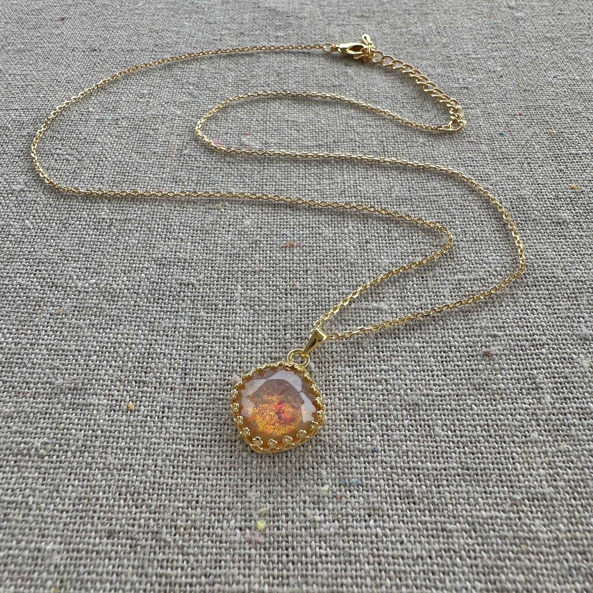 A gorgeous delicate adjustable necklace featuring a handmade lampwork glass gem in harlequin opal is set in a clover crown setting hanging on a cable chain. The harlequin opal mimics a sunset with warm golden and pink hues with flecks of foiling throughout. Due to the handmade nature of this stone, no 2 are alike.