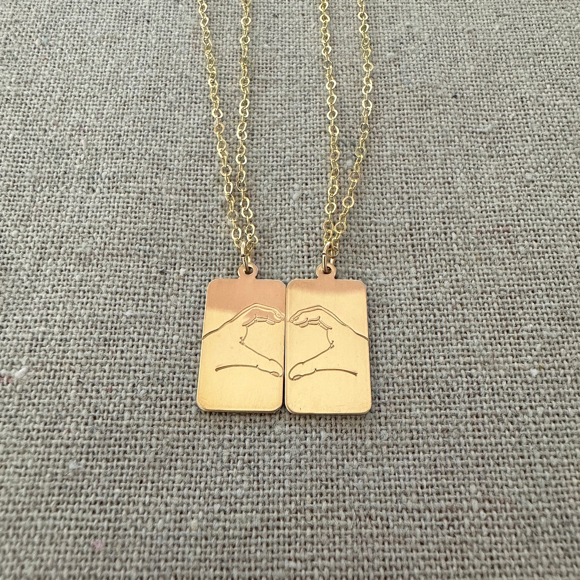 The perfect upgrade to the traditional best friend necklace. No more fighting over who gets the 'be fri' or the 'st end' of the 'best friend' necklace. If you're too young to know what that means, I'm rolling my eyes. Two hands forming a heart when the pendants are together. Wear one and give the other to your bestie, mommy, whoever completes you or is always in your heart.