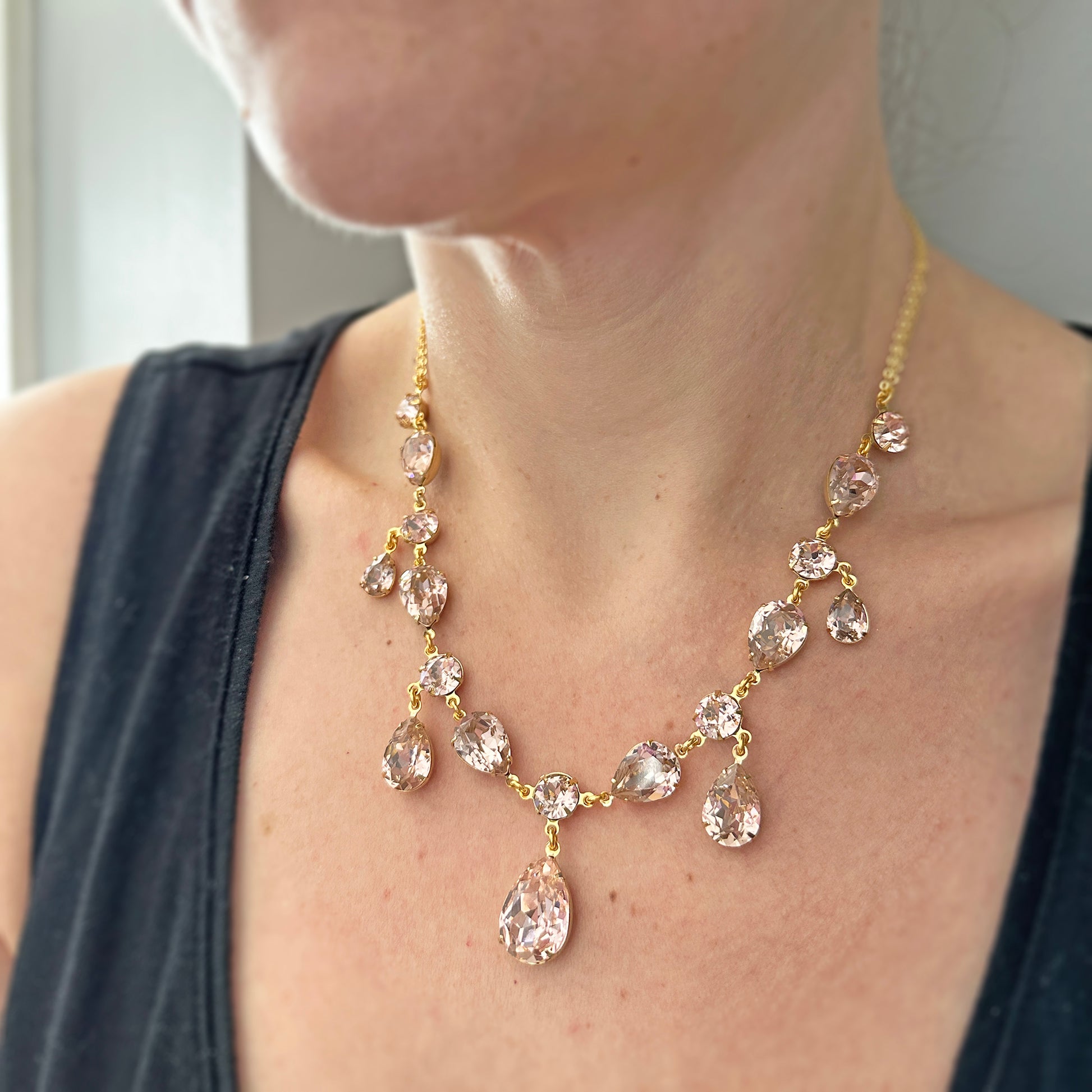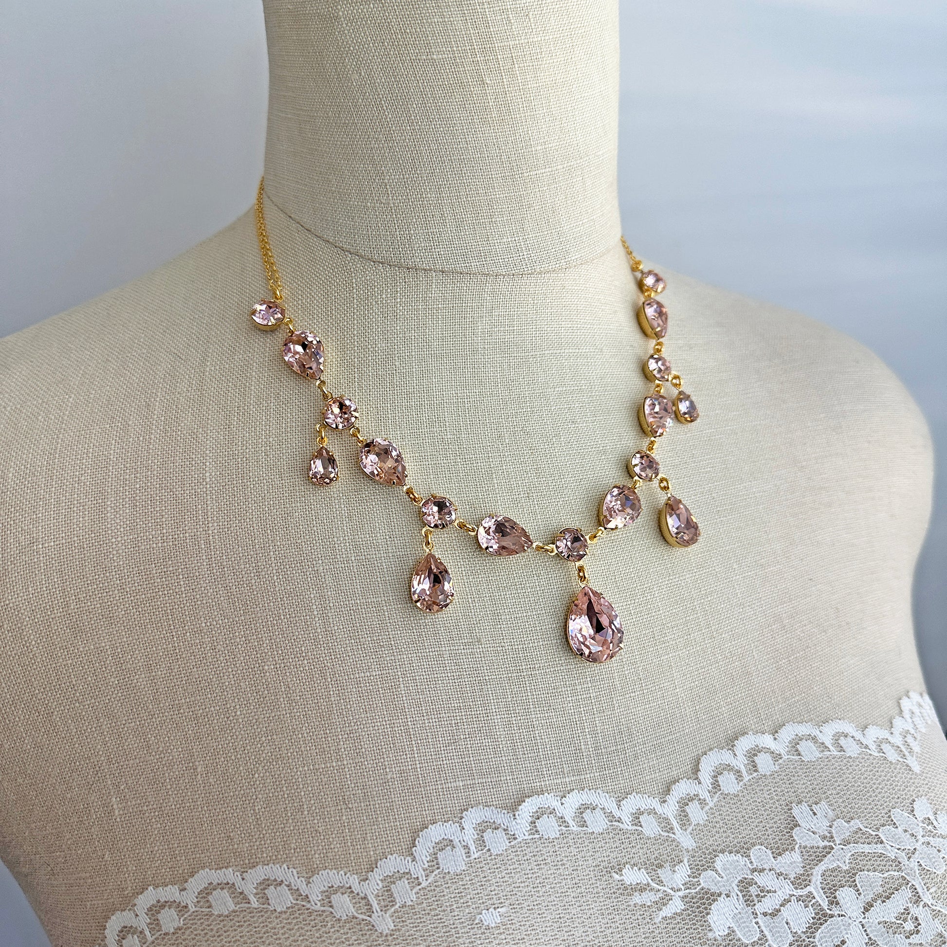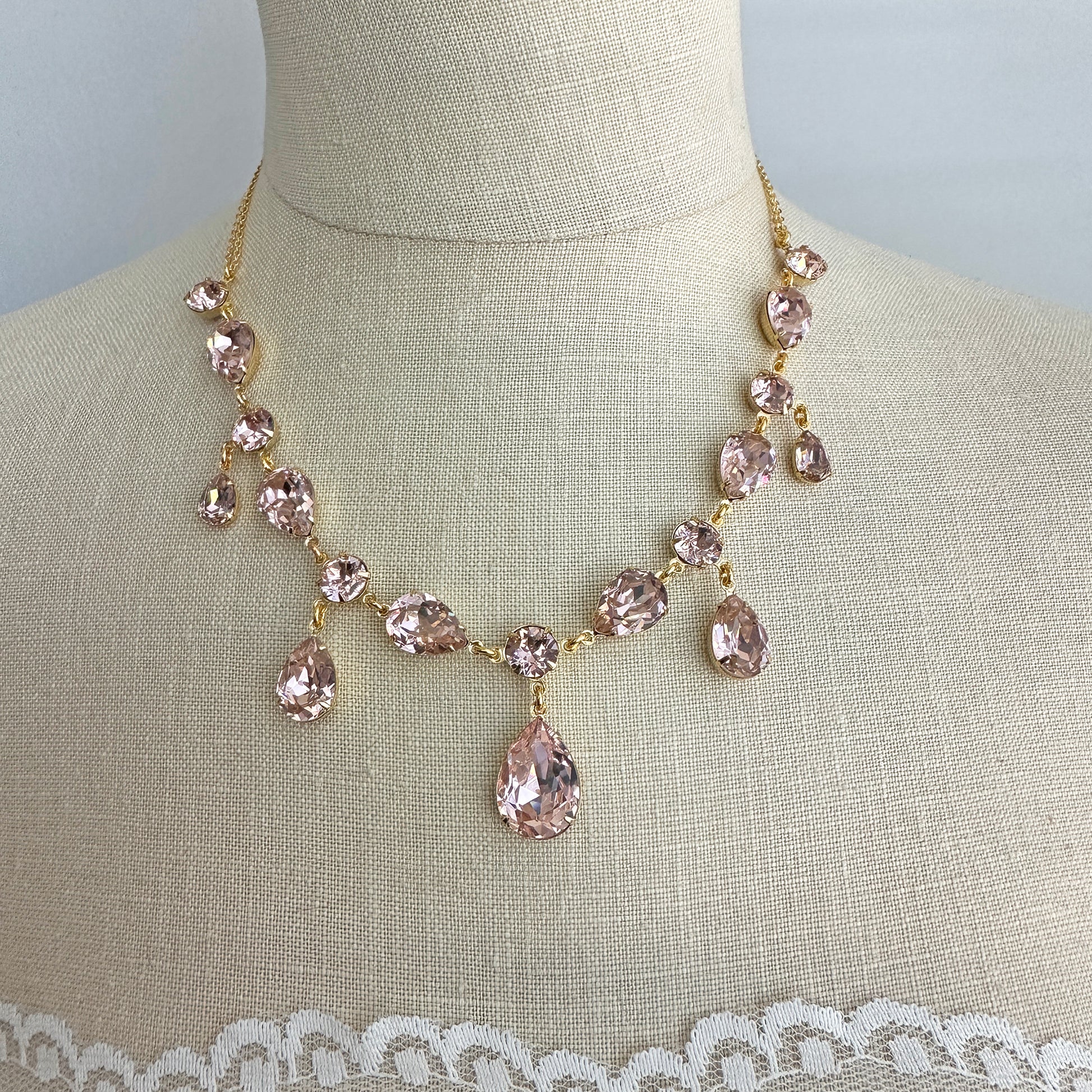 A true show-stopping statement necklace made from pear and Xirius cut Swarovski® crystals connected to sparkling cable chain complete with an extension chain that closes with a lobster clasp. Shown in gold and blush pink.