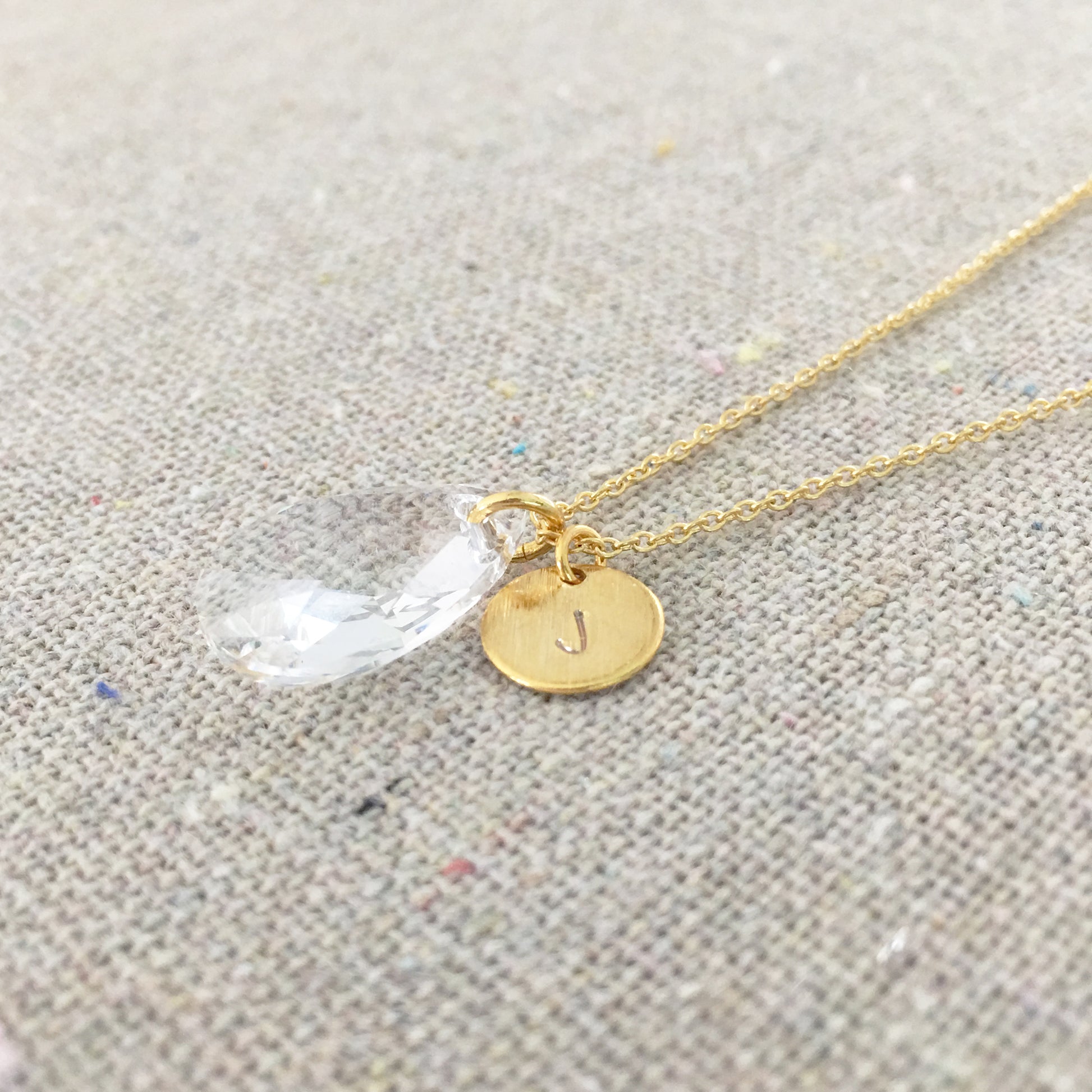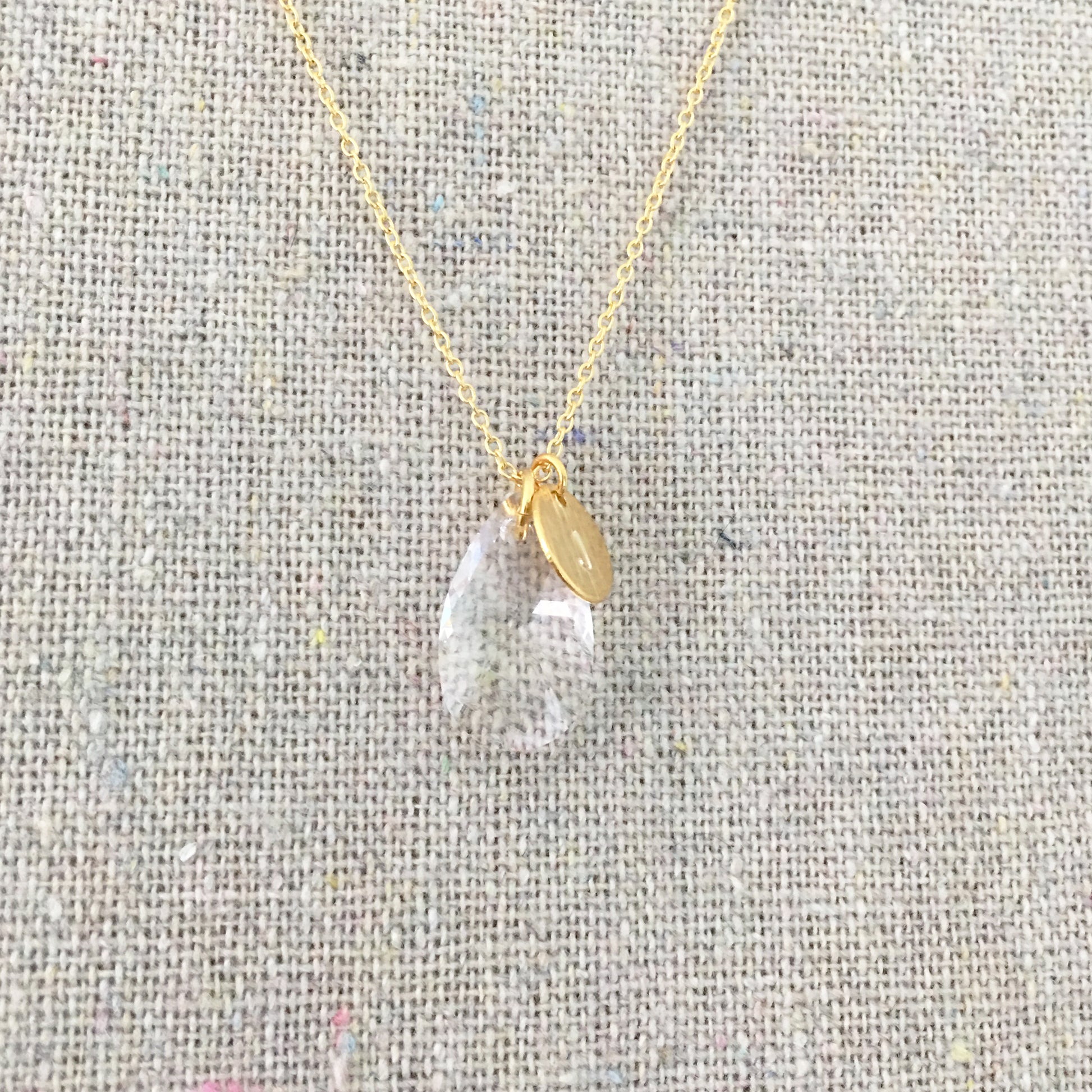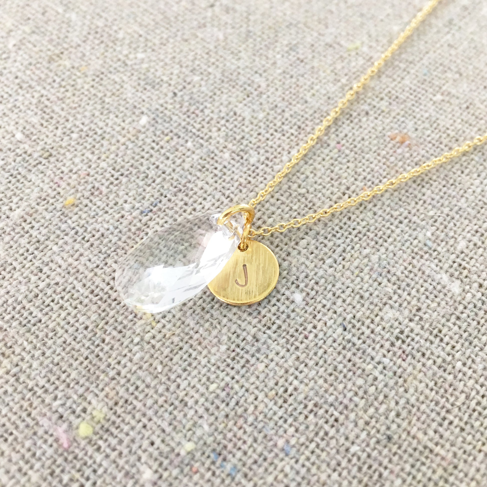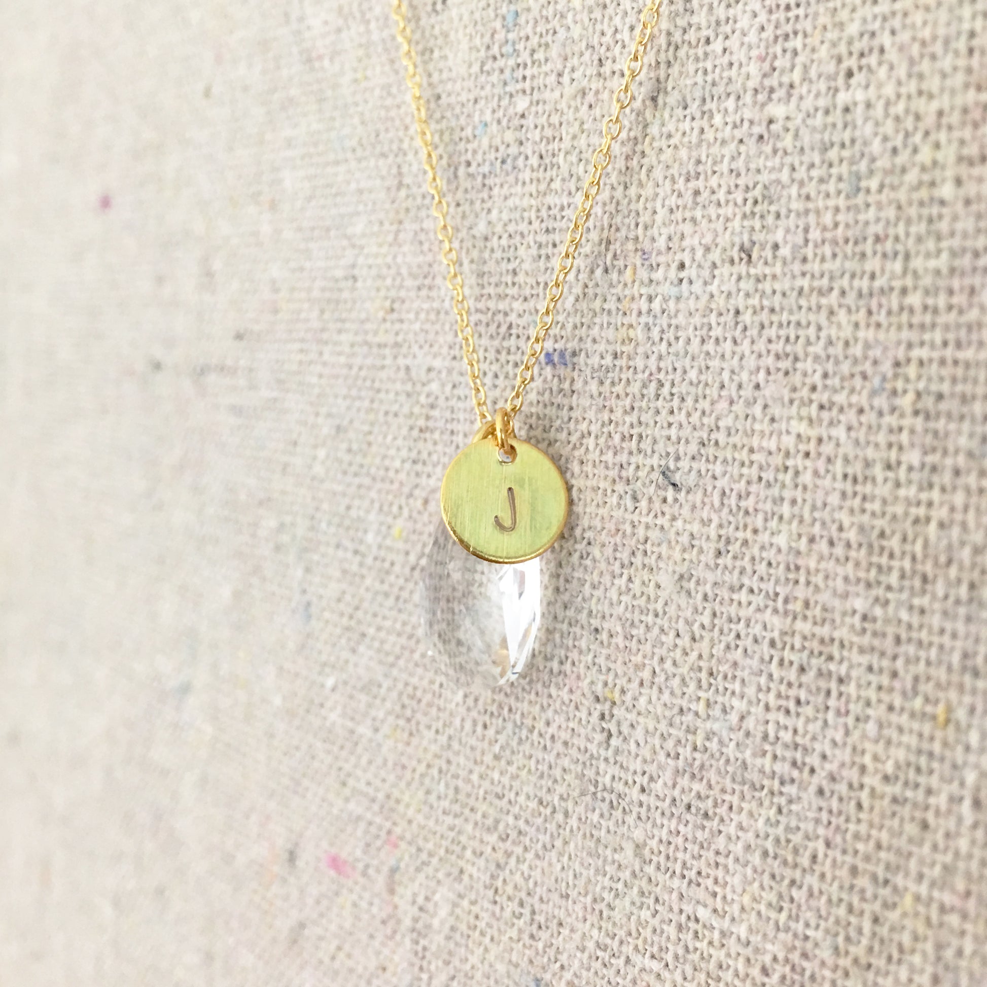 Purely simple in the best possible way, this tear necklace with a small hand stamped initial charm is ideal for gift giving...to your friend, bridesmaids or yourself. Just a transparent Swarovski® crystal teardrop with a tiny plated brass disc where your letter of choice is stamped into it.