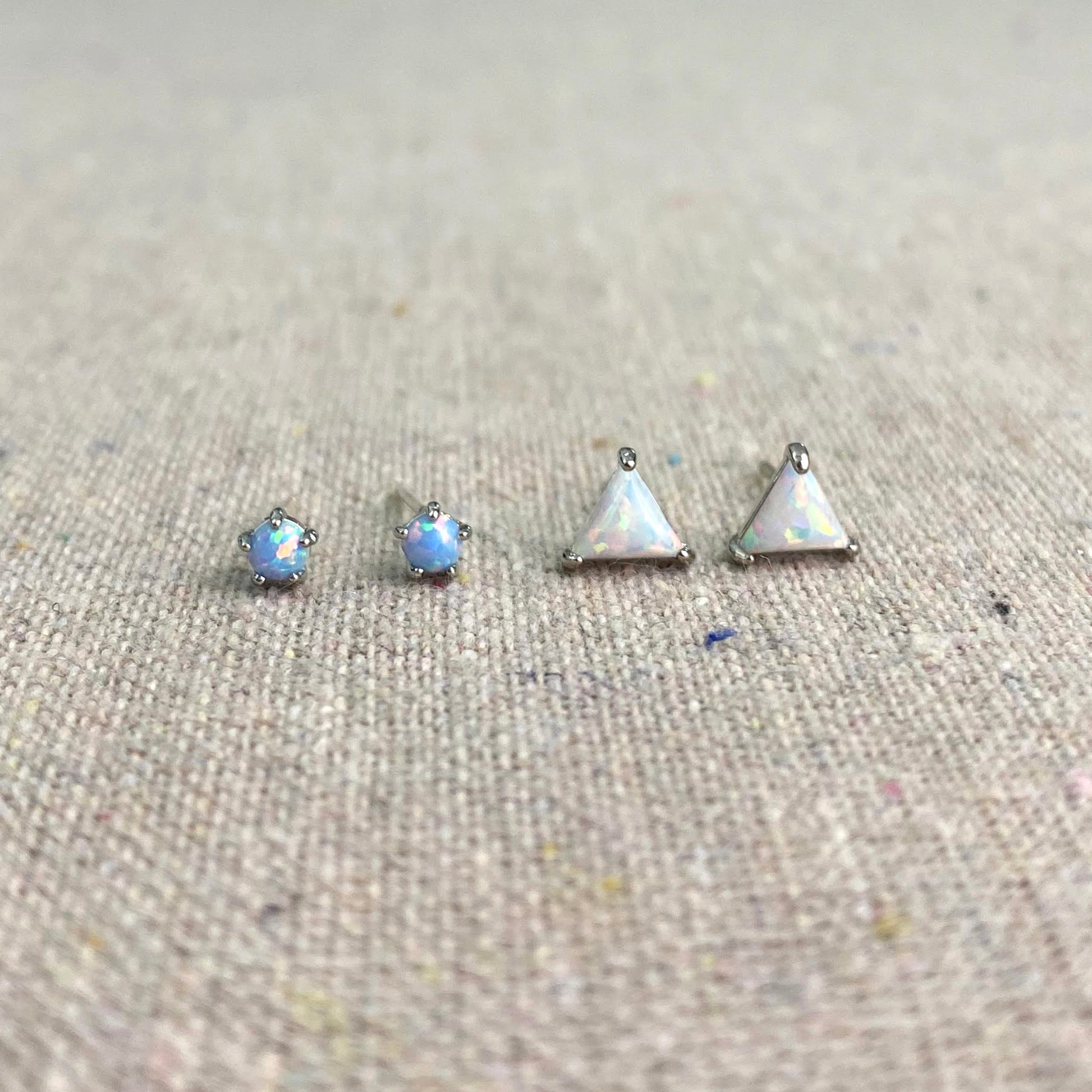 Tiny and delicate these are ideal for your second ear piercing. The posts are attached to the top, not the center. Bright blue synthetic lab created opals are set in brass prong settings thickly plated in rhodium. If you'd like to make it a set, you can purchase the white opal triangles here.