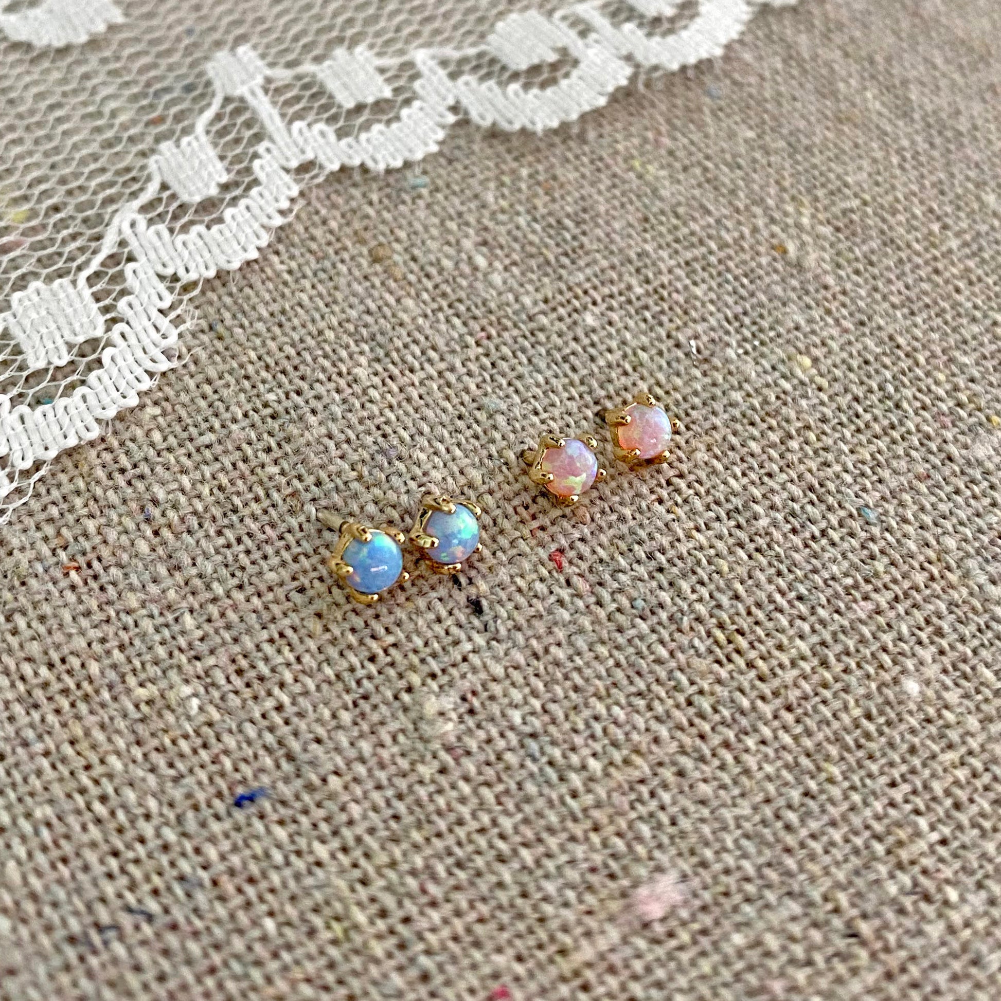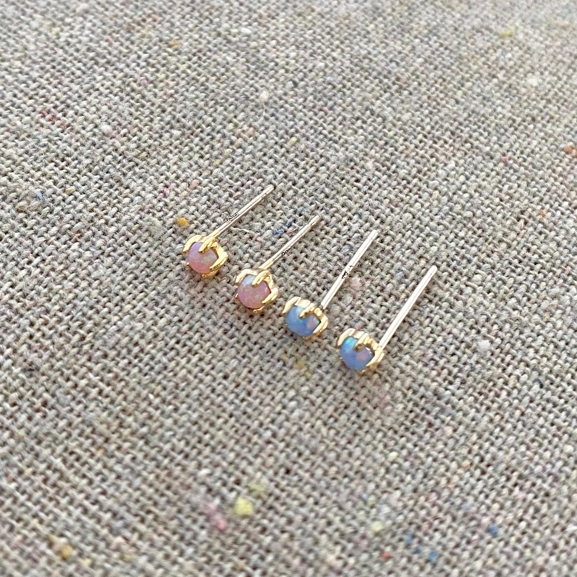 Tiny and delicate these are ideal for your second ear piercing. The posts are attached to the top, not the center. Bright blue or pink synthetic lab created opals are set in sterling silver plated in 14k gold prong settings.