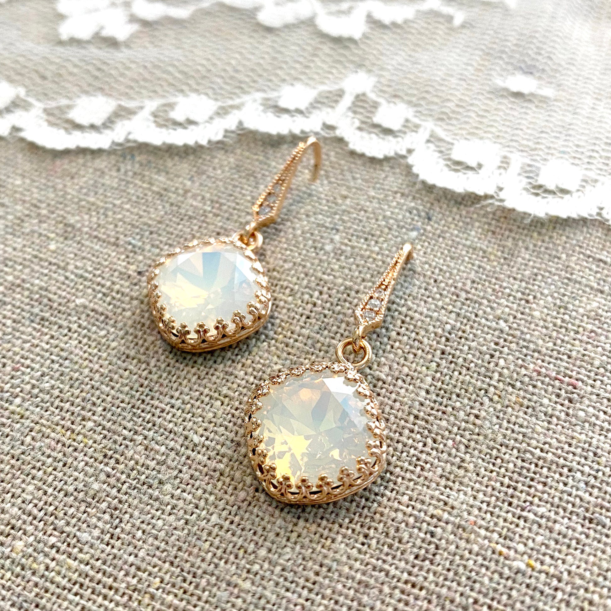Cushion cut Swarovski® crystals set in delicate clover crown edge settings which dangle from detailed micro pavé earring hooks. It's all in the details with these earrings as the earring hooks give it that something special which is perfect for formal events. Shown in White Opal and rose gold.