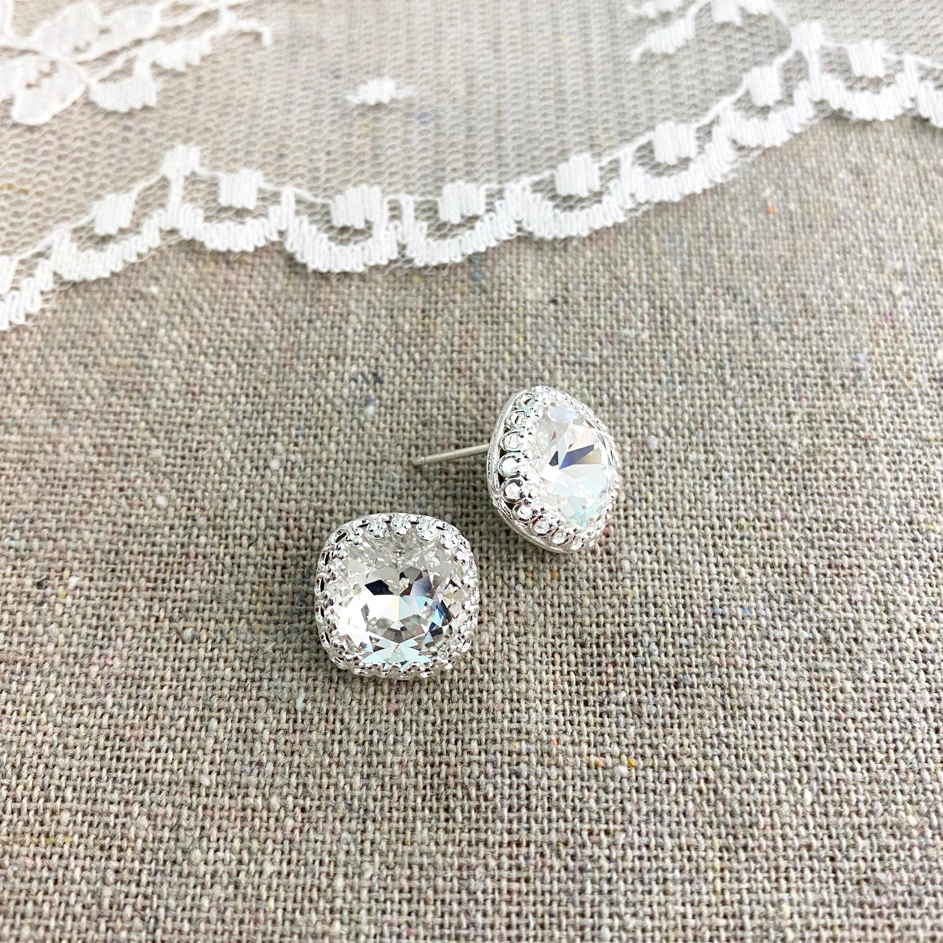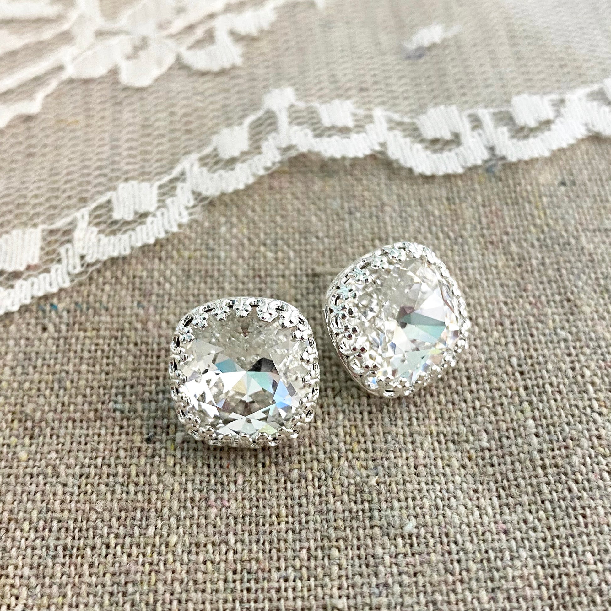 Cushion cut Swarovski® crystals set in delicate clover crown edge settings in solid brass plated in your choice of precious metal. Shown here in Crystal and silver finish.