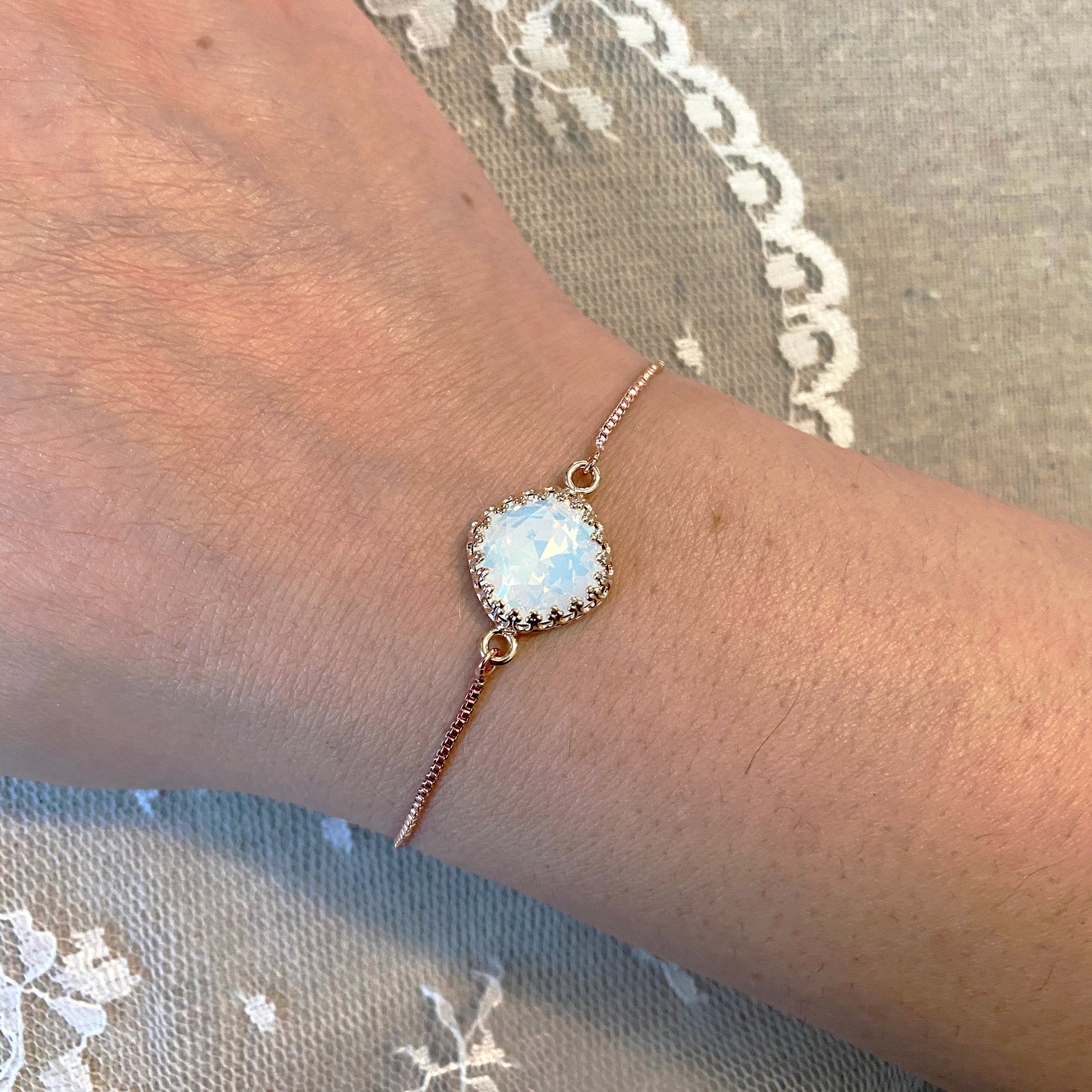 The best easy-on, easy-off bracelet because of the sliding bolo. A solitary Swarovski® crystal cushion in a clover crown settings on box chain with 2 small clear crystals at the tail. This bracelet mixes so well with the other pieces in the Crown series.