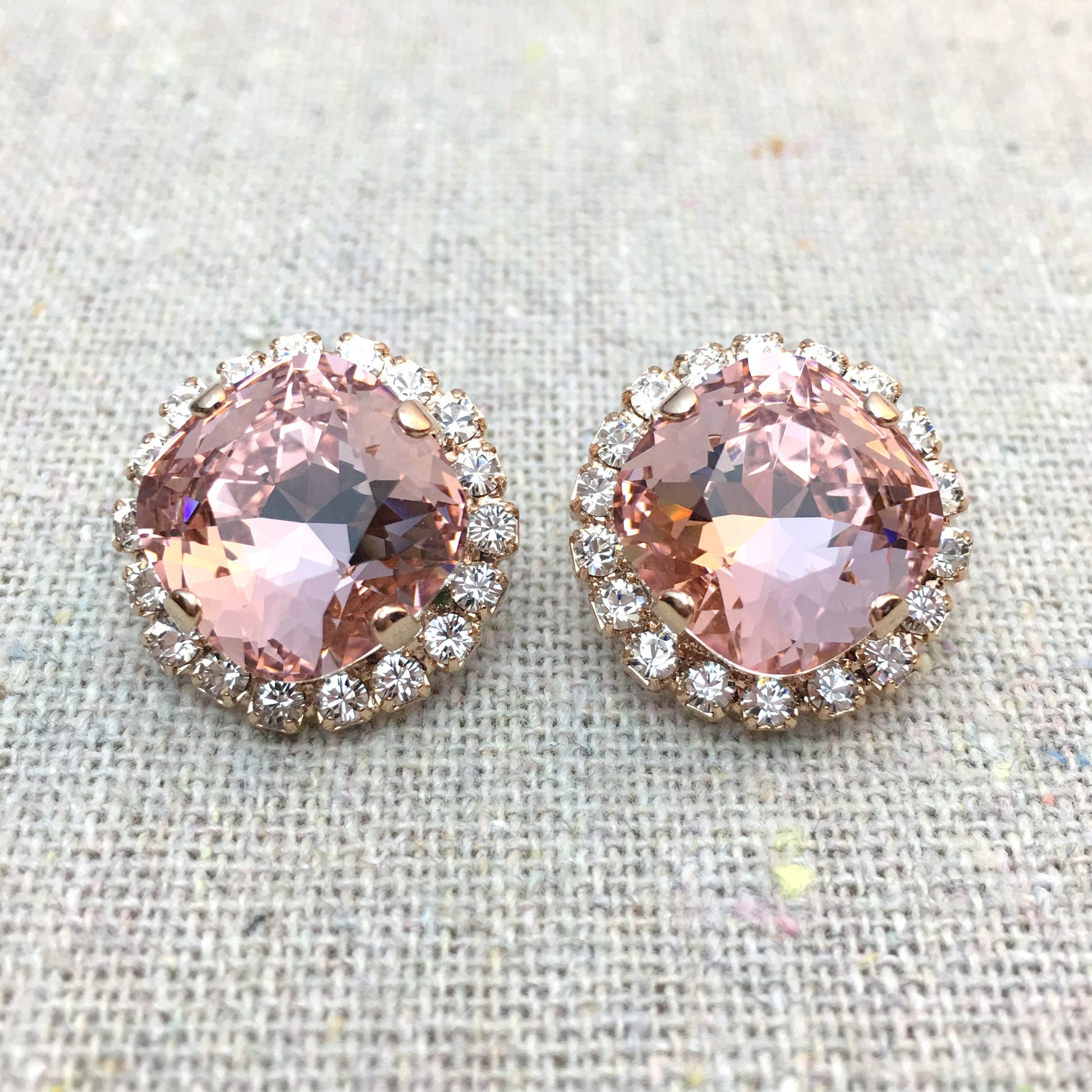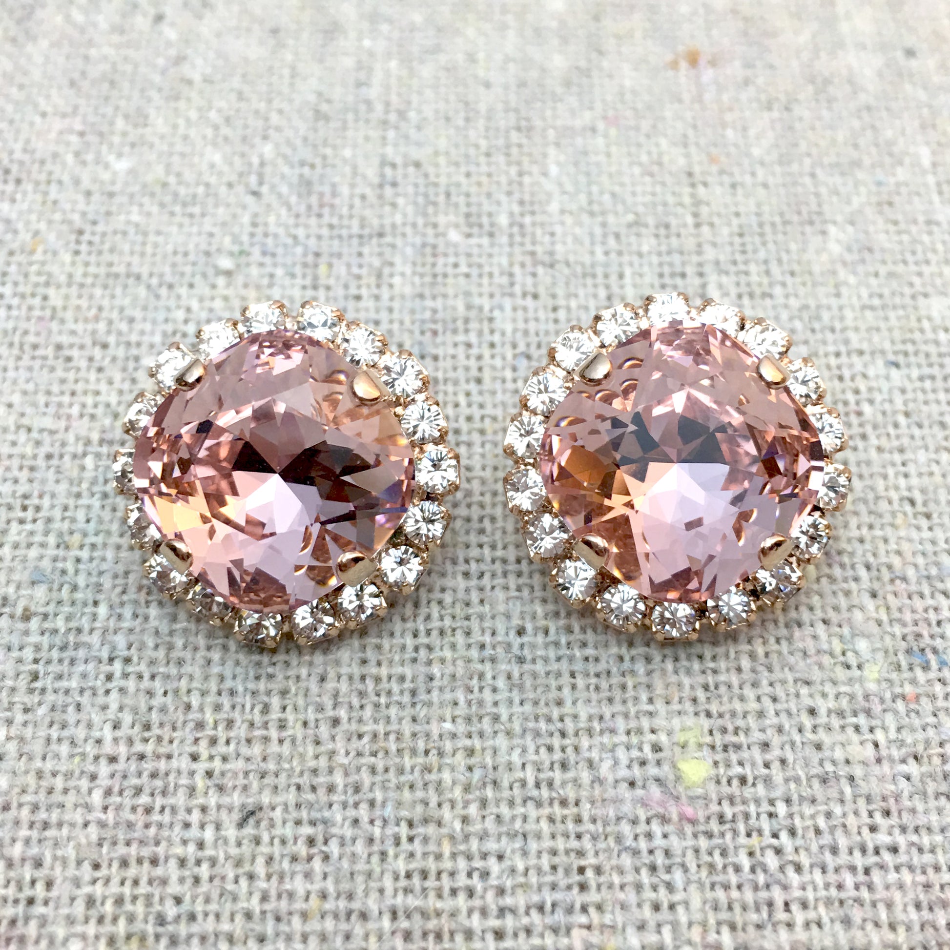 The ever popular cushion posts have been taken to the next level of glam by adding a halo of smaller crystals. Perched in the middle is a blush pink (or choose a different color) cushion cut Swarovski® crystal.