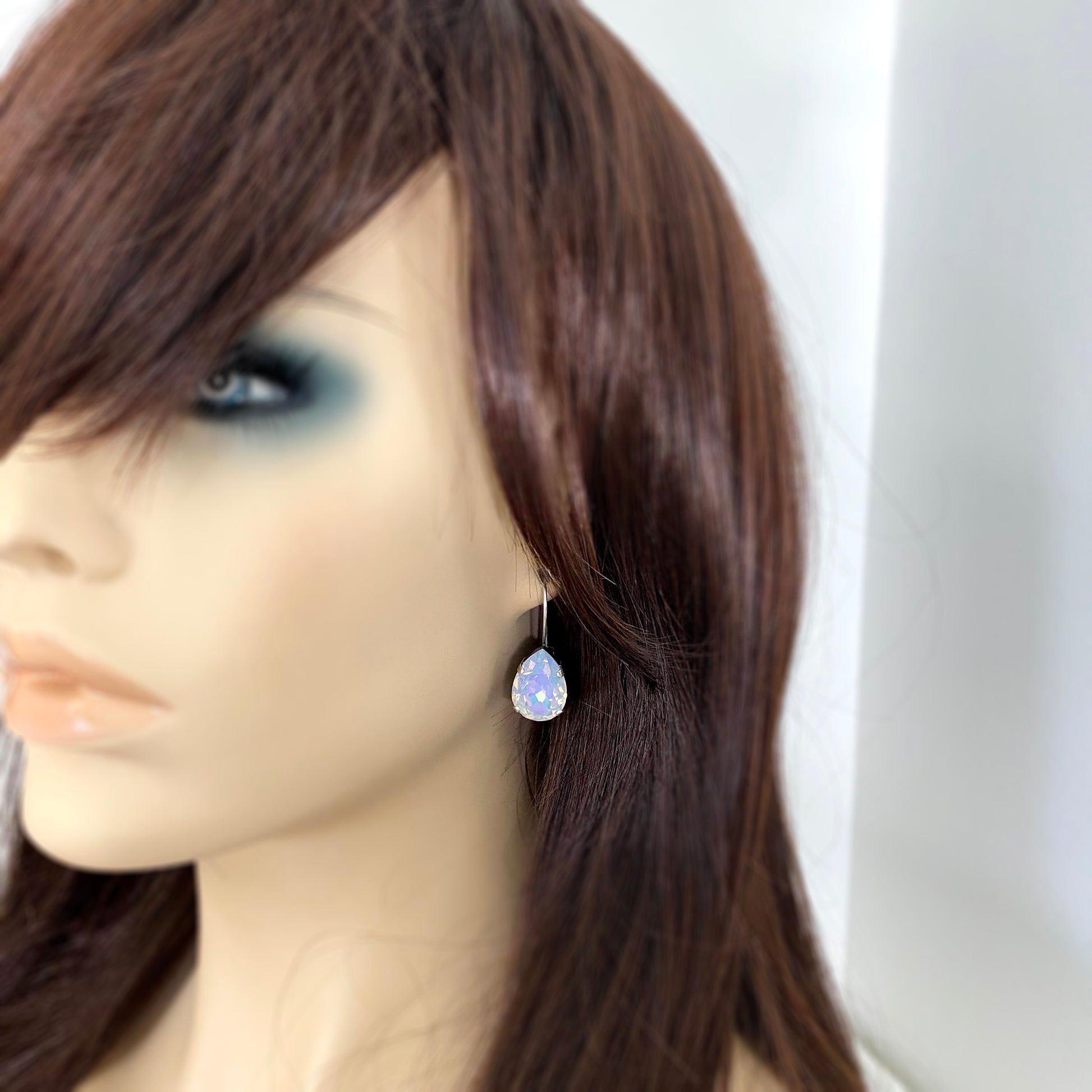 Make a statement with the largest pear earrings in an even longer earring. These feature kidney earring wires which clasp closed at the bottom for a secure fit while dancing the night away. Shown in white opal light vitrail Swarovski® crystals.