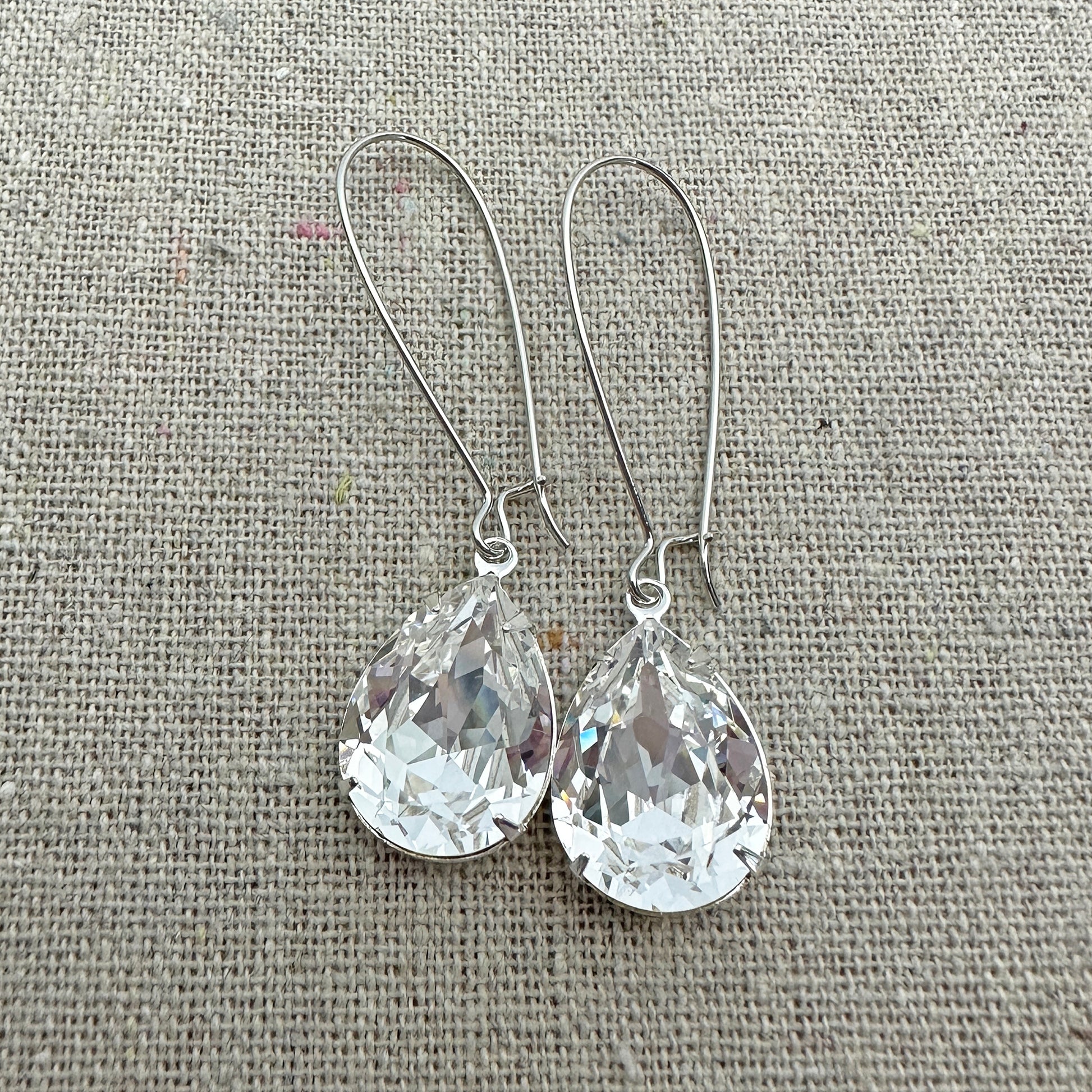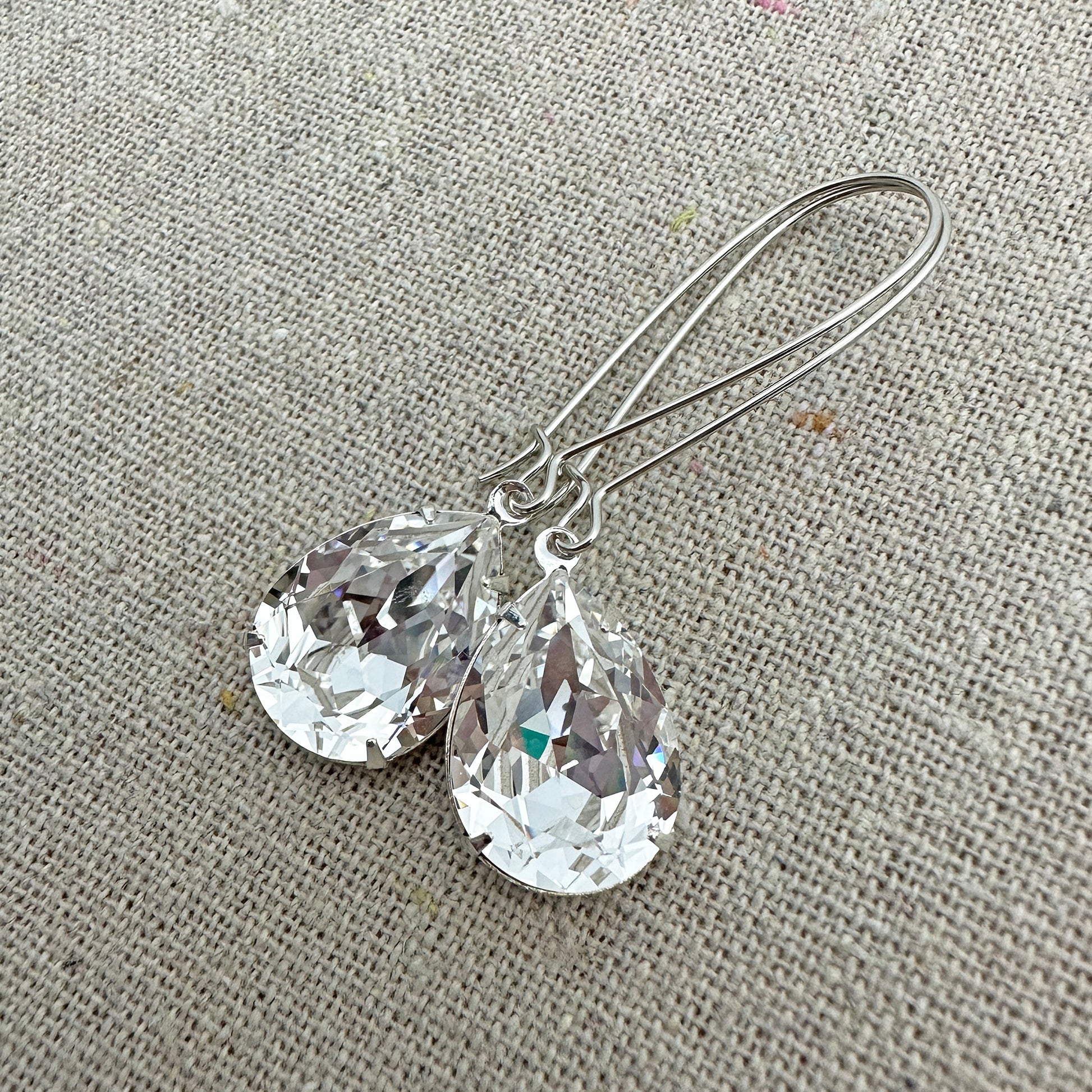 Long dangling earrings that will swing back and forth from your lobes without being heavy and weighing you down. Simple pear shape Swarovski® crystals dangle beneath earring wires that clip shut at the bottom. These earrings are also perfect if you're someone who's prone to losing earrings.