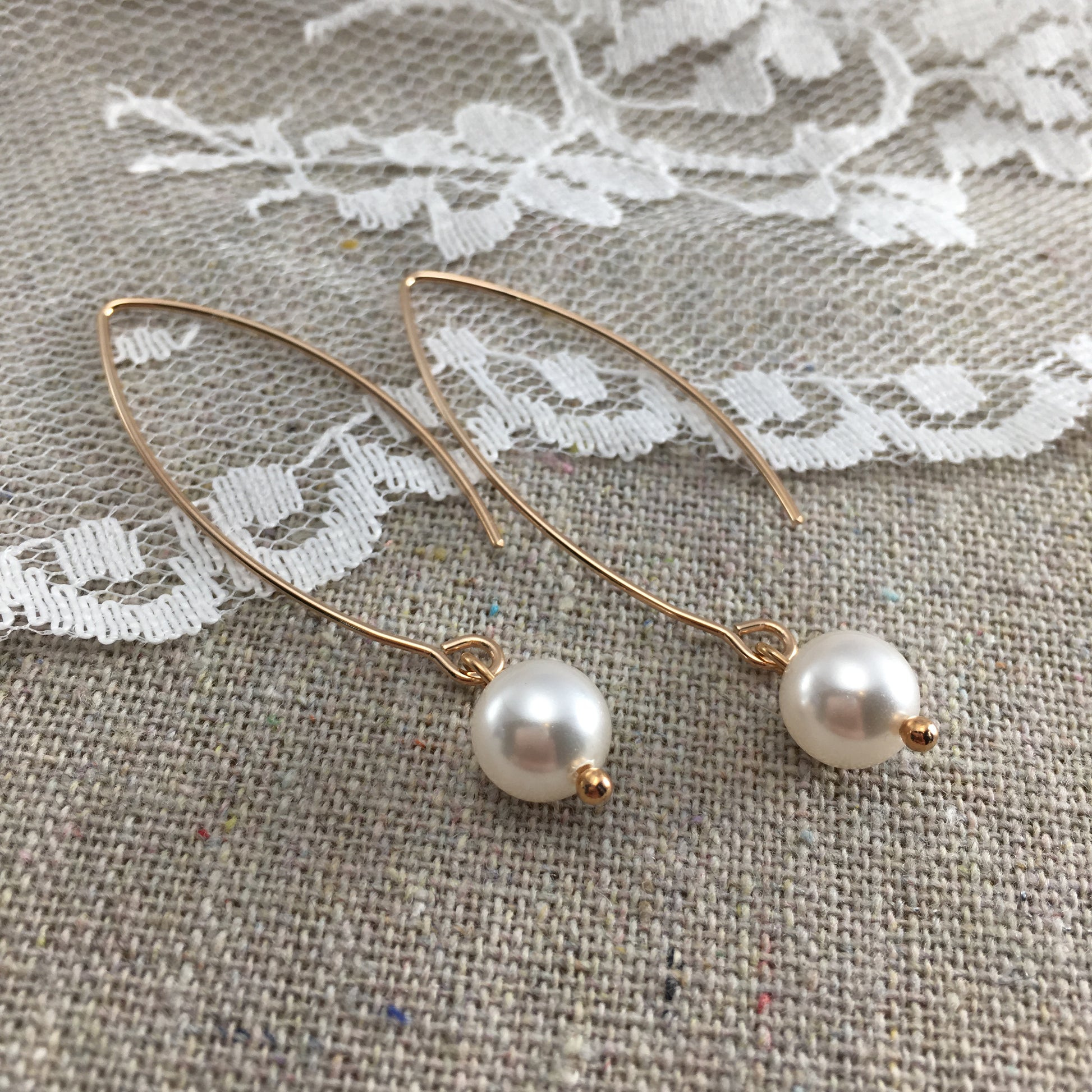 Pearl earrings are one of the most popular jewelry accessories you'll find in any woman's jewelry box. These earrings add a little drama with their long, hand formed earring wires in an arched marquise. Dripping from the end is a single Swarovski® crystal pearl.