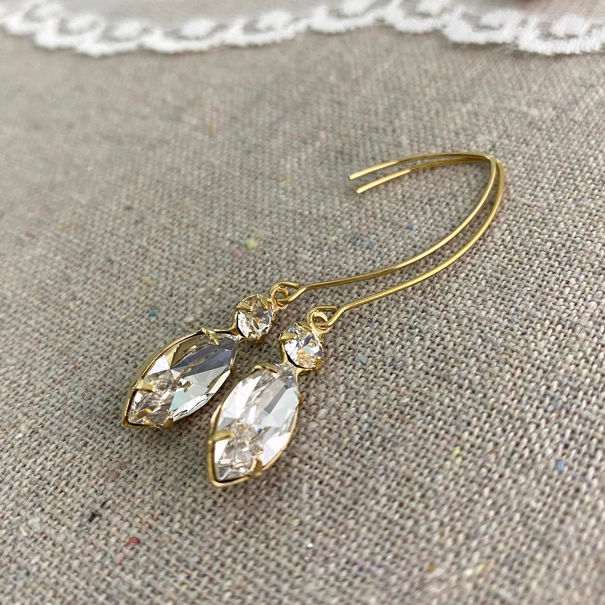 Elegant linear drop earrings featuring tiny chaton and marquise Swarovski® crystals in crystal clear are set in this simple setting that dangles from a marquise earring wire.
