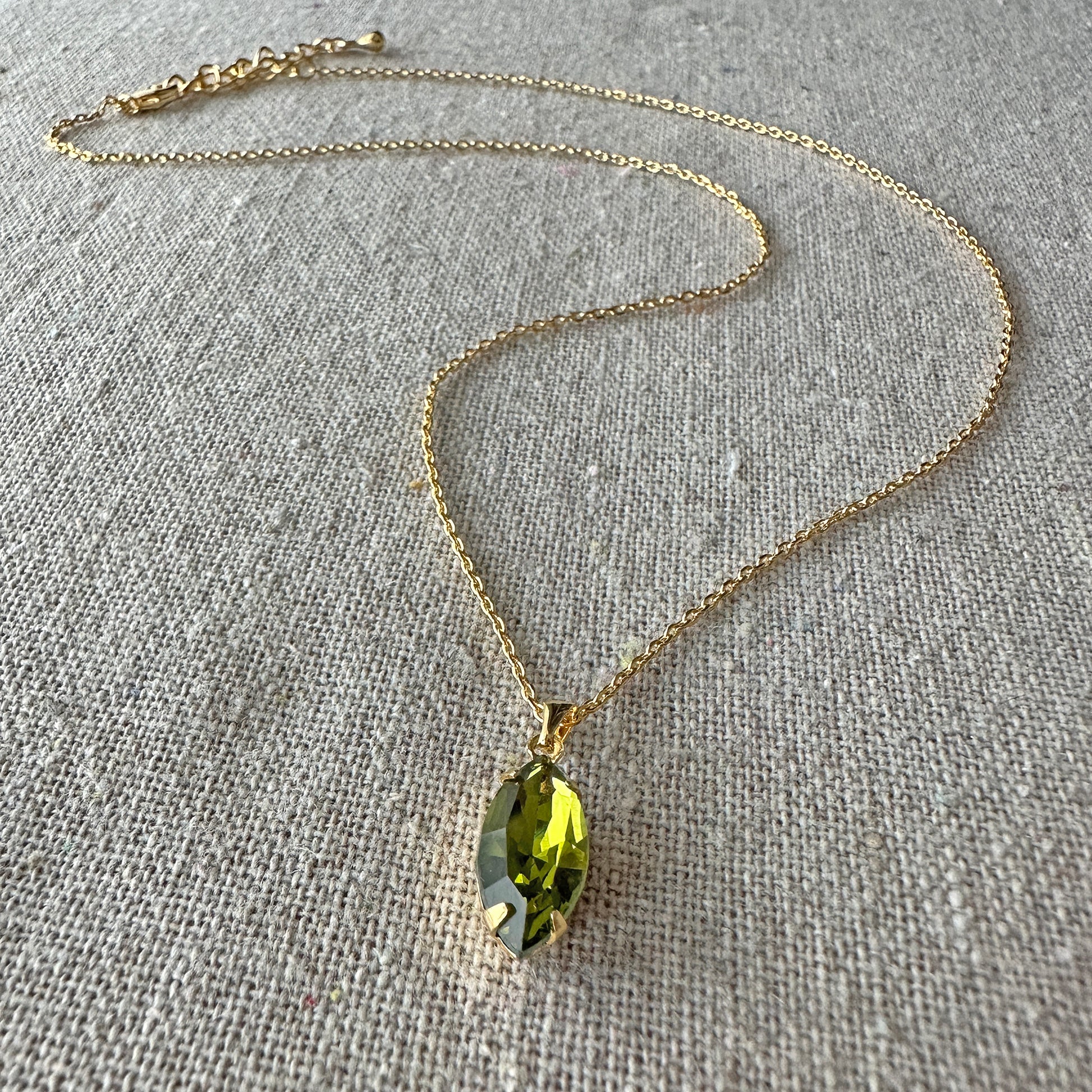 A simple necklace featuring a marquise pendant made using a Swarovski® crystal in your color choice. Wear this alone for a minimalist look or layer it for more drama. Shown in olivine and gold plated.
