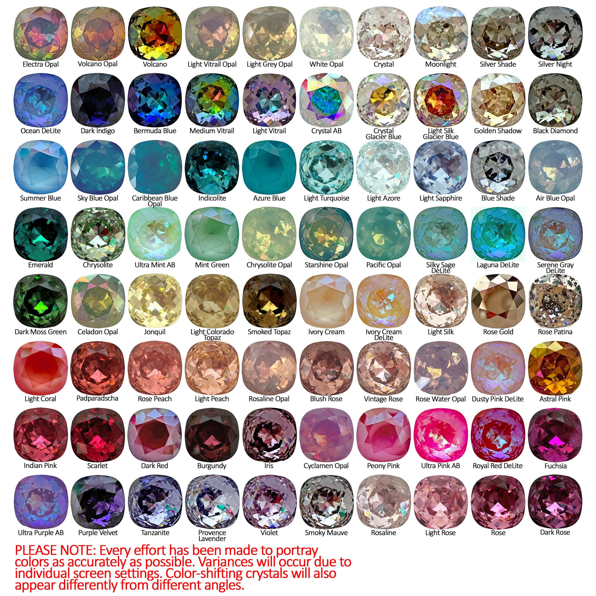Cushion cut Swarovski® crystals set in delicate clover crown edge settings in solid brass plated in your choice of precious metal. Shown here in Moonlight in rose gold.