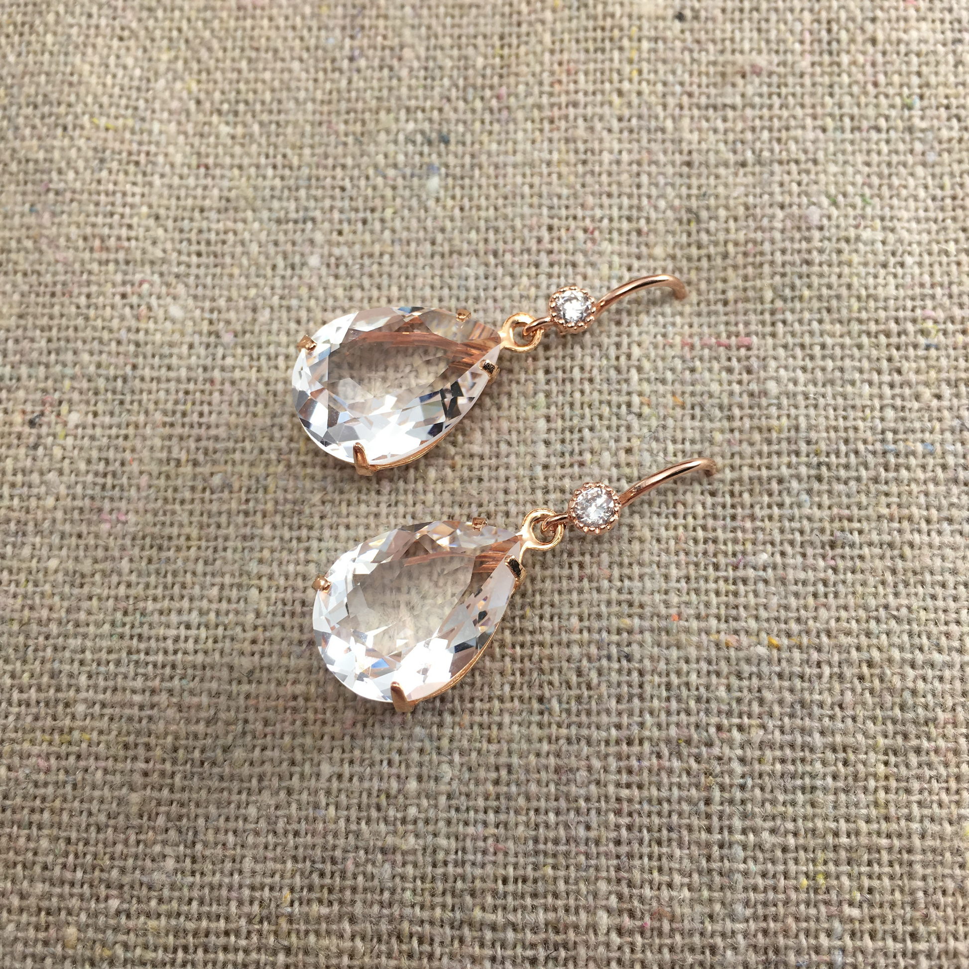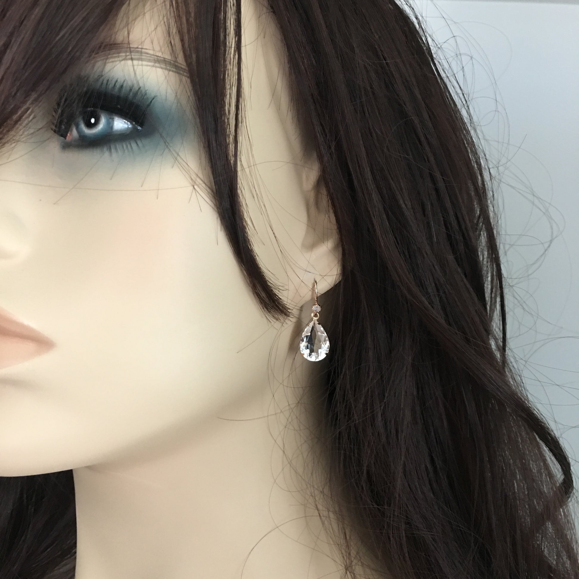 A simple design of pear Swarovski® crystals dangling from an earring hook with a tiny cut cubic zirconia. Shown in the 'Crystal Clear' option, which unlike most crystals has no mirror backing and is completely colorless and transparent.