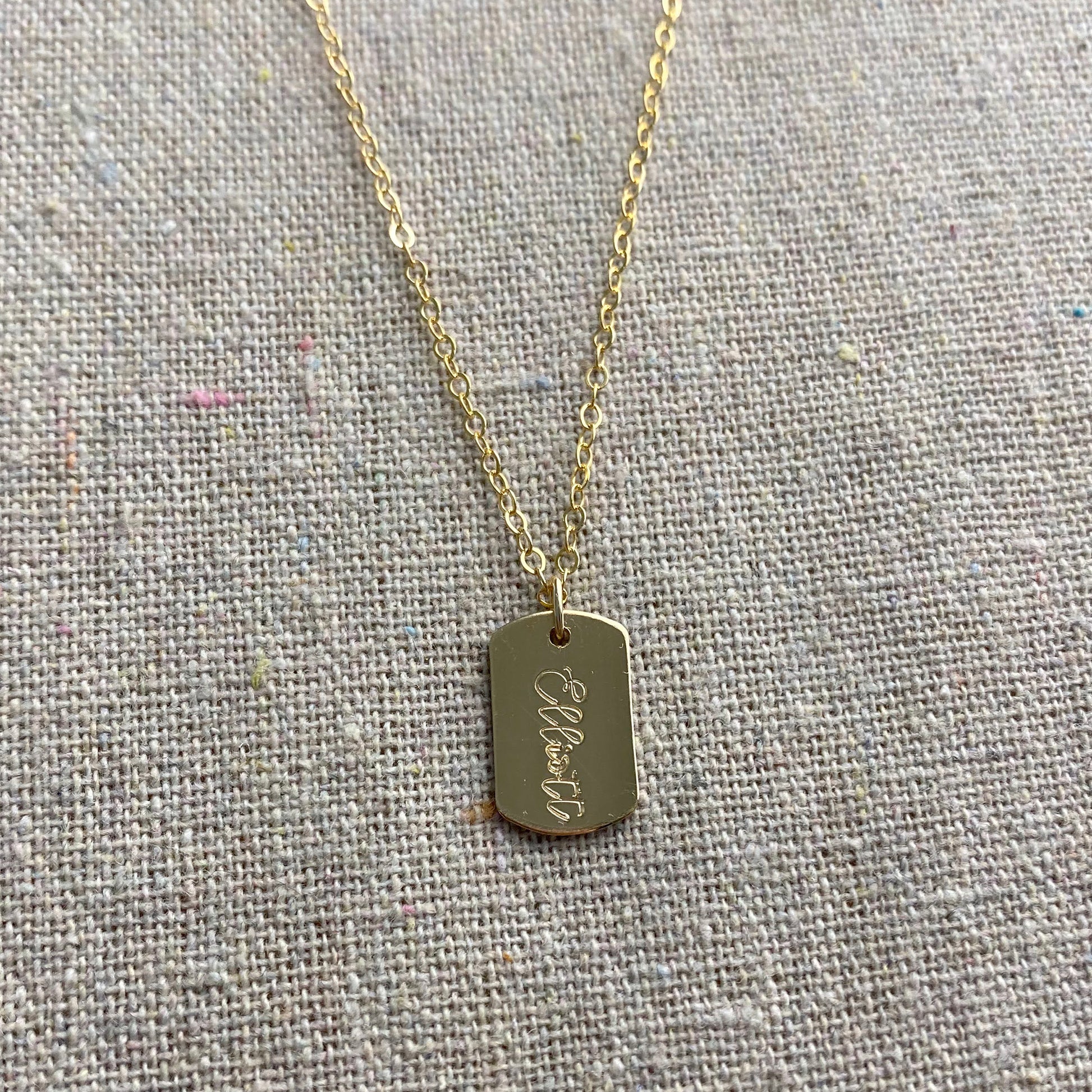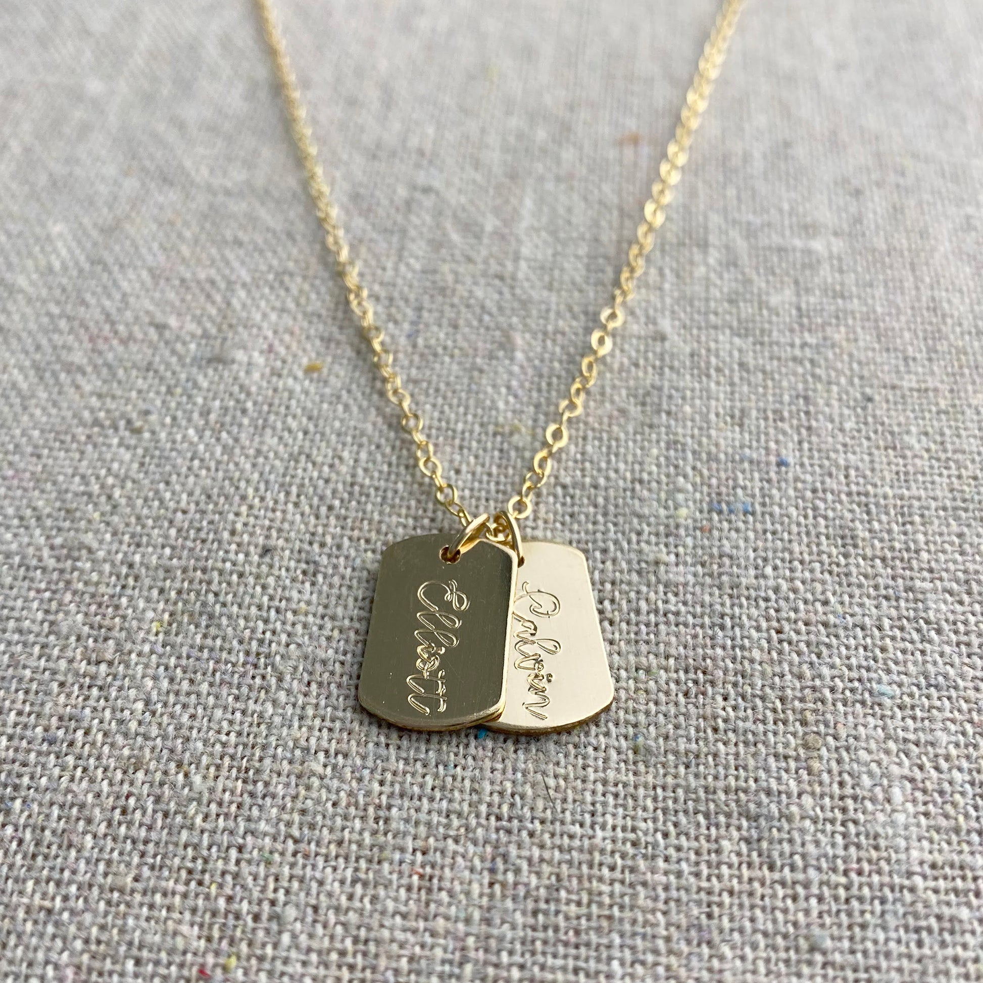 A sweet minimalist necklace that will quickly become a favorite. Small cursive letters are carefully hand stamped, one by one, onto the tags to create a beautiful engraved appearance. However unlike engraving which is done by a computer, with stamping there will be tiny imperfections which add to the character of the piece making them truly one-of-a-kind.