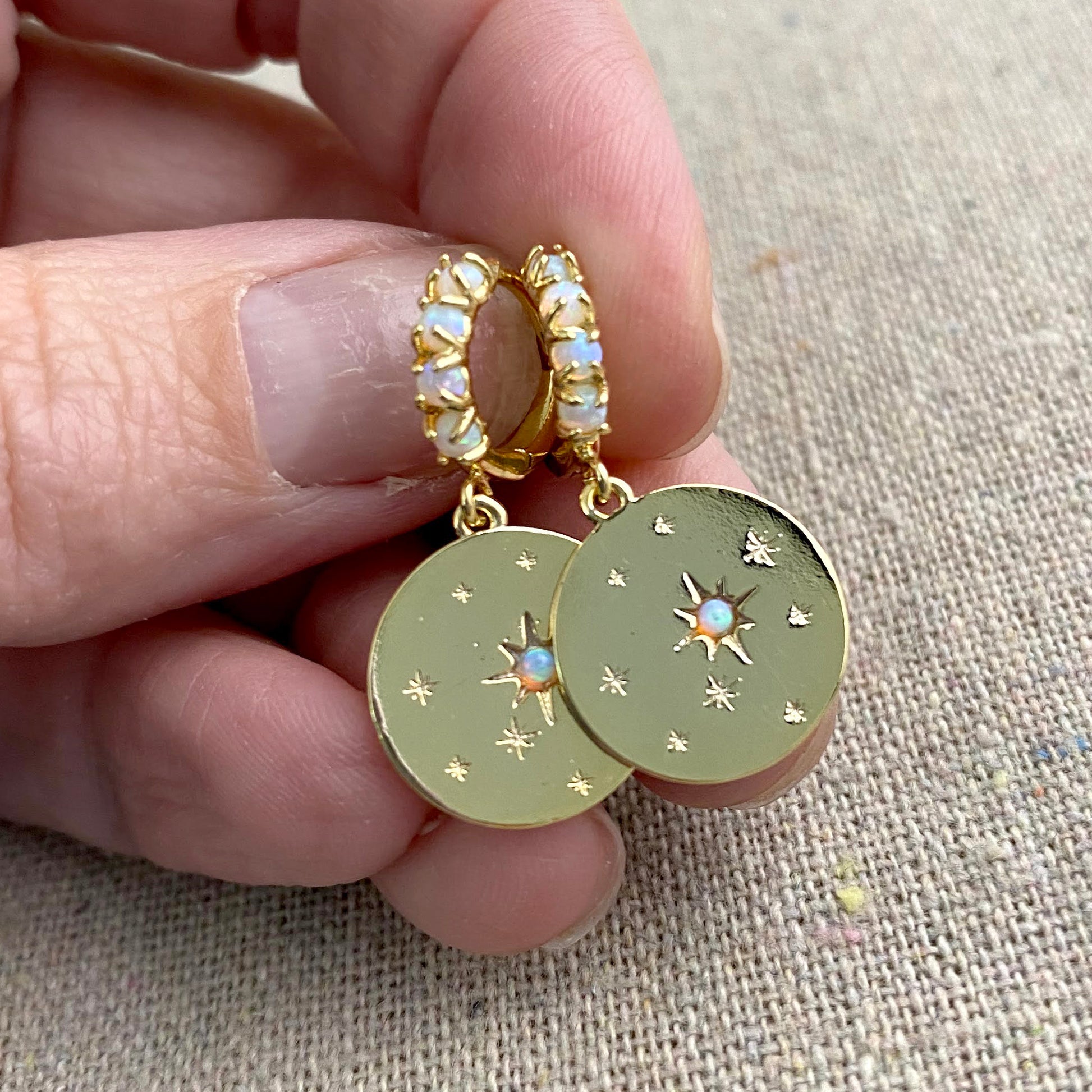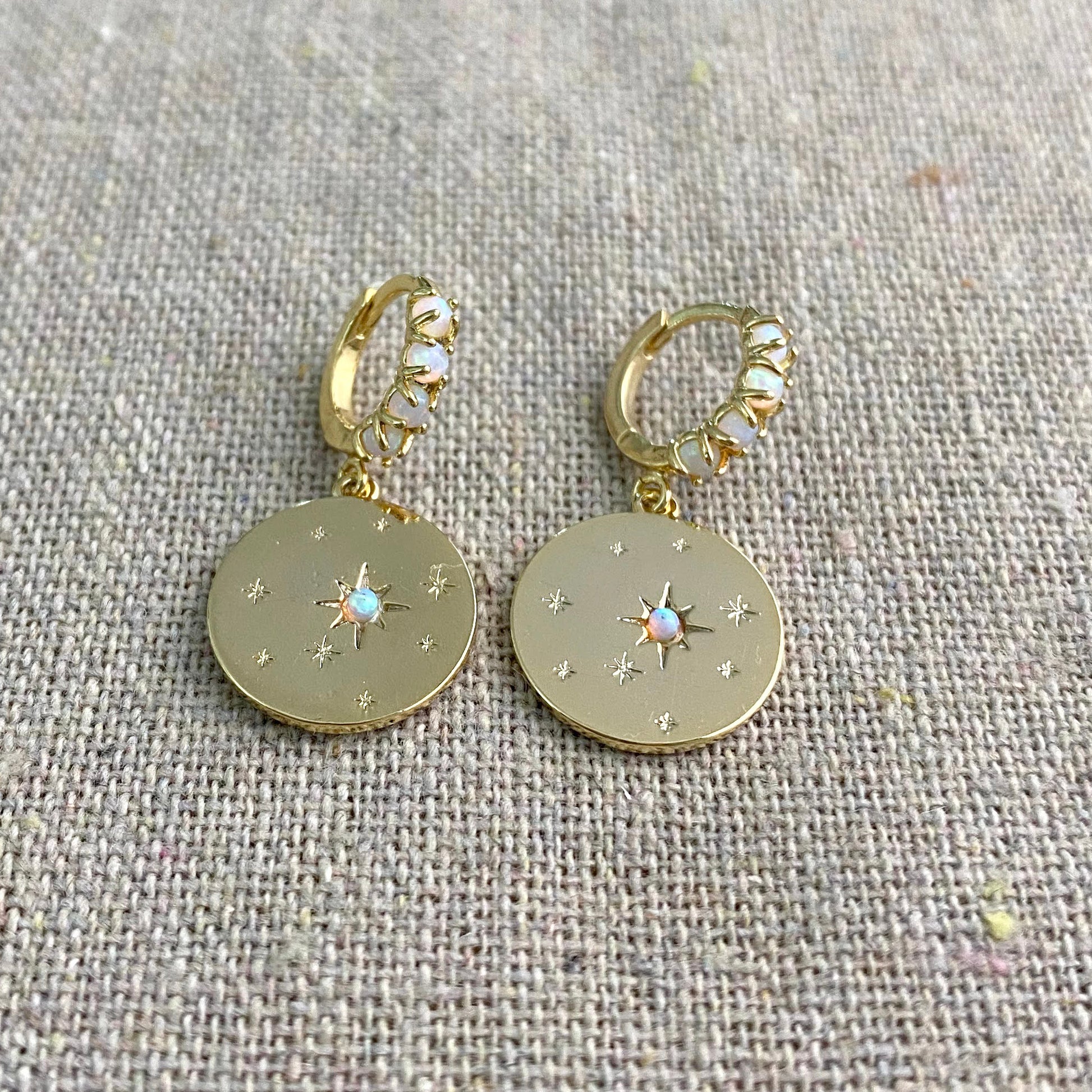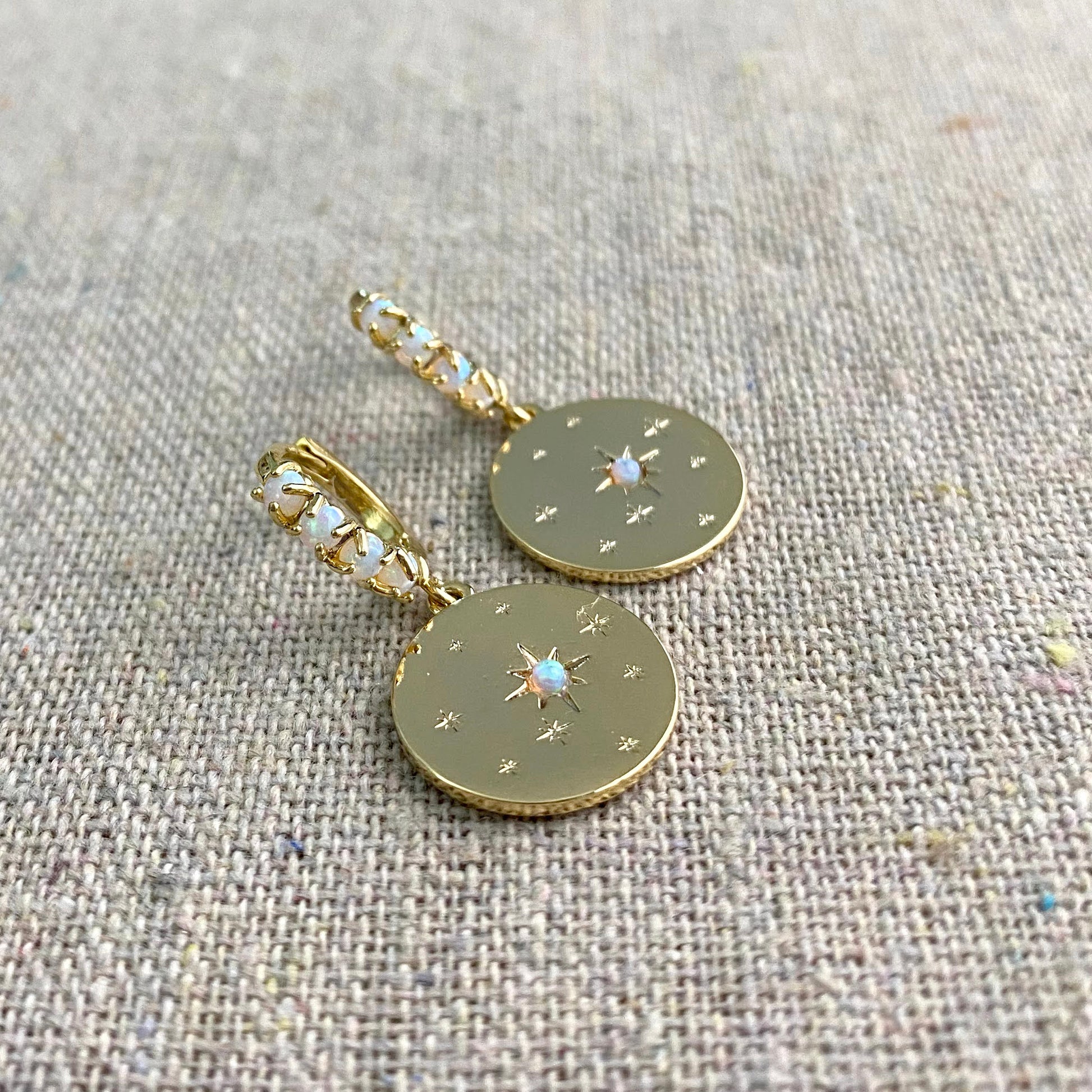You'll quickly become obsessed with these gorgeous earrings. A row of tiny glowing lab opals line the small huggie hoops which latch securely in the back. Hanging beneath is a polished coin charm with small sparkling stars and one larger North Star with a lab opal center. Find the matching necklace here.
