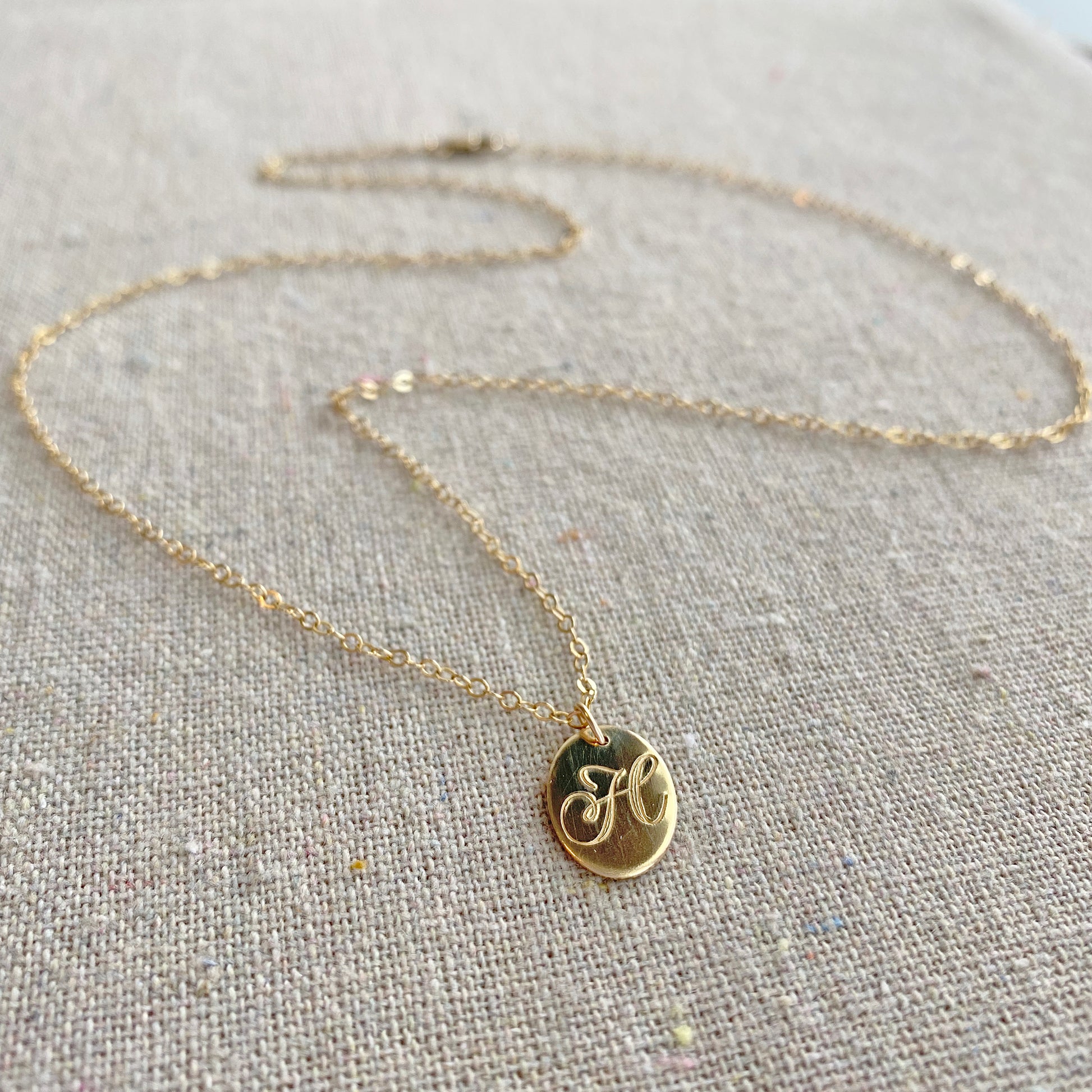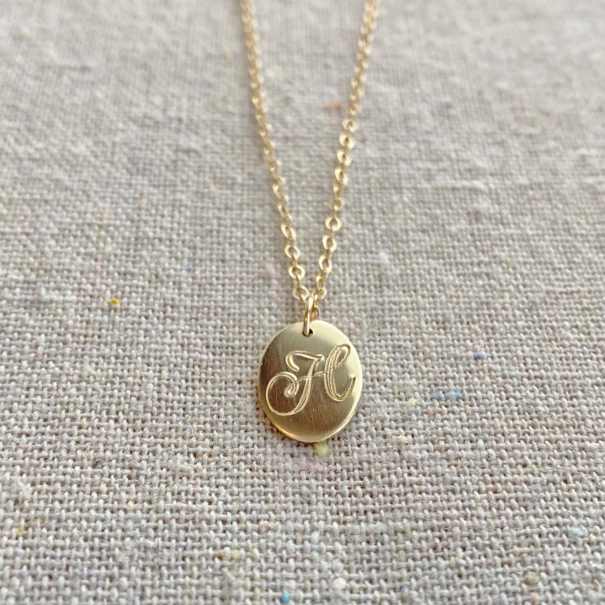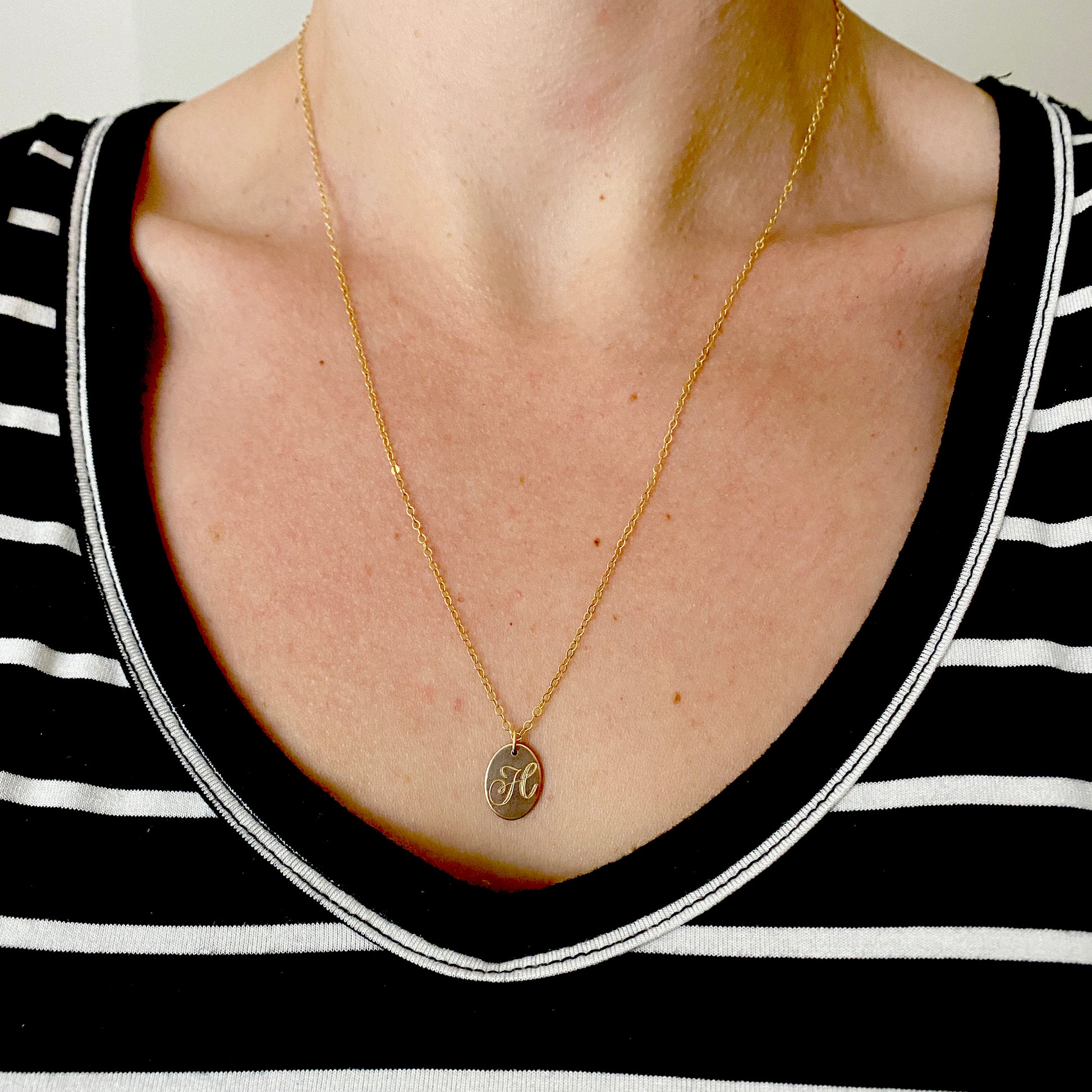 A perfect accessory for everyday that is lovely alone or layered with other necklaces. A dainty oval pendant with a hand-stamped cursive initial in your letter choice hangs from a delicate cable chain that fastens with a sturdy lobster claw clasp. Pair it with the sideways cross necklace shown in the photos here.
