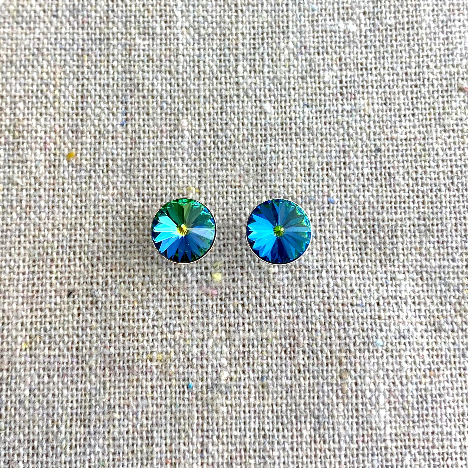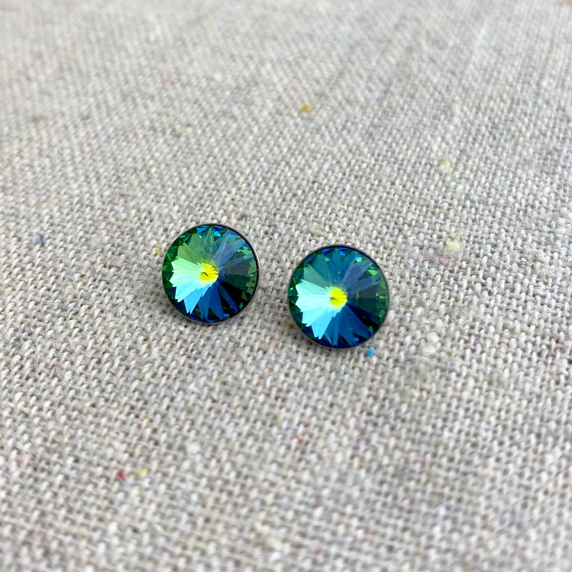 The perfect earrings for anyone with metal allergies. The Peak earrings are made using 8mm Rivoli cut Swarovski® crystals. Shown in the color crystal green sphinx.