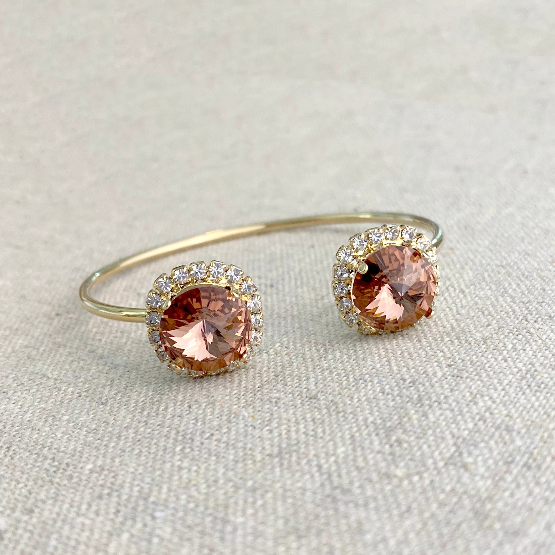 The perfect bracelet for your big day or any day that needs a little extra sparkle. Two 12mm Rivoli cut Swarovski® crystals set within a halo of smaller Swarovski® crystals on an open bangle. Shown in Dusty Rose with and gold finish.