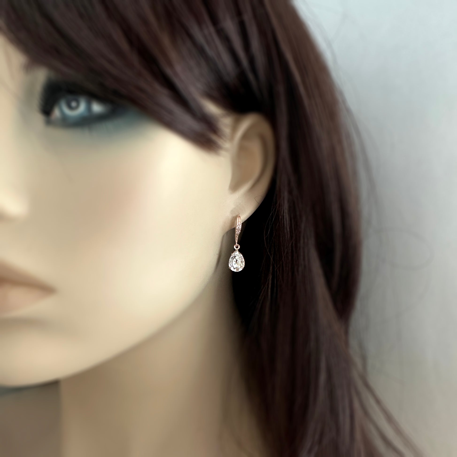 A simple design of small pear Swarovski® crystals dangling from earring hooks with delicate pavé details. Shown in crystal and rose gold options.