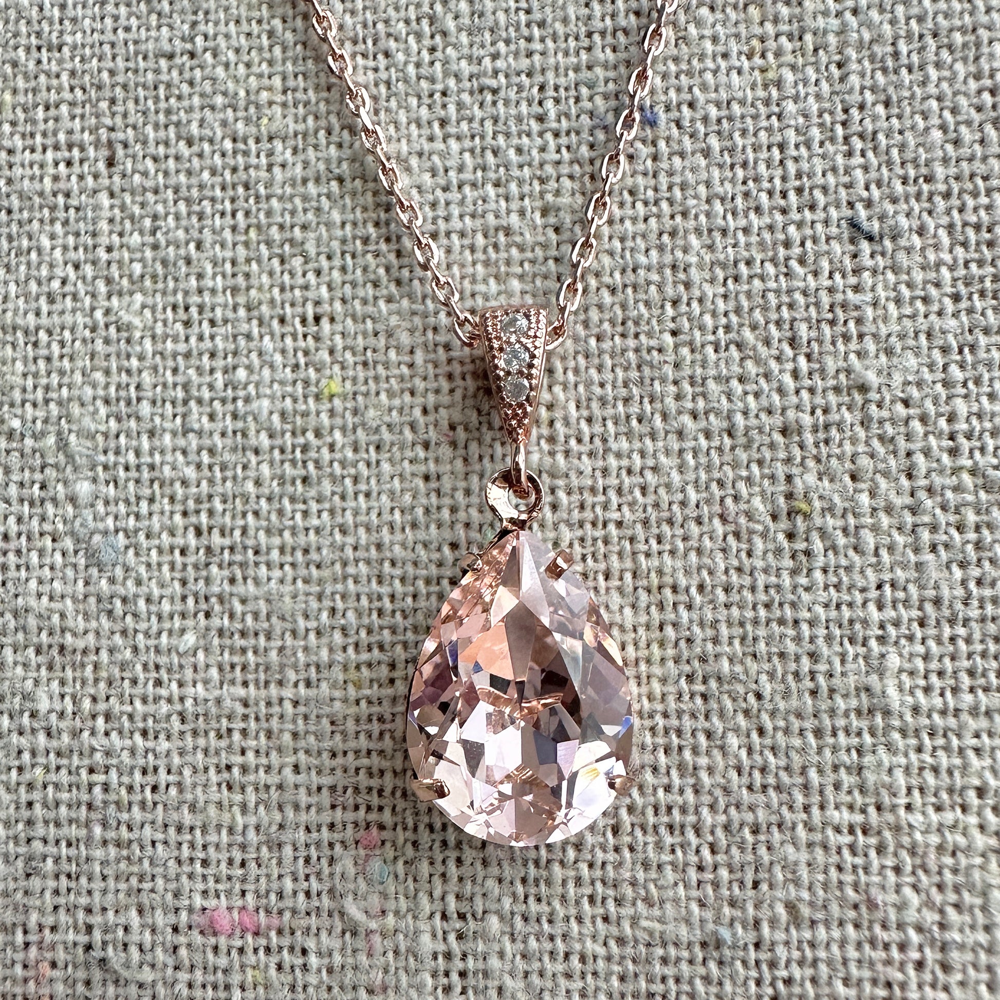 A single pear shaped Swarovski® crystal in an open back setting on a fancy little cubic zirconia lined bail hanging on a delicate cable chain. Shown in vintage rose crystal and rose gold plating.