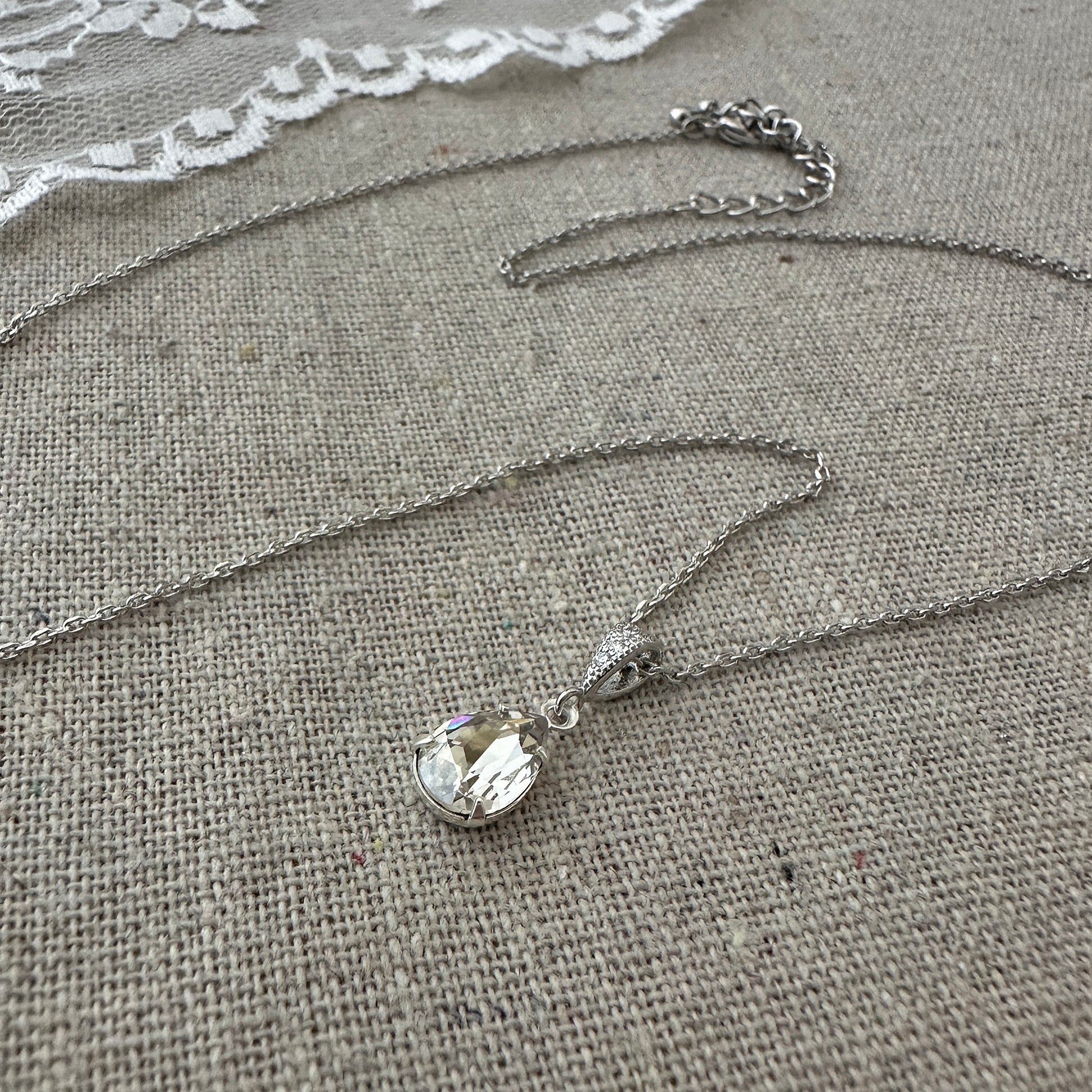 Gorgeous in its simplicity, this necklace features a pear Swarovski® crystal set in plated brass and dangling from a zirconia pave bail on a sparkling cable chain. Shown in silver shade and silver plating.
