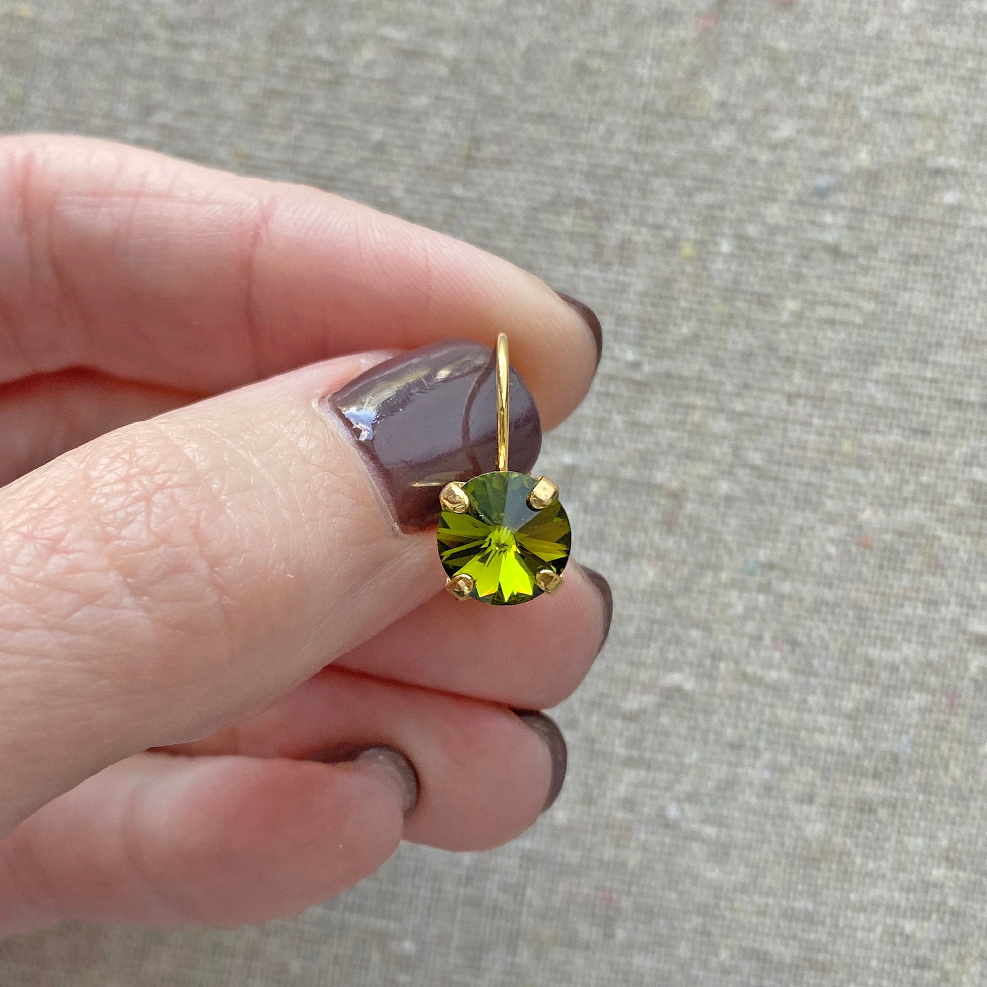 8mm Rivoli cut Swarovski® crystals set snugly in basic precious metal plated brass prong settings for a simple, chic everyday look. Dress these stunning earrings up for a wedding or casually for everyday wear. Shown in olivine and gold finish.