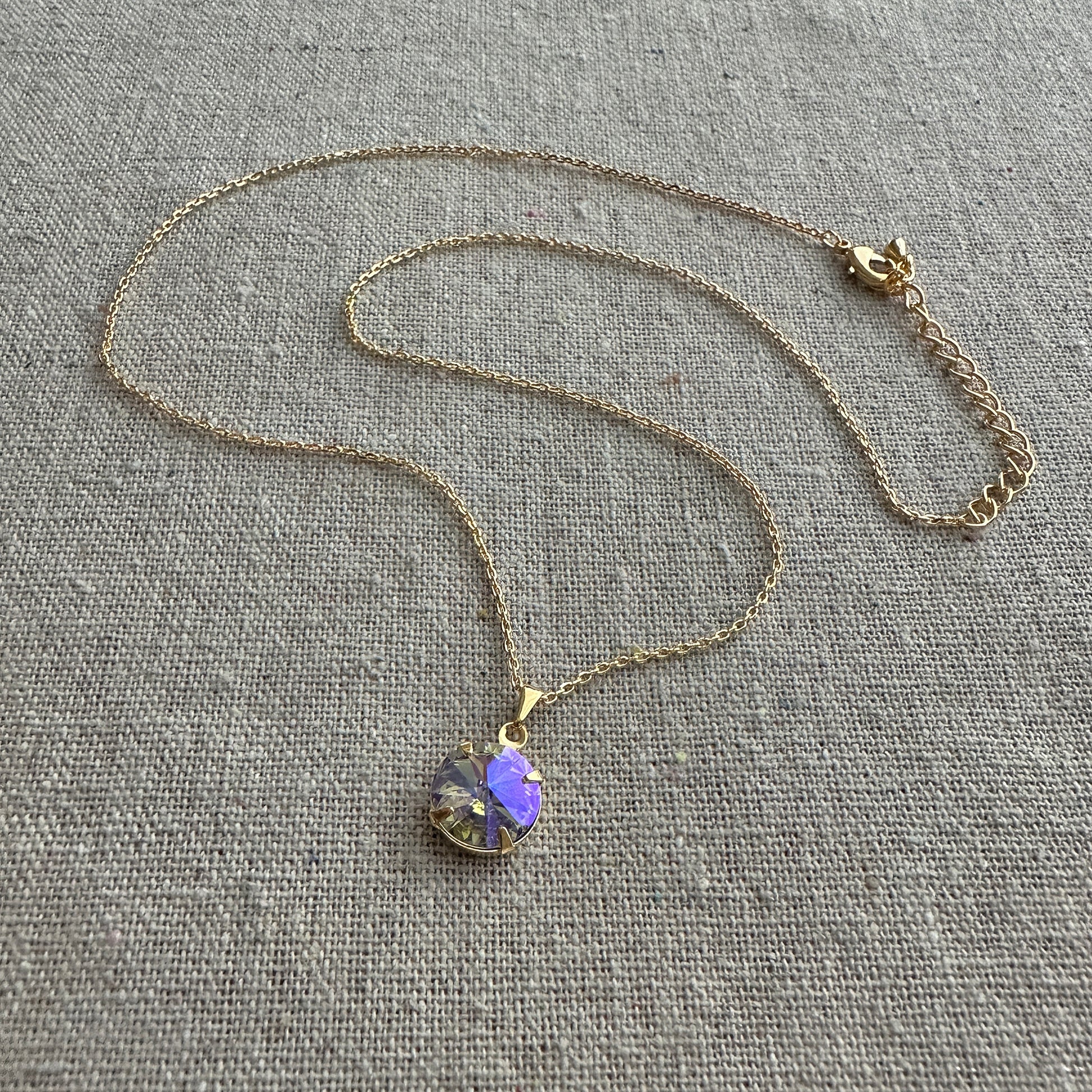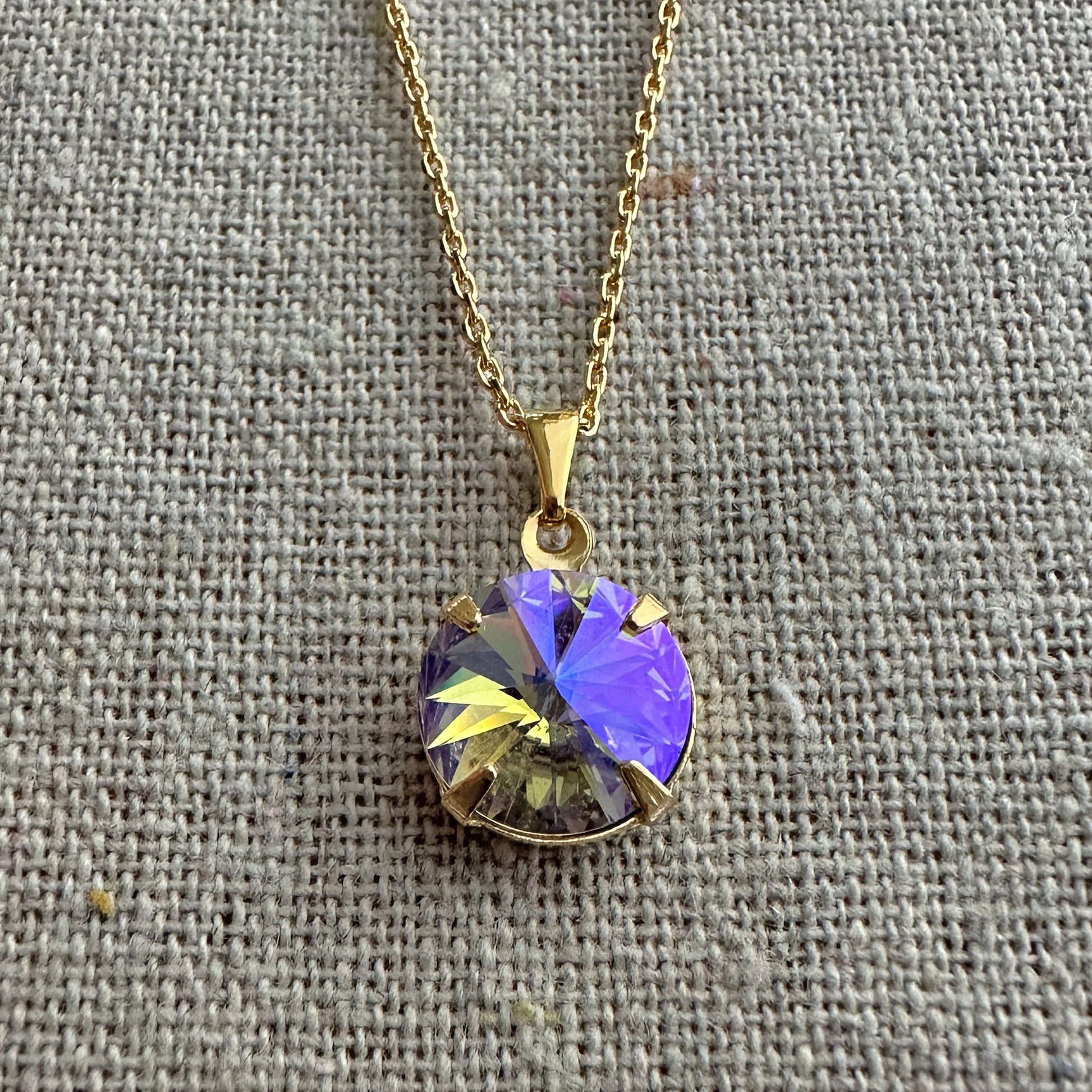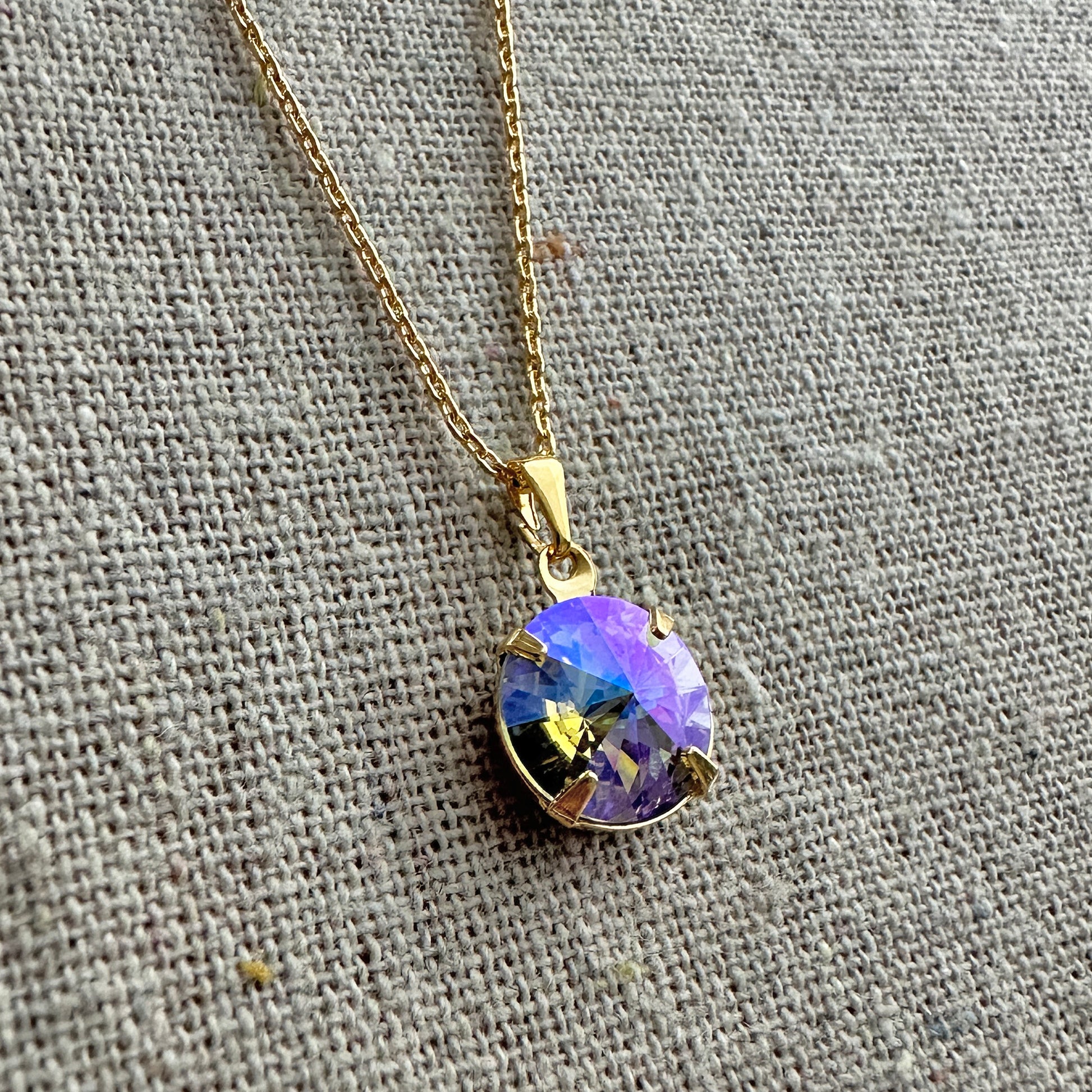 You simply won't be able to resist this simple solitaire necklace. A single 10mm rivoli cut Swarovski® crystal in a classic prong setting on a delicate cable chain. *Shown in Smoky Mauve Glacier Blue.