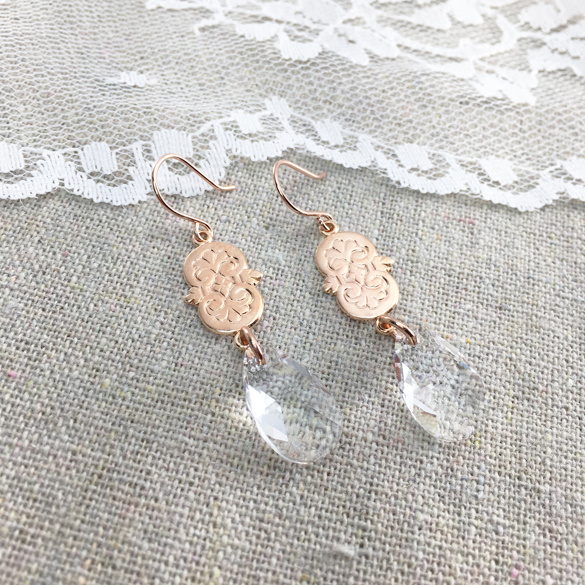 Delicate and lightweight with lots of movement, these scrollwork chandelier earrings are perfect for your formal event while still being understated. Made using vintage stampings and Swarovski® crystals. Shown in crystal and rose gold finish.