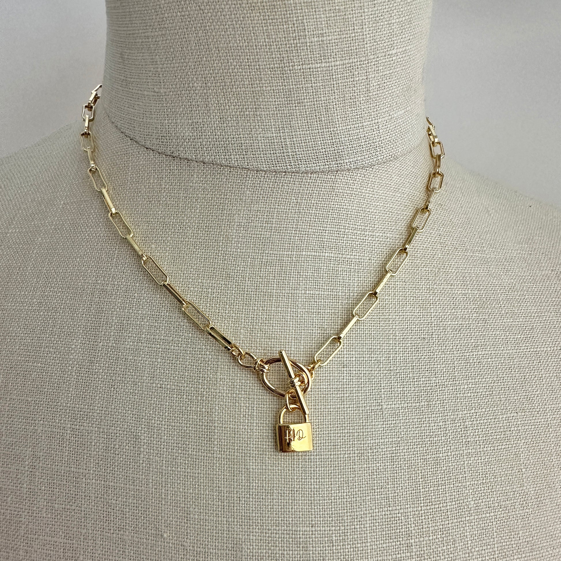 The Sentinel Padlock Necklace combines bold design with personalized elegance. Featuring a chunky paperclip chain and secure front toggle clasp, this statement piece showcases a striking padlock pendant customized with your initials. Perfect for layering or wearing solo, this necklace makes a confident statement.