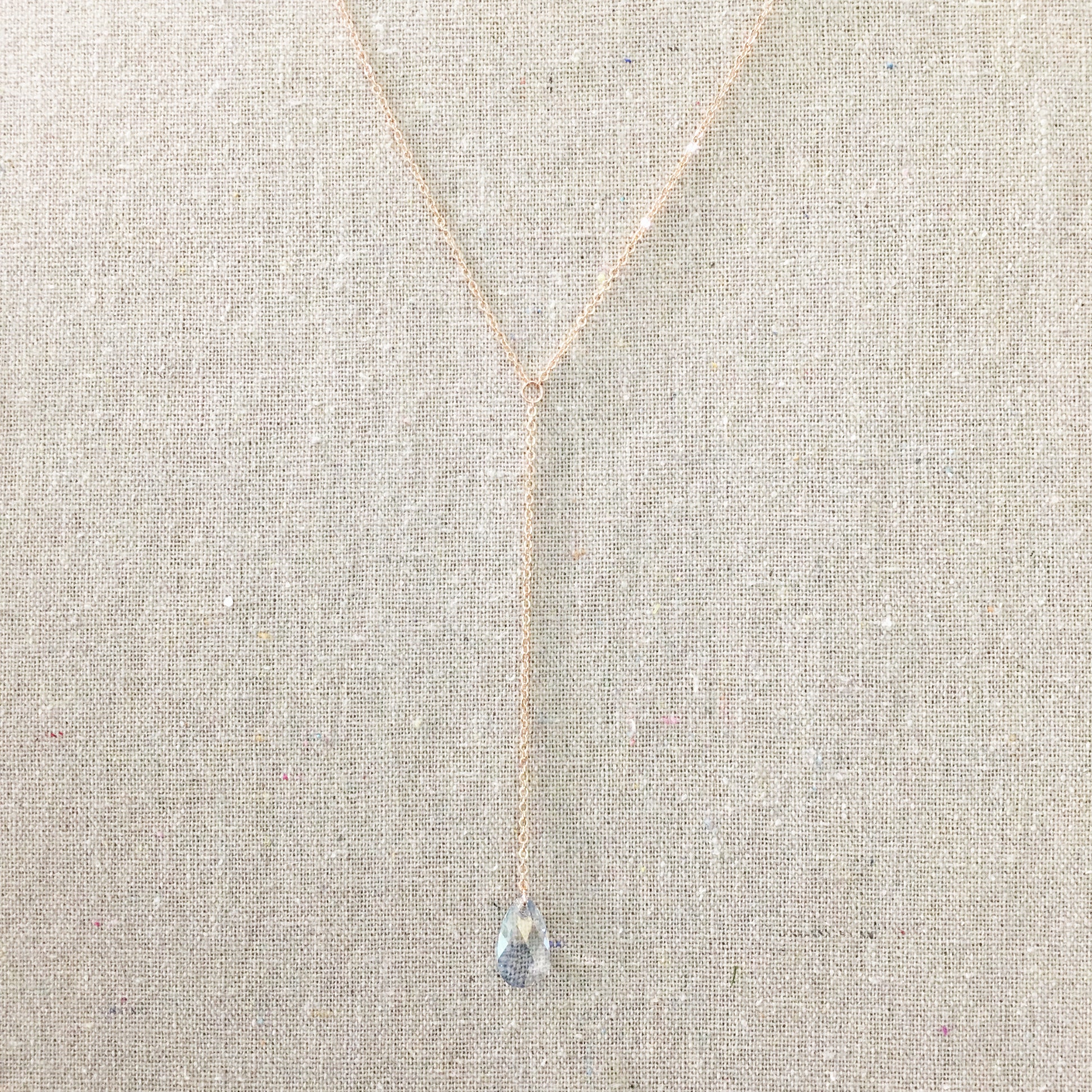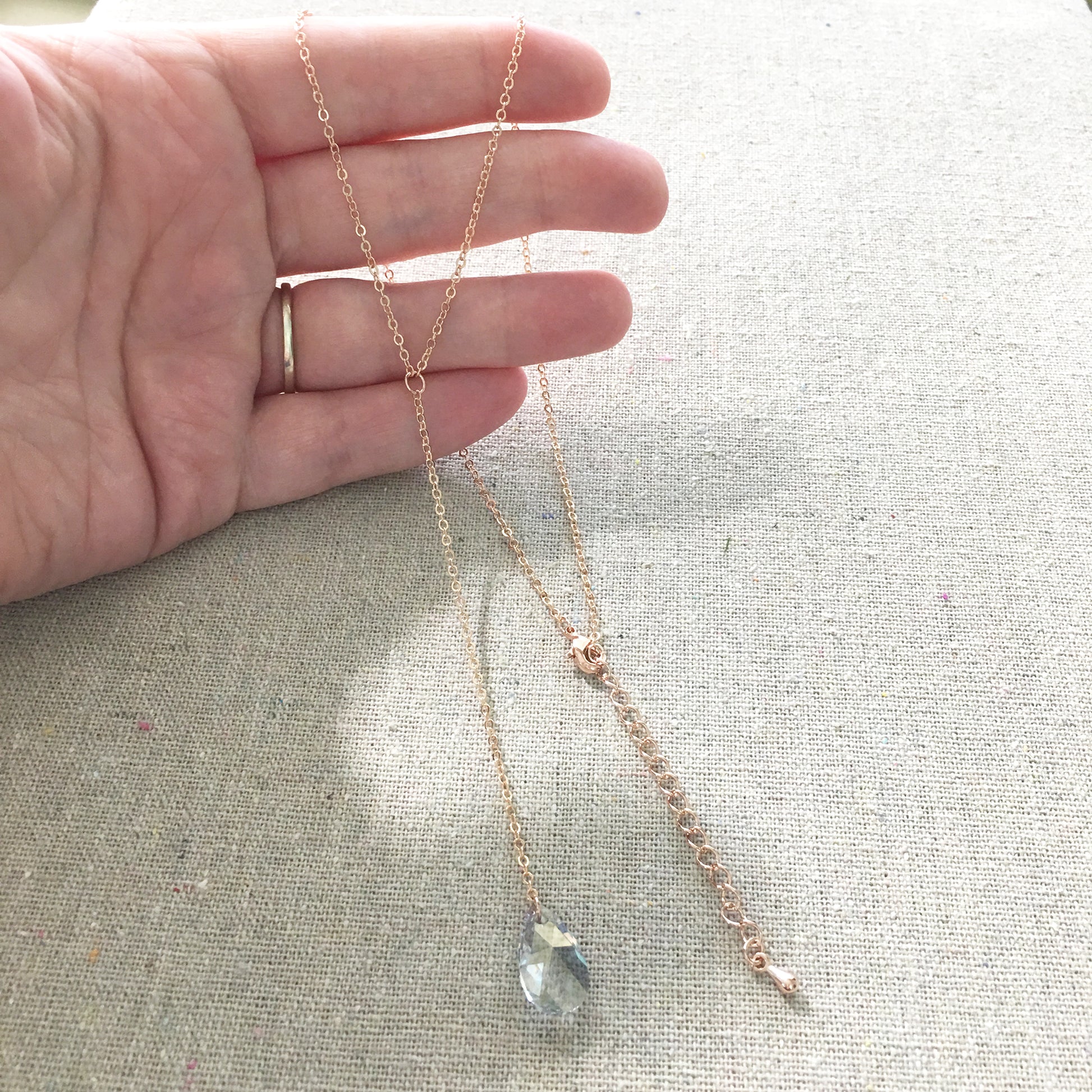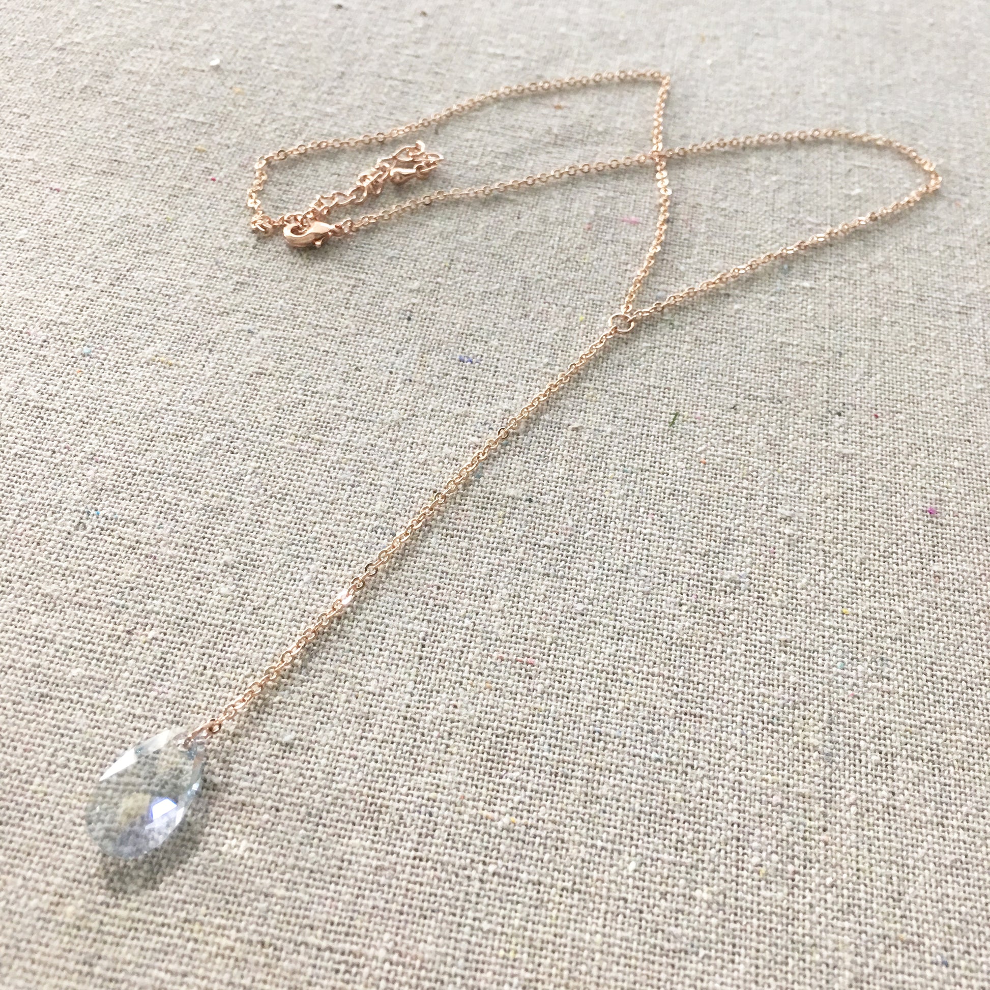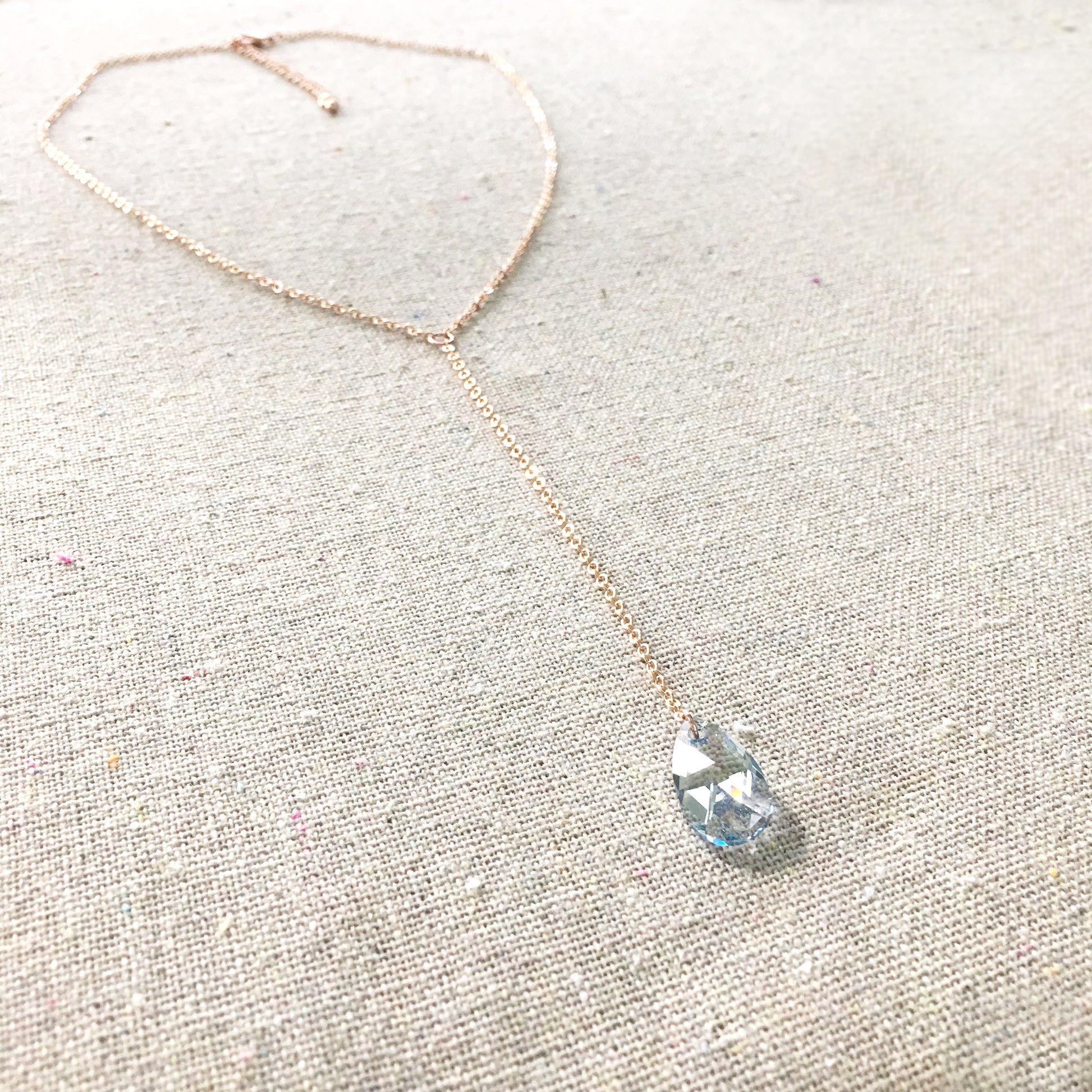 This delicate necklace is perfect for layering or wearing it alone. The chain is polished making the links glitter with each movement you make. Hanging from the bottom of the "Y" is a Swarovski® crystal teardrop. Shown in French Blue and rose gold finish.