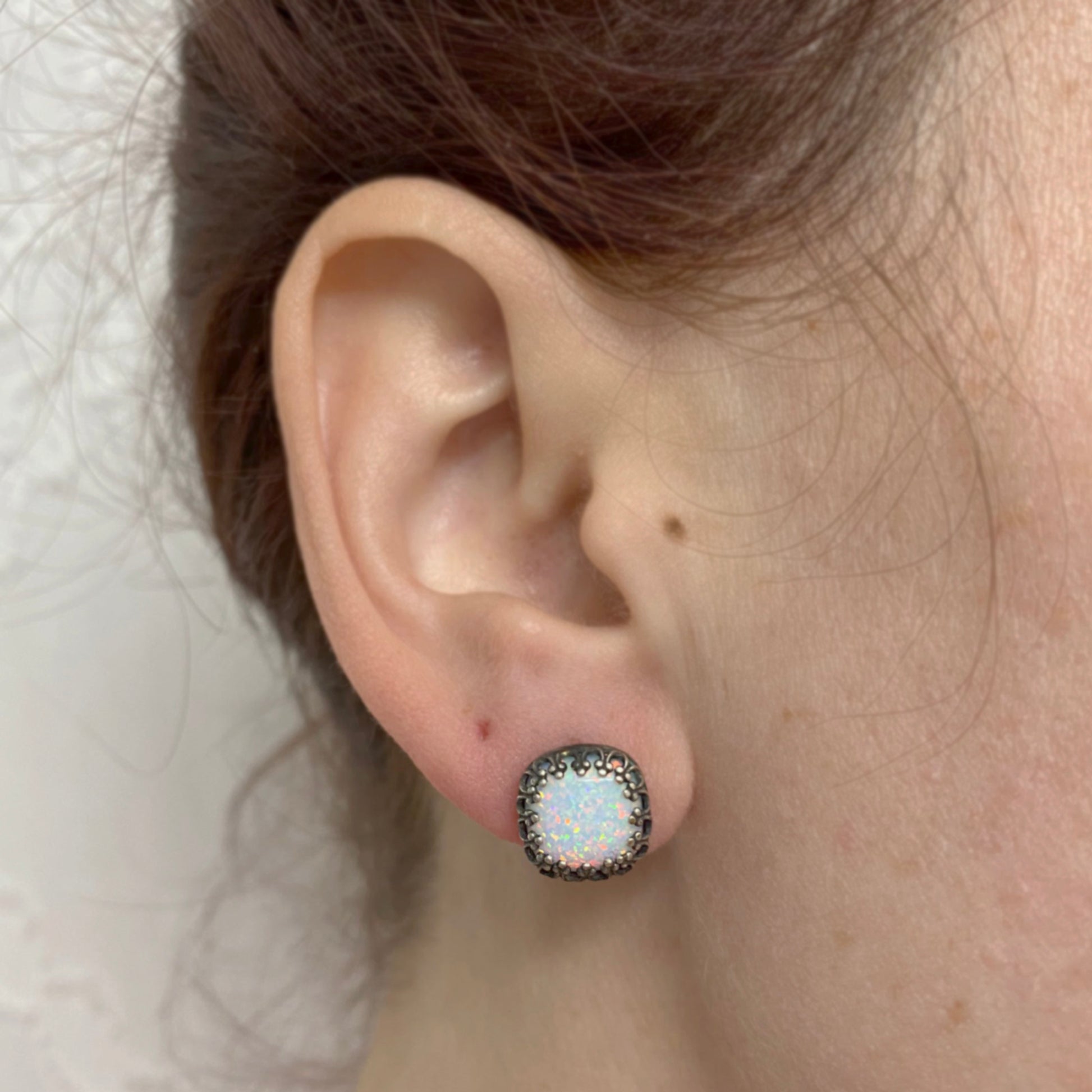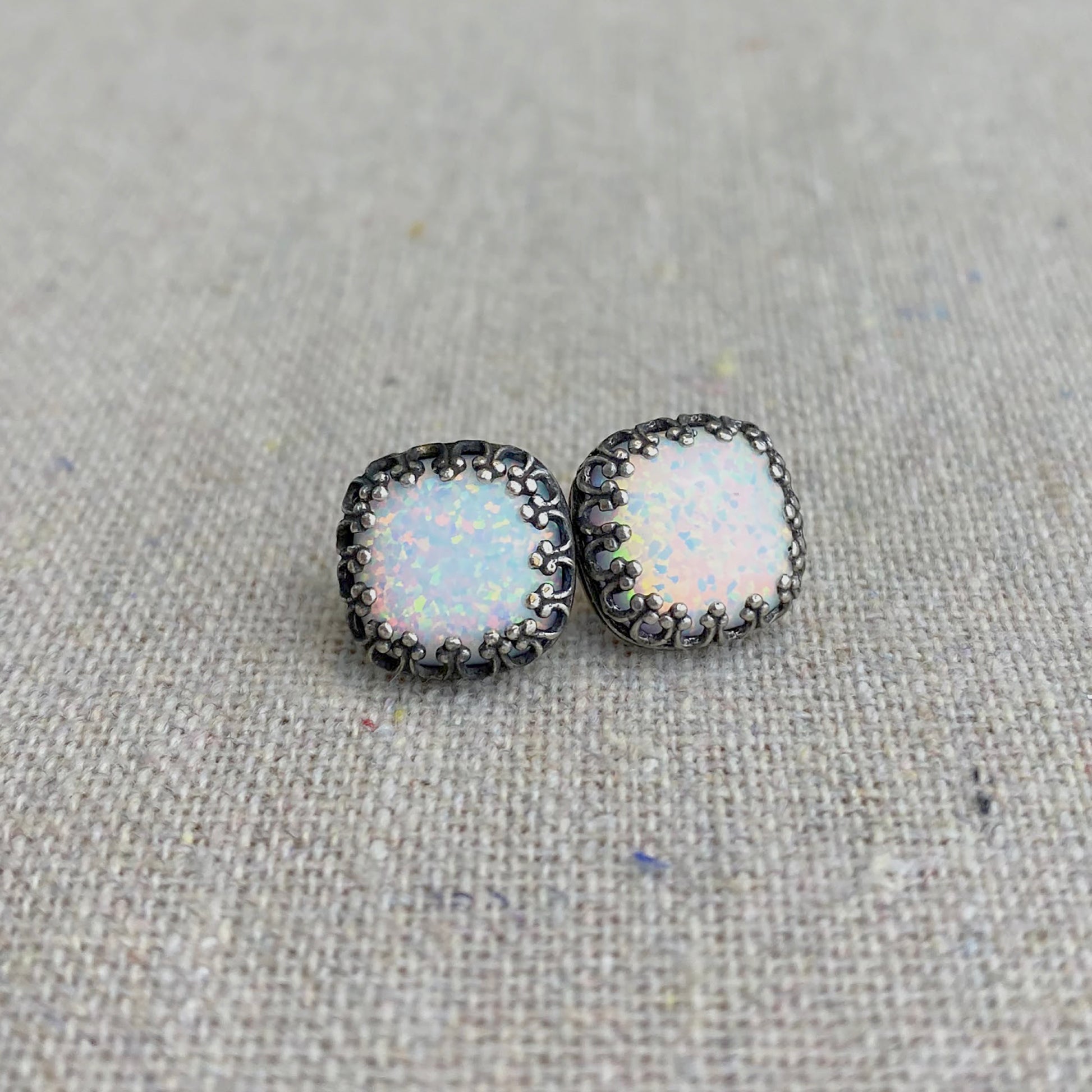 Gorgeous pure snowy winter white synthetic lab opals set carefully in delicate crown post earring settings.