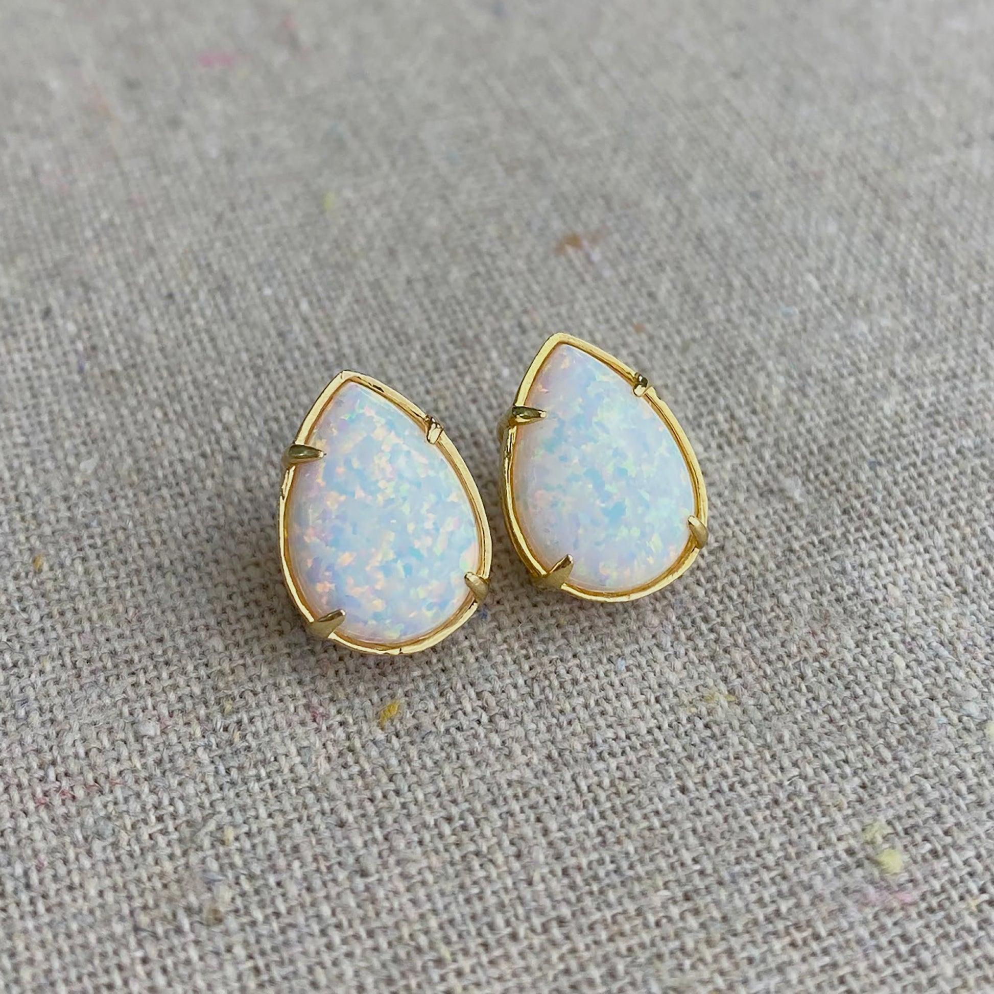 Magical looking synthetic lab opals in pure snowy winter white are set in classic prong earring settings making quite the statement. Not too big and not too small, these earrings dazzle for special occasions or everyday.