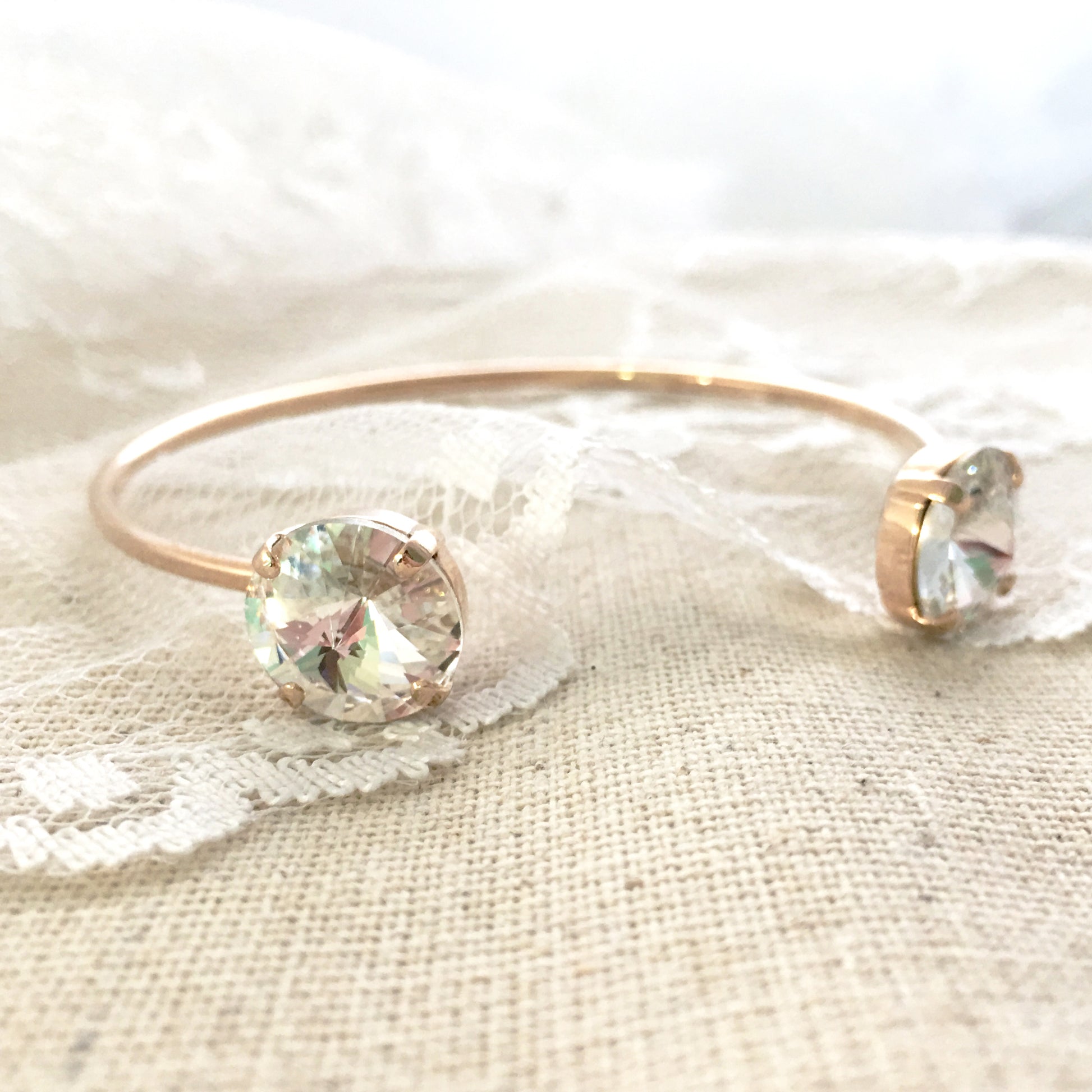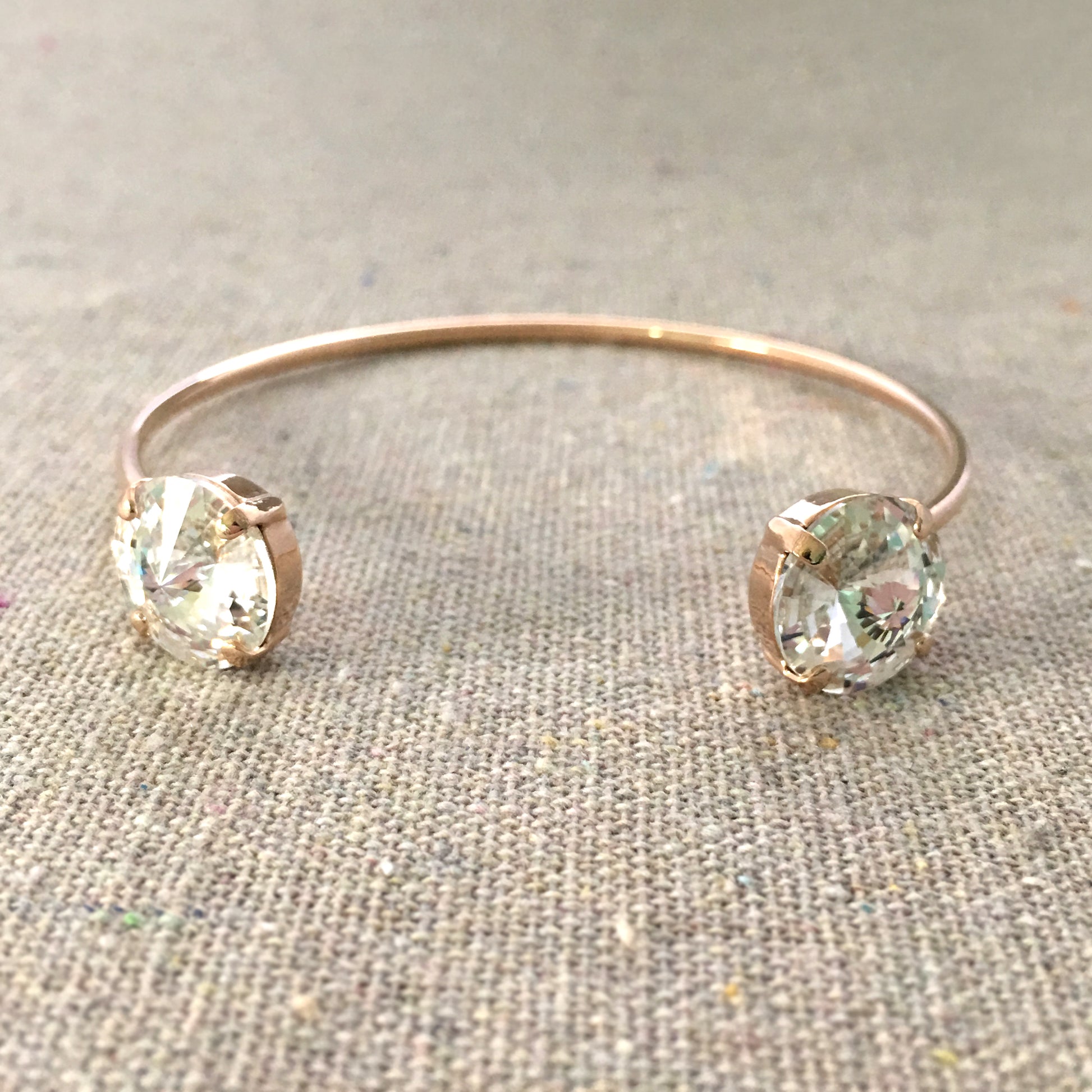 This bracelet, simply put, is a dream. It's so easy to grab and go when you want to wear something sparkly but you don't want to put too much effort into it. It goes with anything and can be easily adjusted with a gentle squeeze. Two 12mm rivoli cut Swarovski® crystals are set on each side. Rivoli is a really modern looking facet because rather than the top of the crystal being flat, it comes to a point sending prisms of light everywhere.