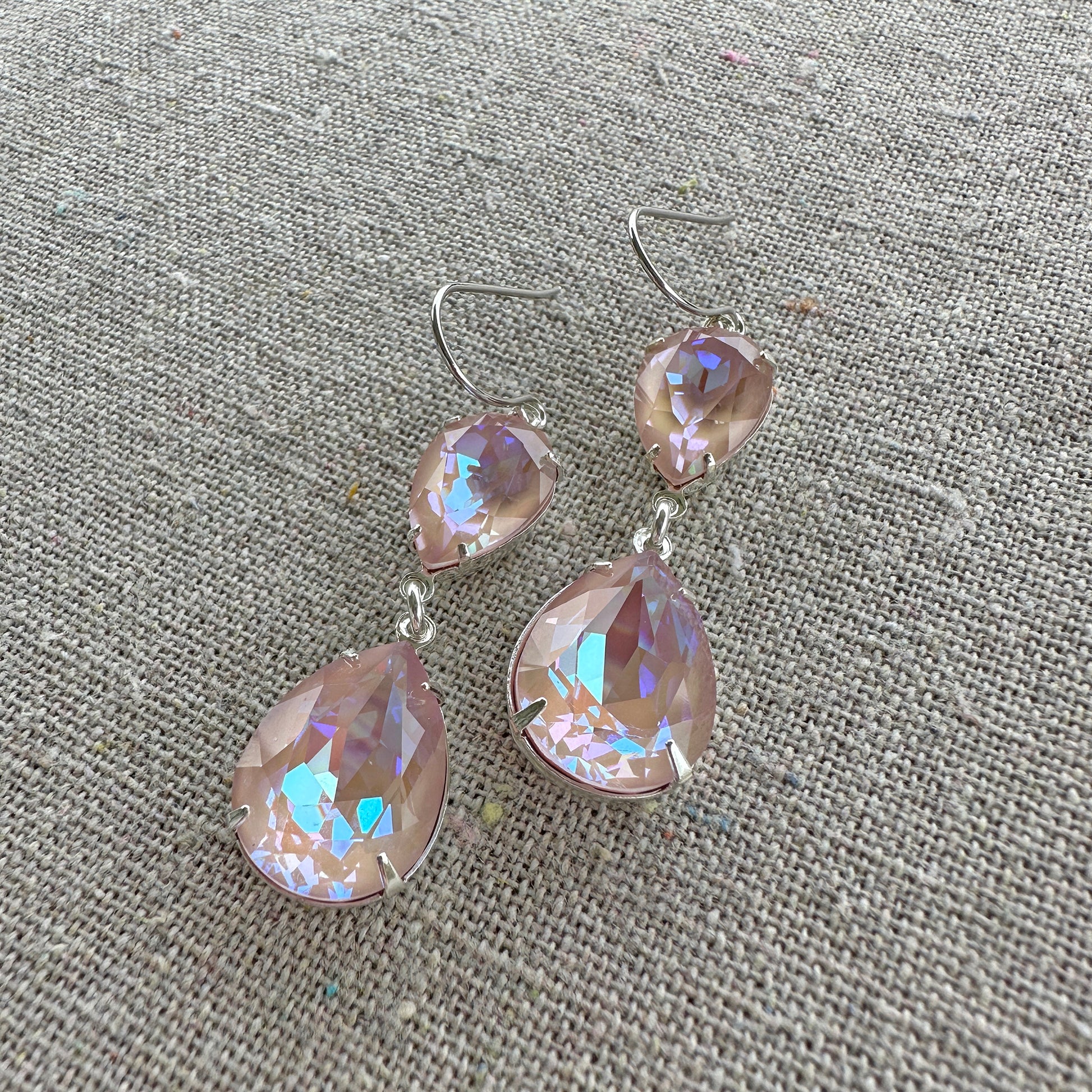 Extra fancy dangling earrings featuring Swarovski® crystal pears. Just the right amount of movement and sparkle, these earrings are perfect for making a statement. Shown in Dusty Pink DeLite & silver finish. You'll choose each crystal color separately, for a totally customizable look.